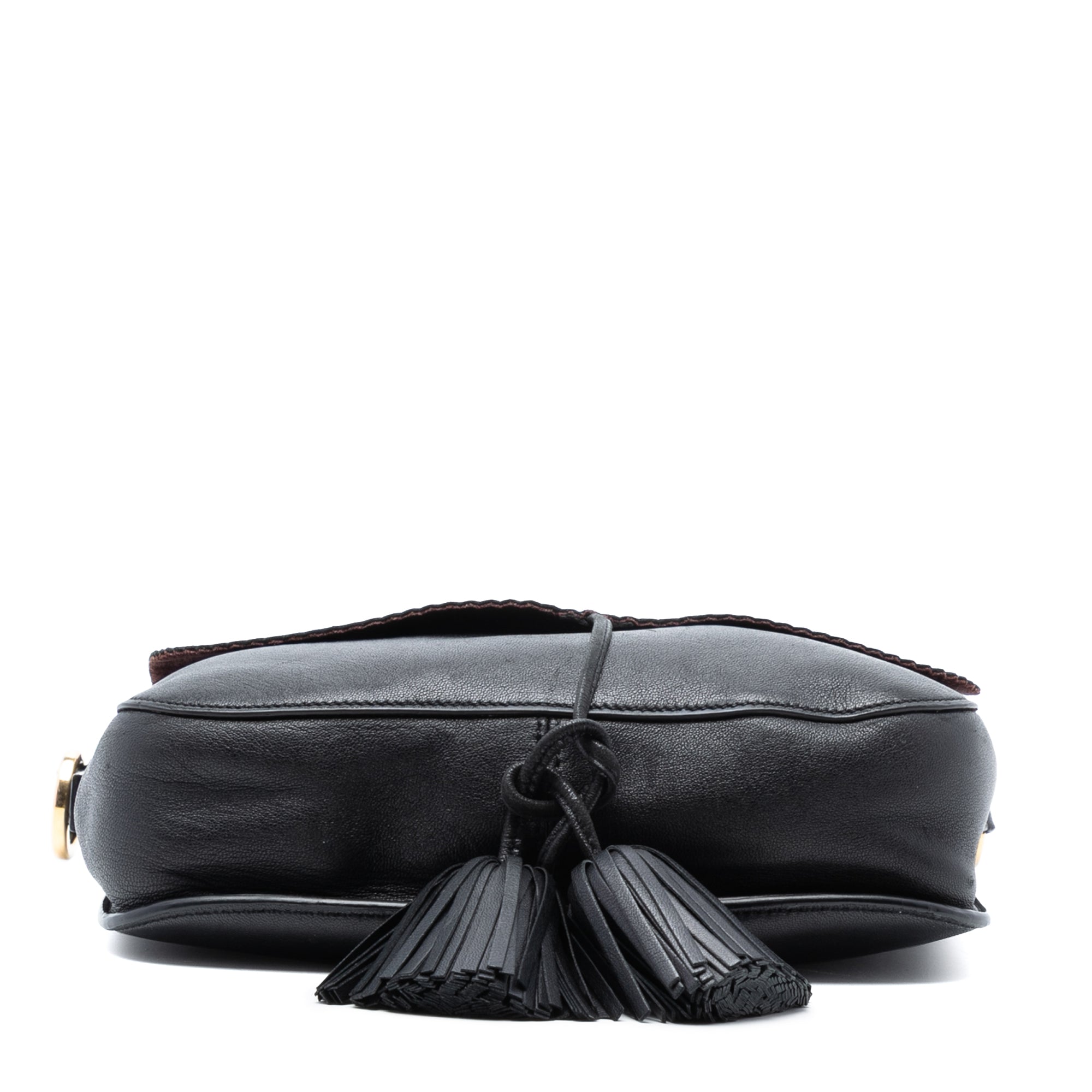 This crossbody bag features a leather body, a flat leather shoulder strap, a front flap with a snap button closure, a tassel detail, and an interior slip pocket. Retail Price: 800.00