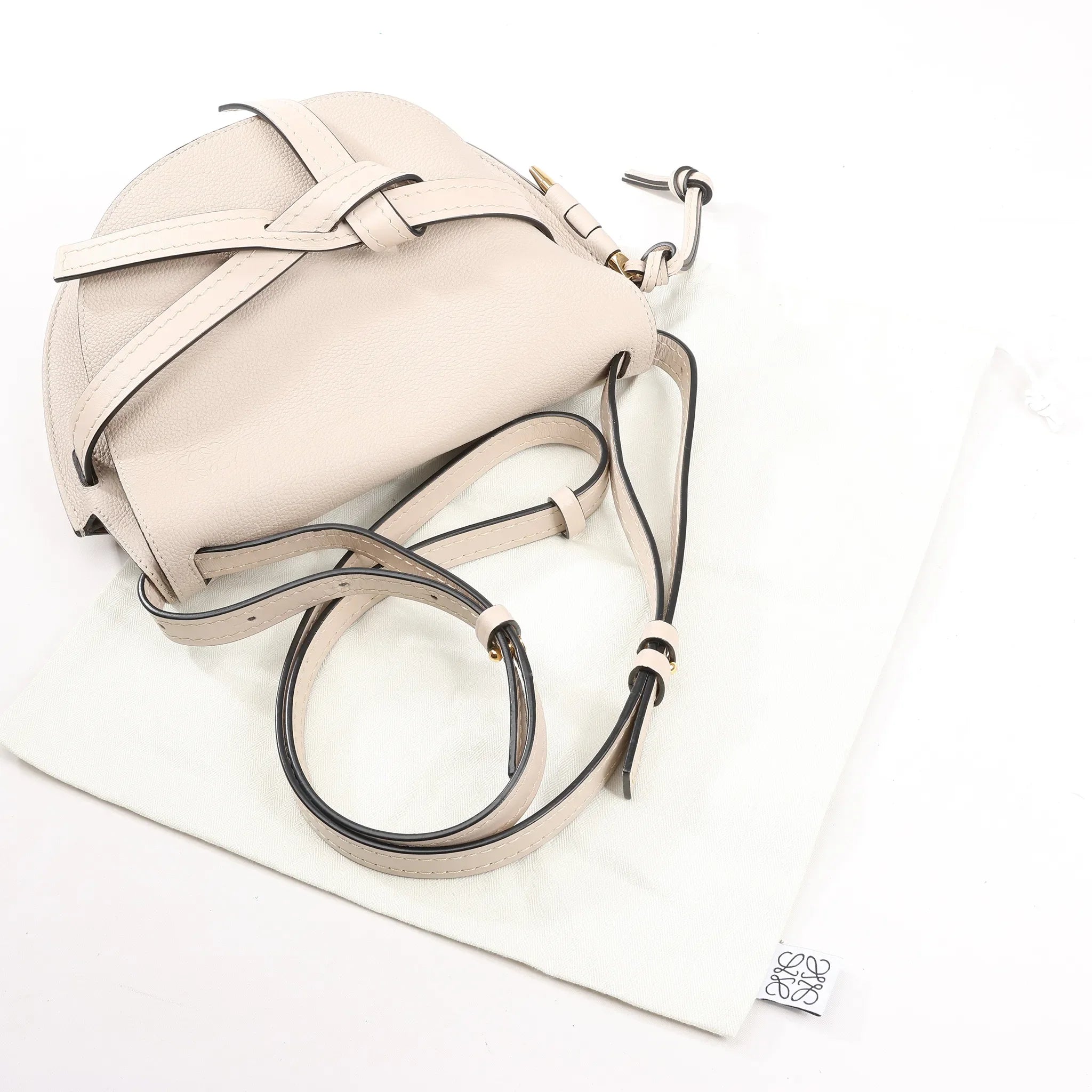 The LOEWE Gate Mini Crossbody in beige soft-grain leather features the iconic knotted front strap and curved flap design—blending artisanal craftsmanship with understated elegance.