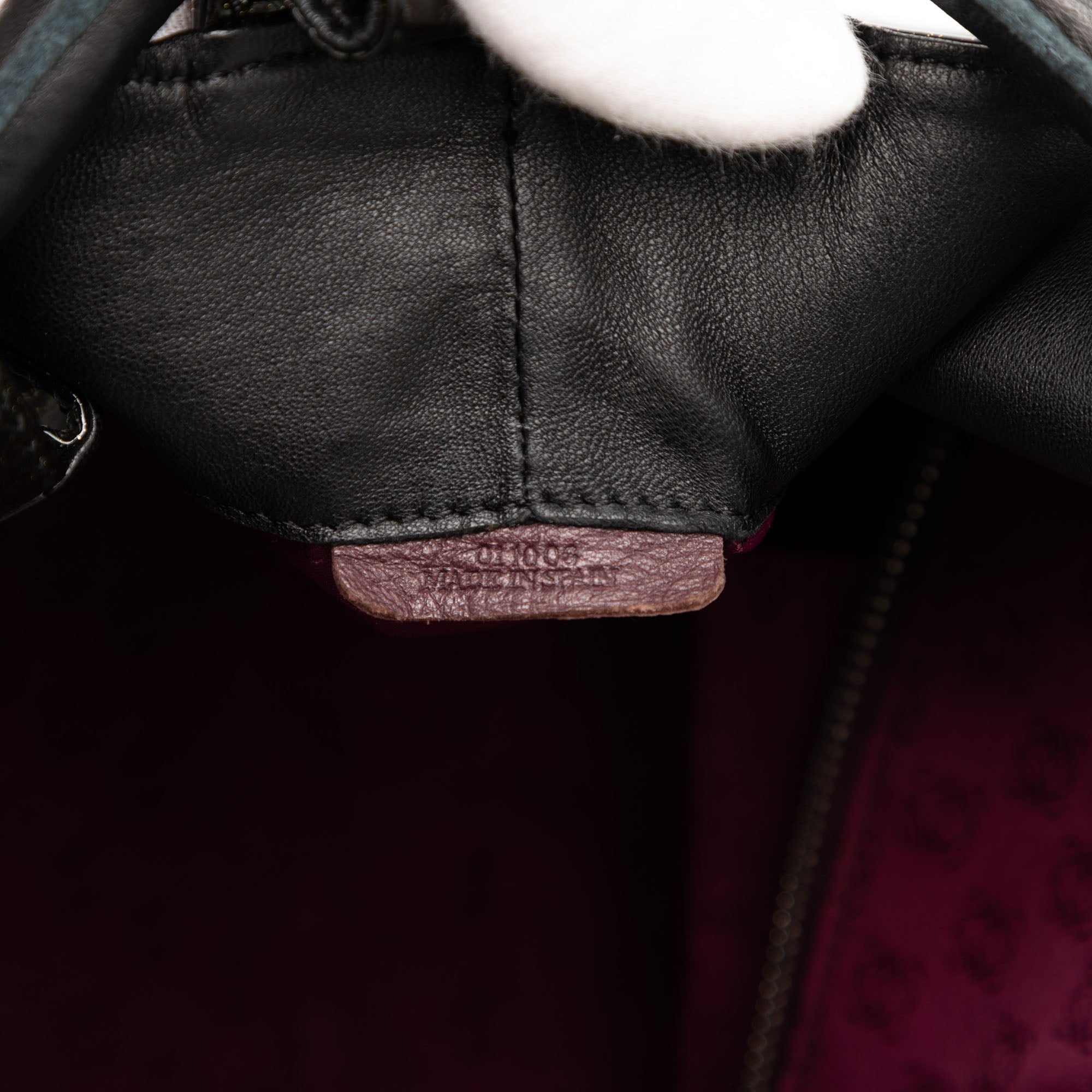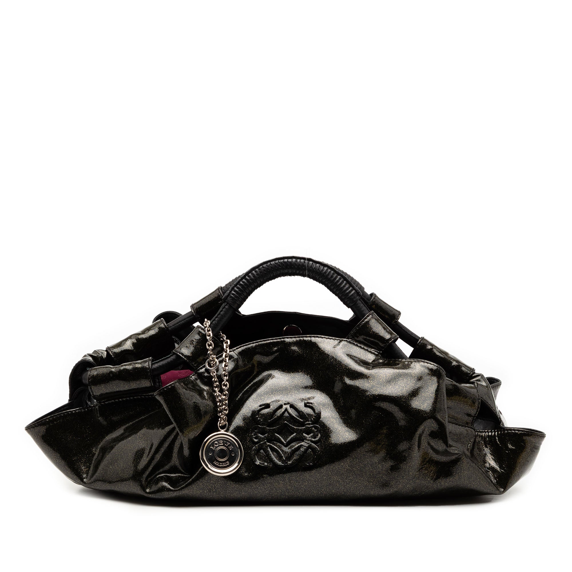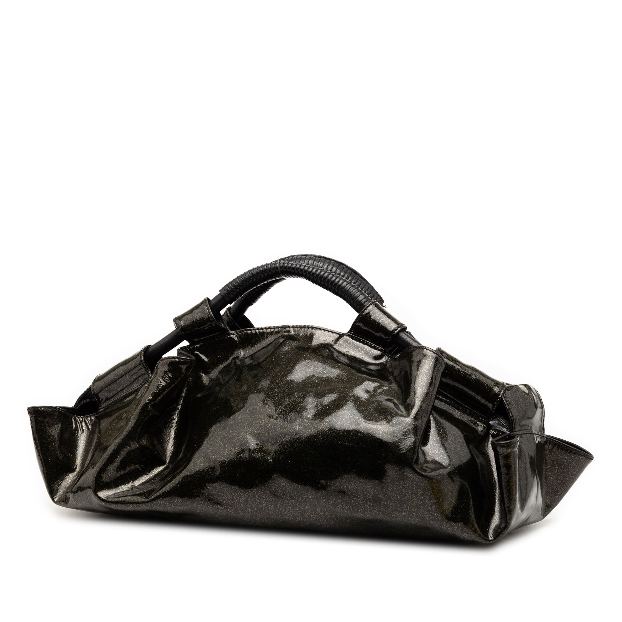 The Aire features a patent leather body, rolled leather handles, an open top with magnetic snap closure, and an interior zip pocket. Retail Price: 367.00