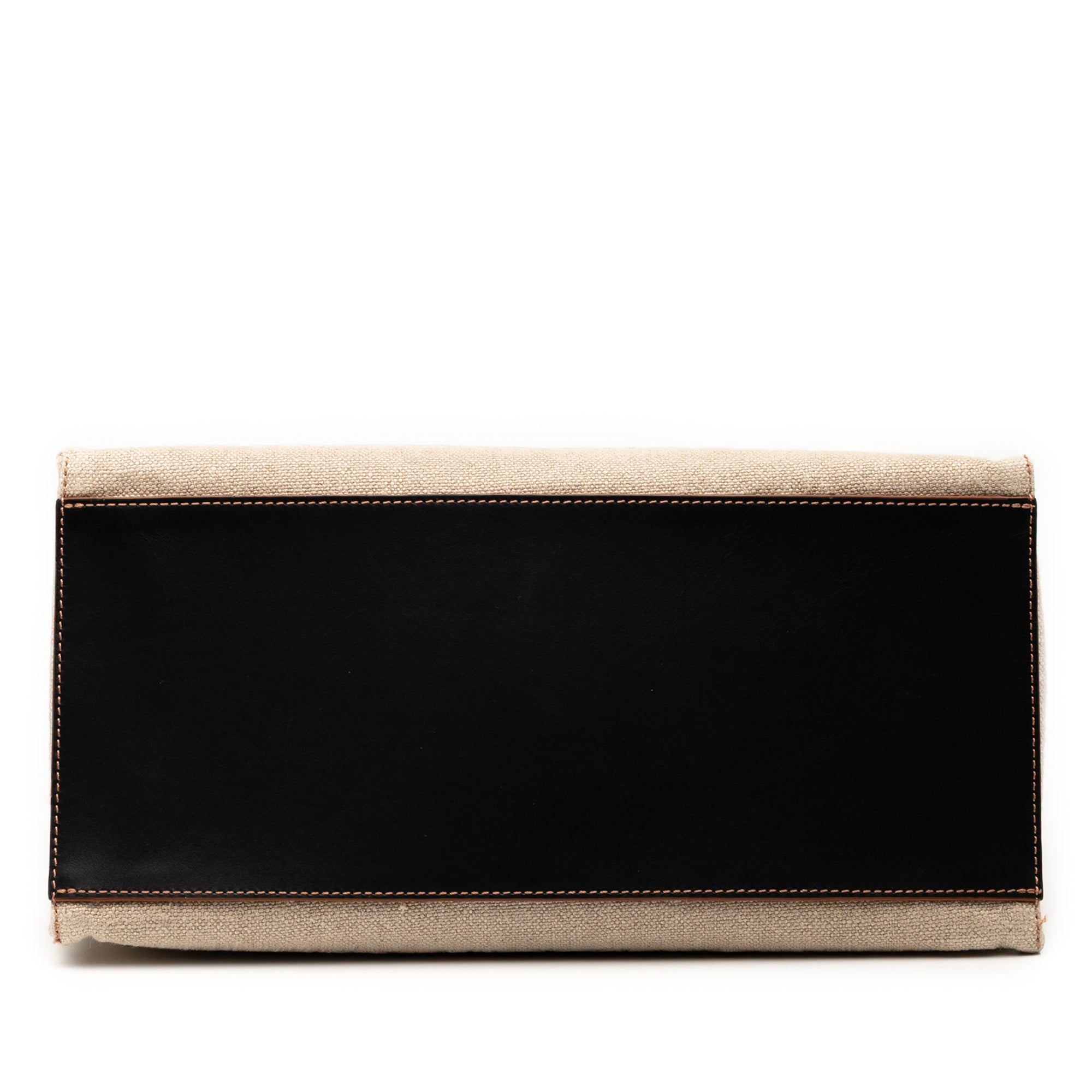 This tote bag features a canvas body with leather trim, flat leather straps, an open top with leather tie closure, and interior slip pockets. Retail Price: 1850.00