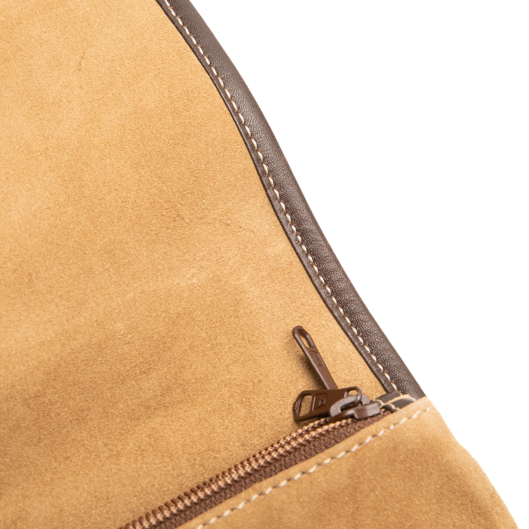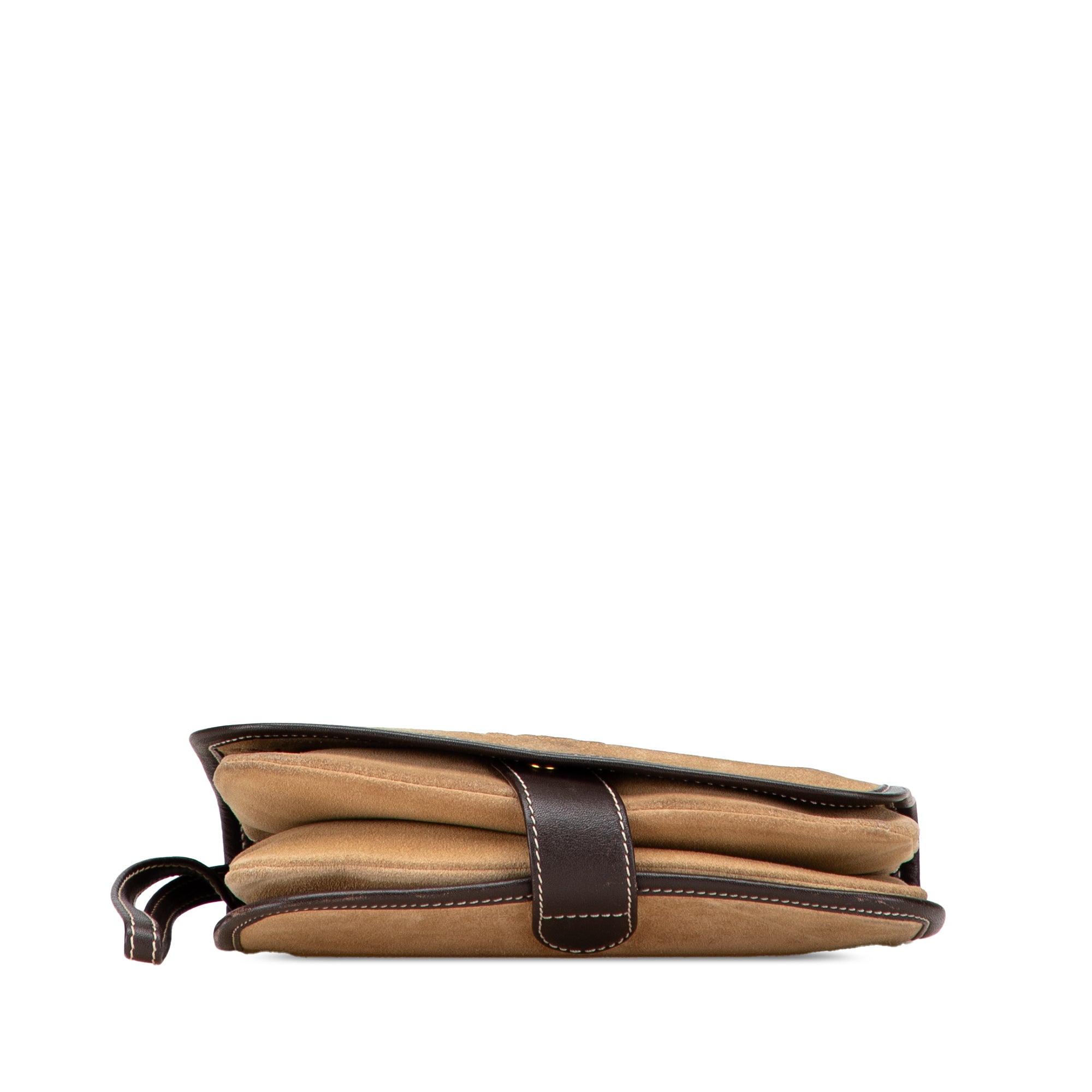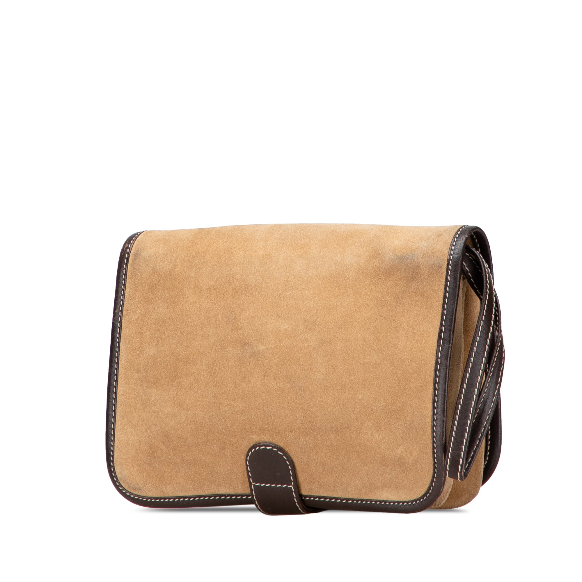 This clutch features a suede body, a flat leather wrist strap, a front flap with snap closure, double zip compartment and an interior slip pocket. Retail Price: 450.00