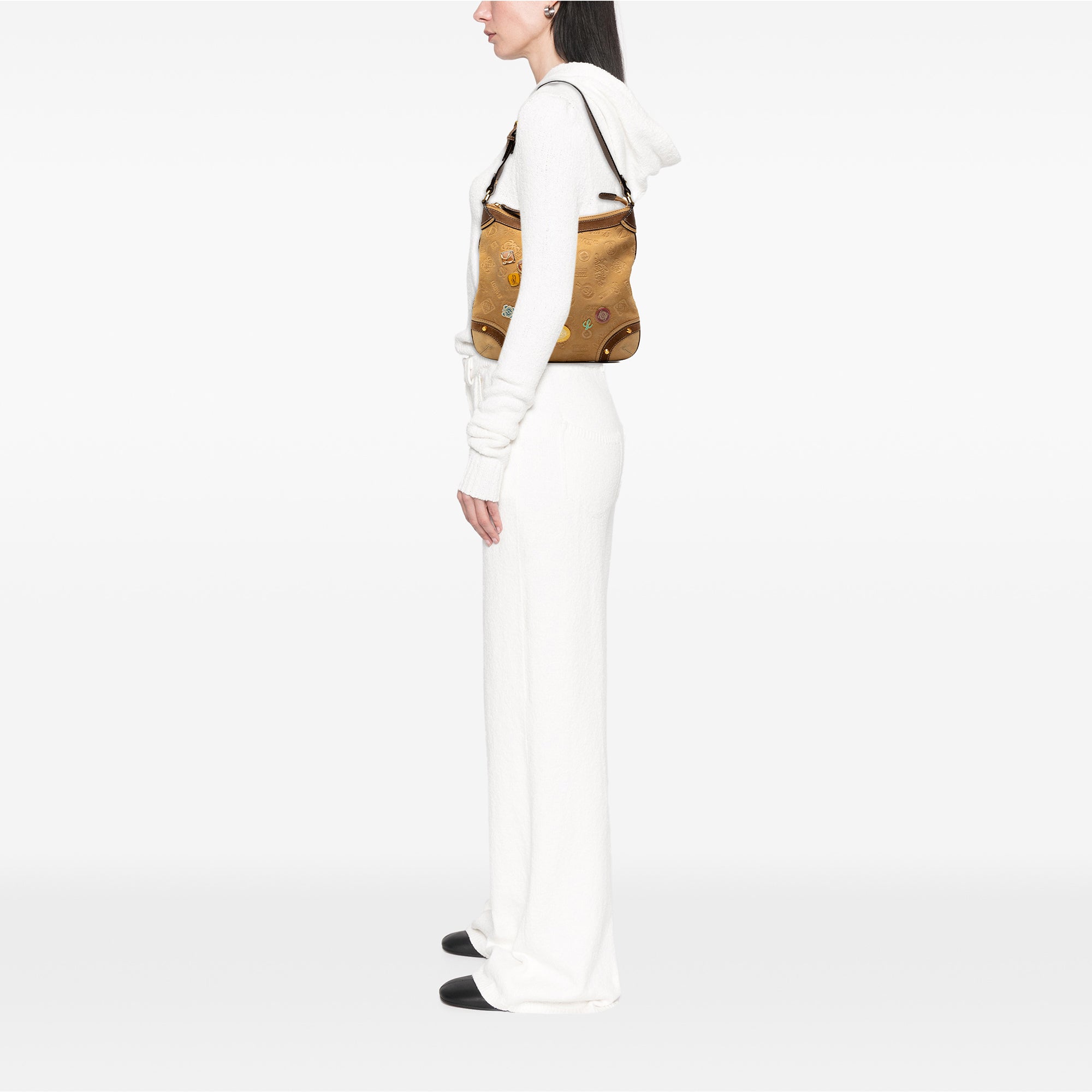 The Fiel A La Piel features a suede body with embossed logo, an adjustable leather shoulder strap, a top zip closure, and an interior zip pocket. Inclusion: Dust bag. Retail Price: 710.00