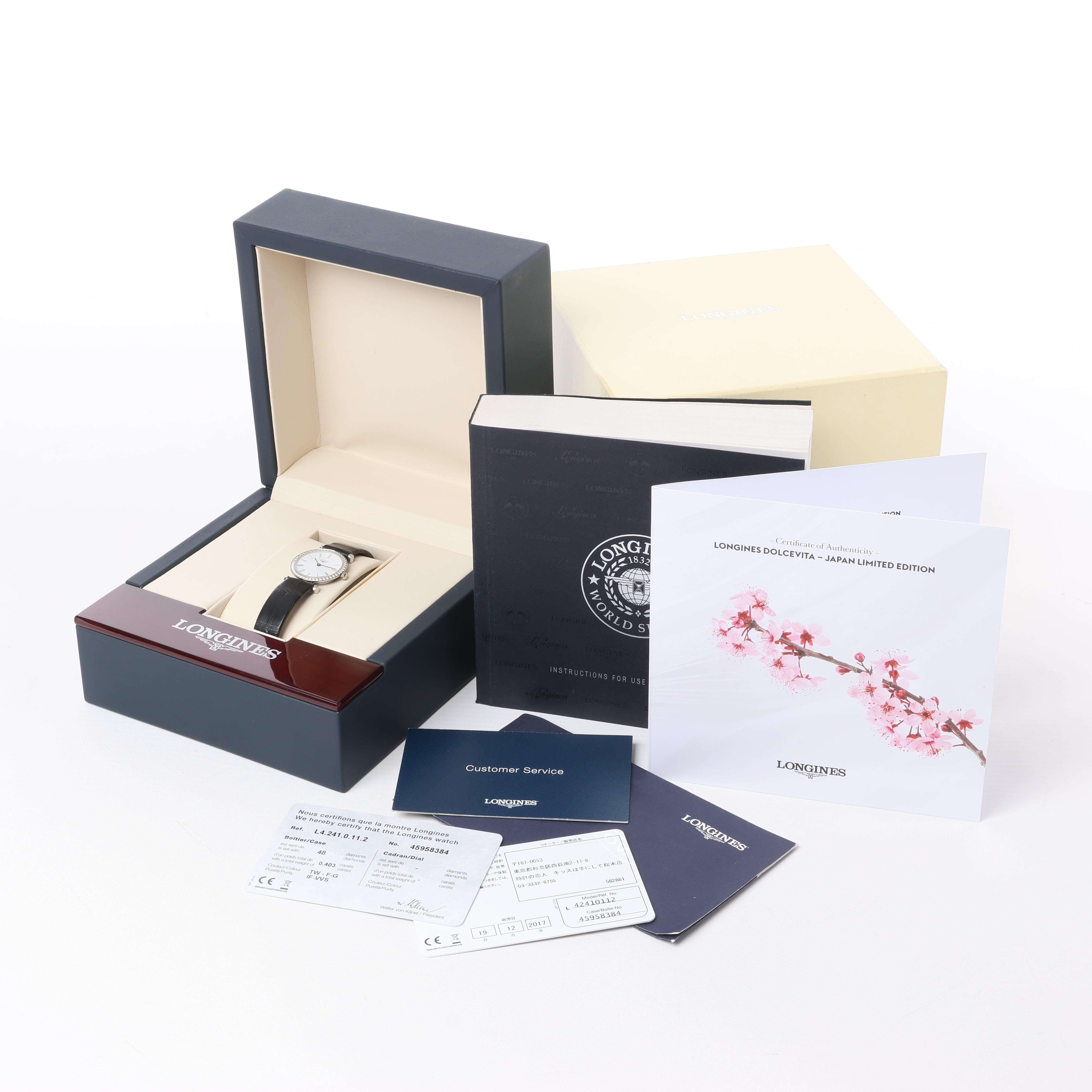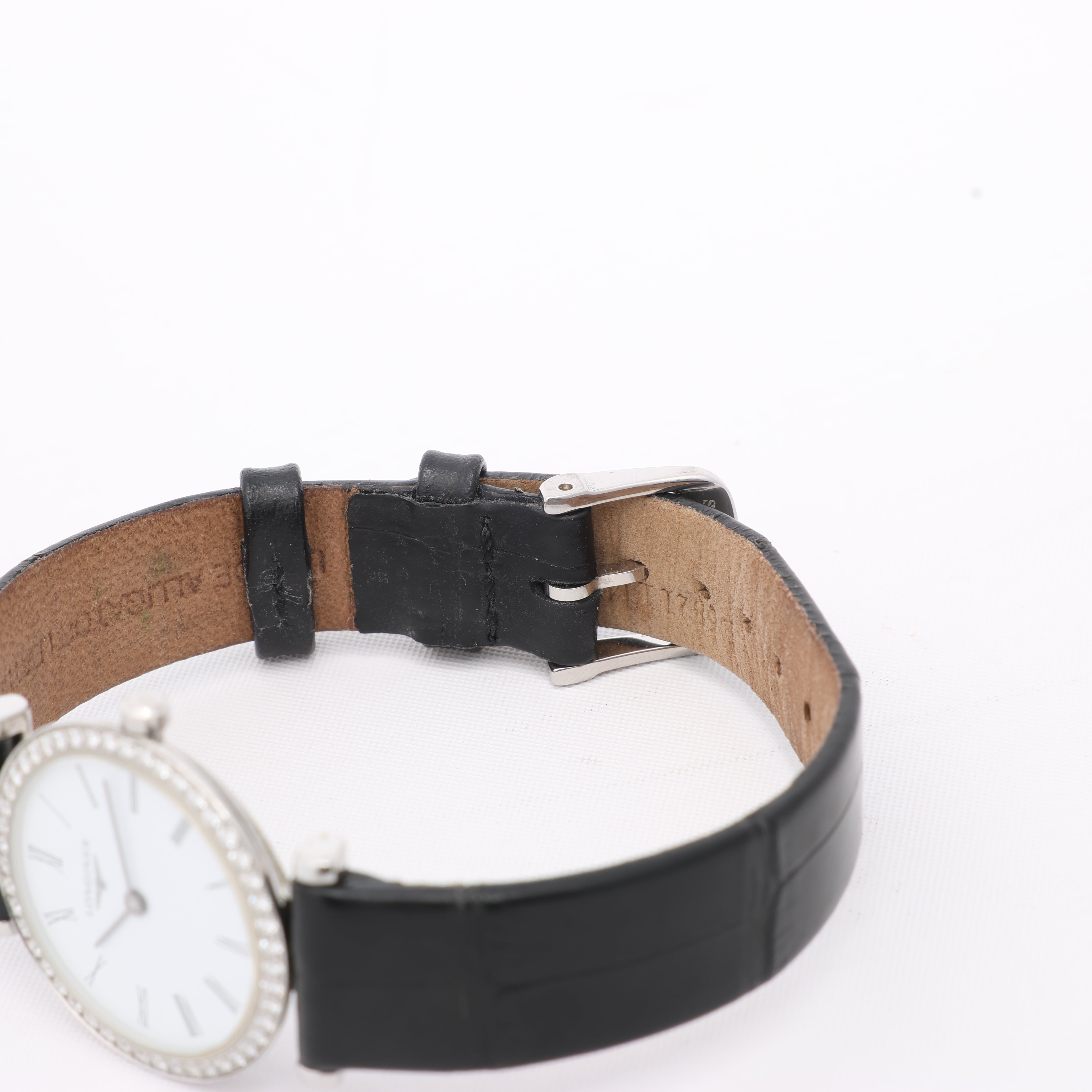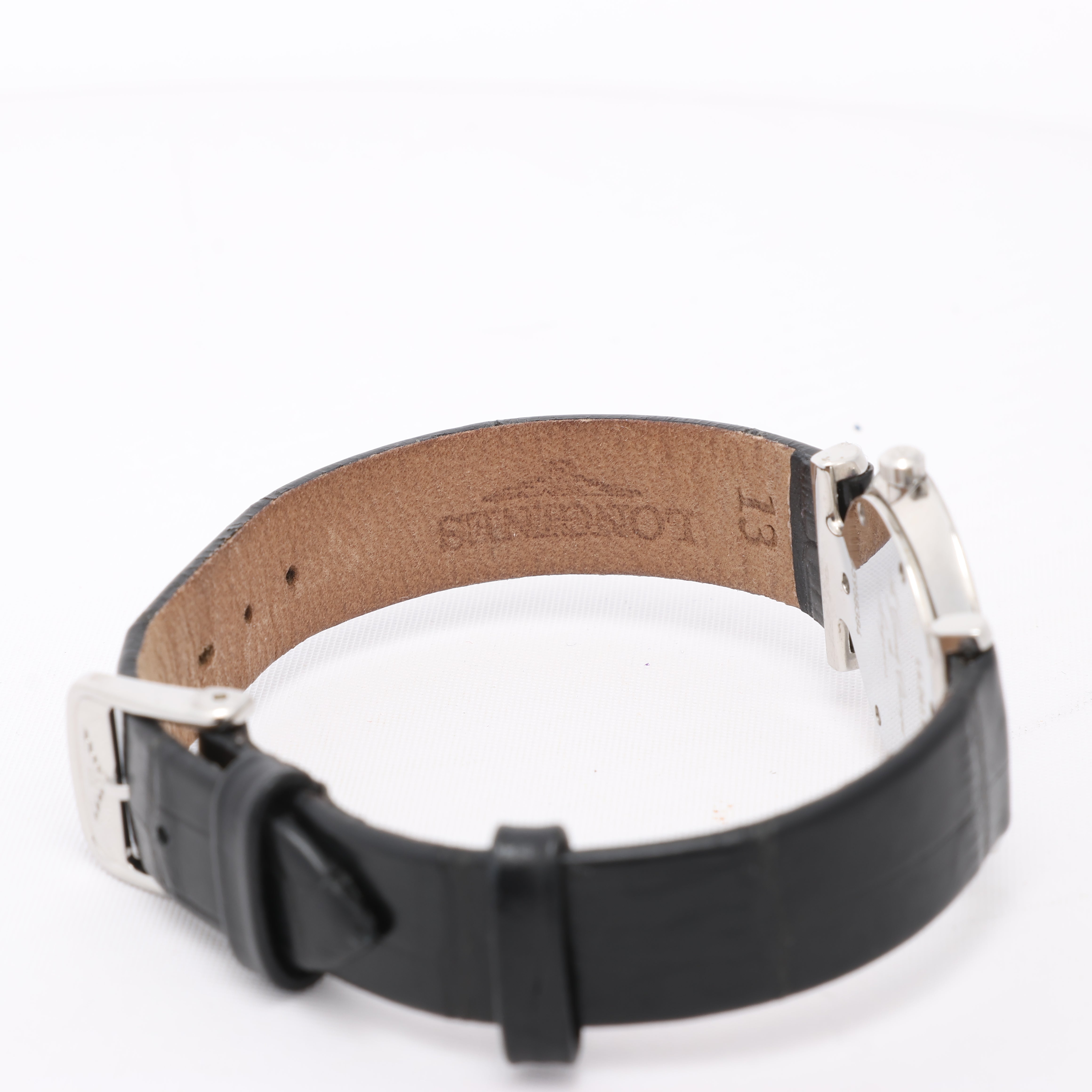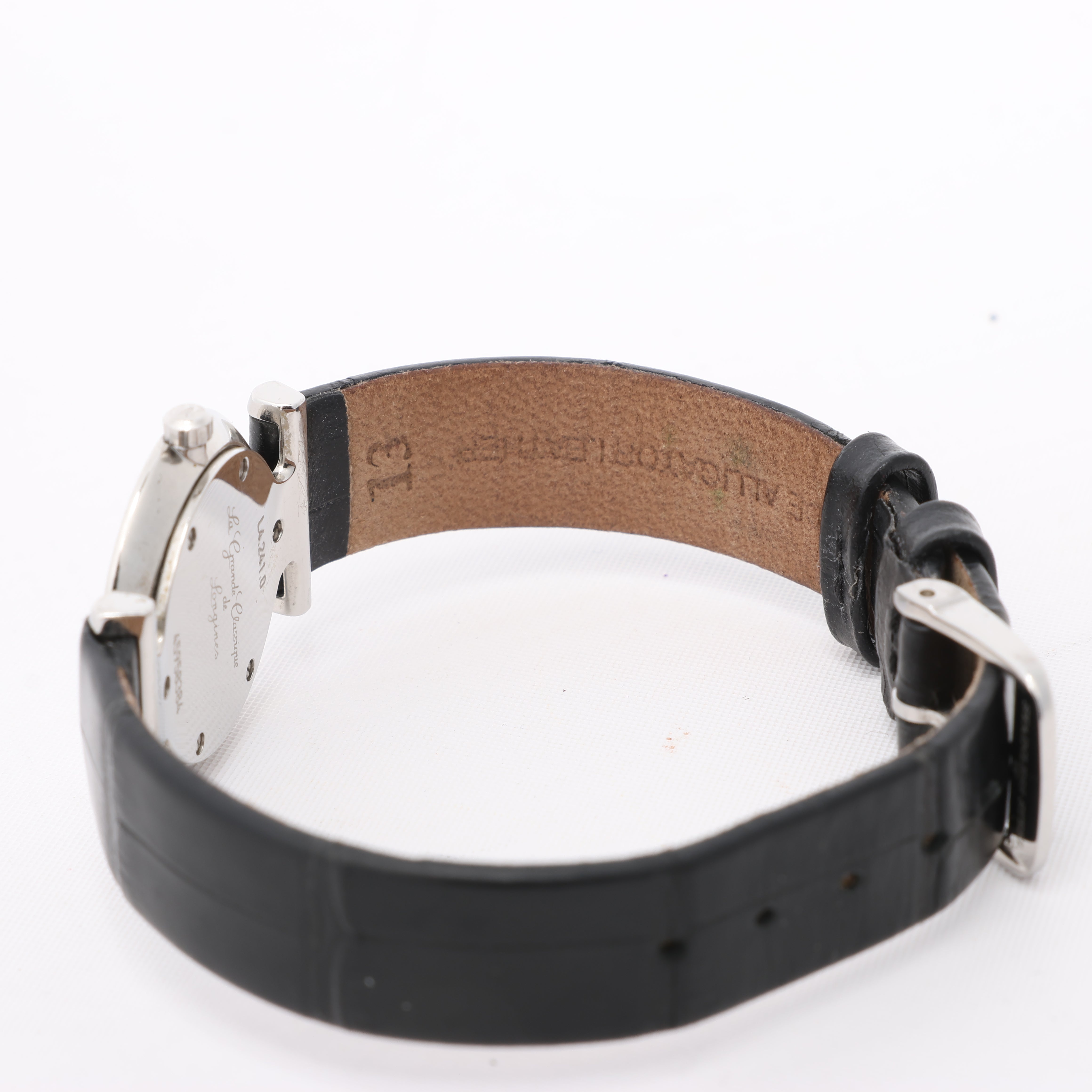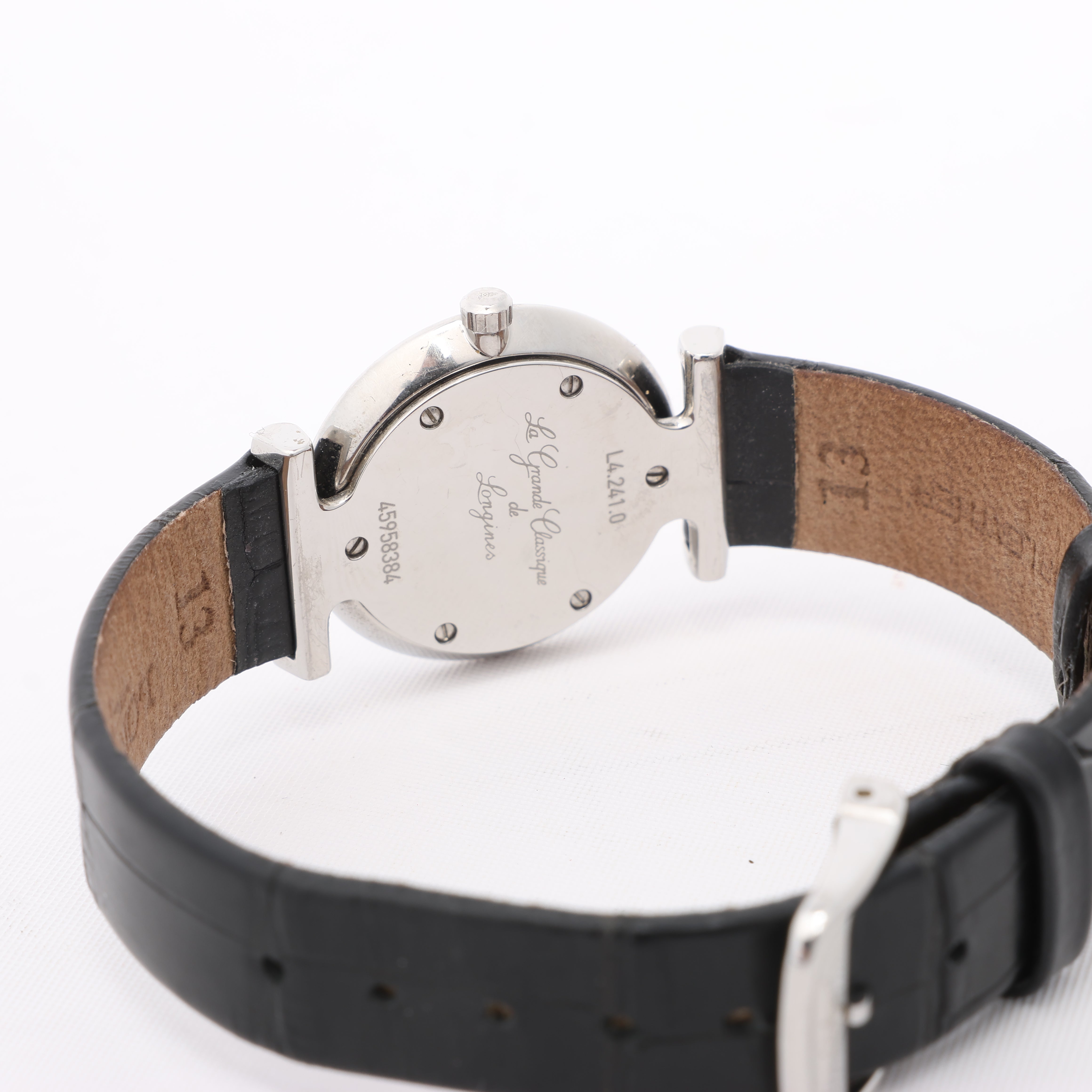 Brand: LonginesModel: Grand ClassicReference: L4.241.0Condition: Excellent Condition Details: In great condition with minor scratches and creases on leather strap. Has just been serviced and checked.Dial Colour: White Case Material: Stainless steel Starp Colour: BlackStrap material: LeatherMovement: QuartzFace Diameter: 24 mm Approx. circumference: 16 cmComes With: Box, Papers, Booklet, Certificate