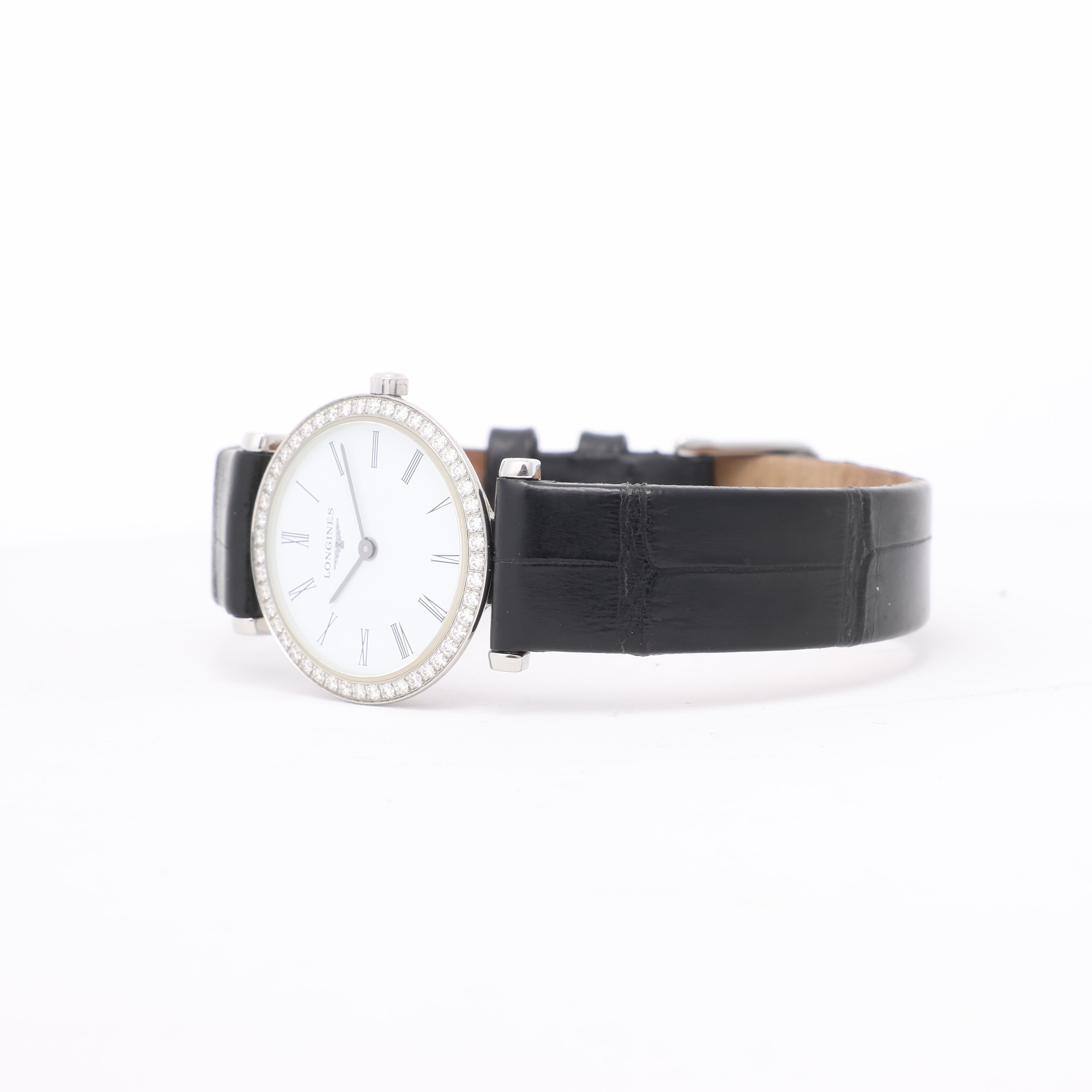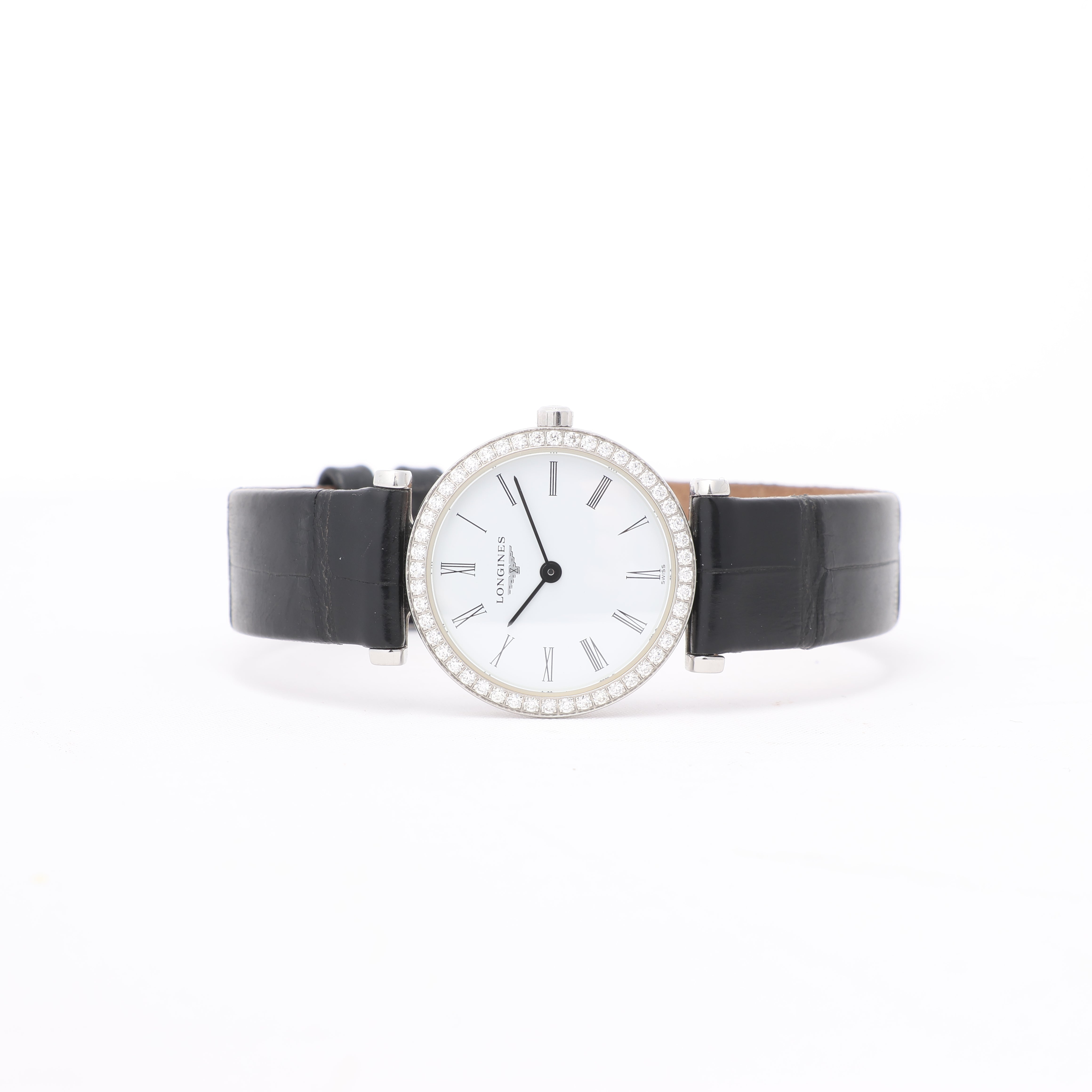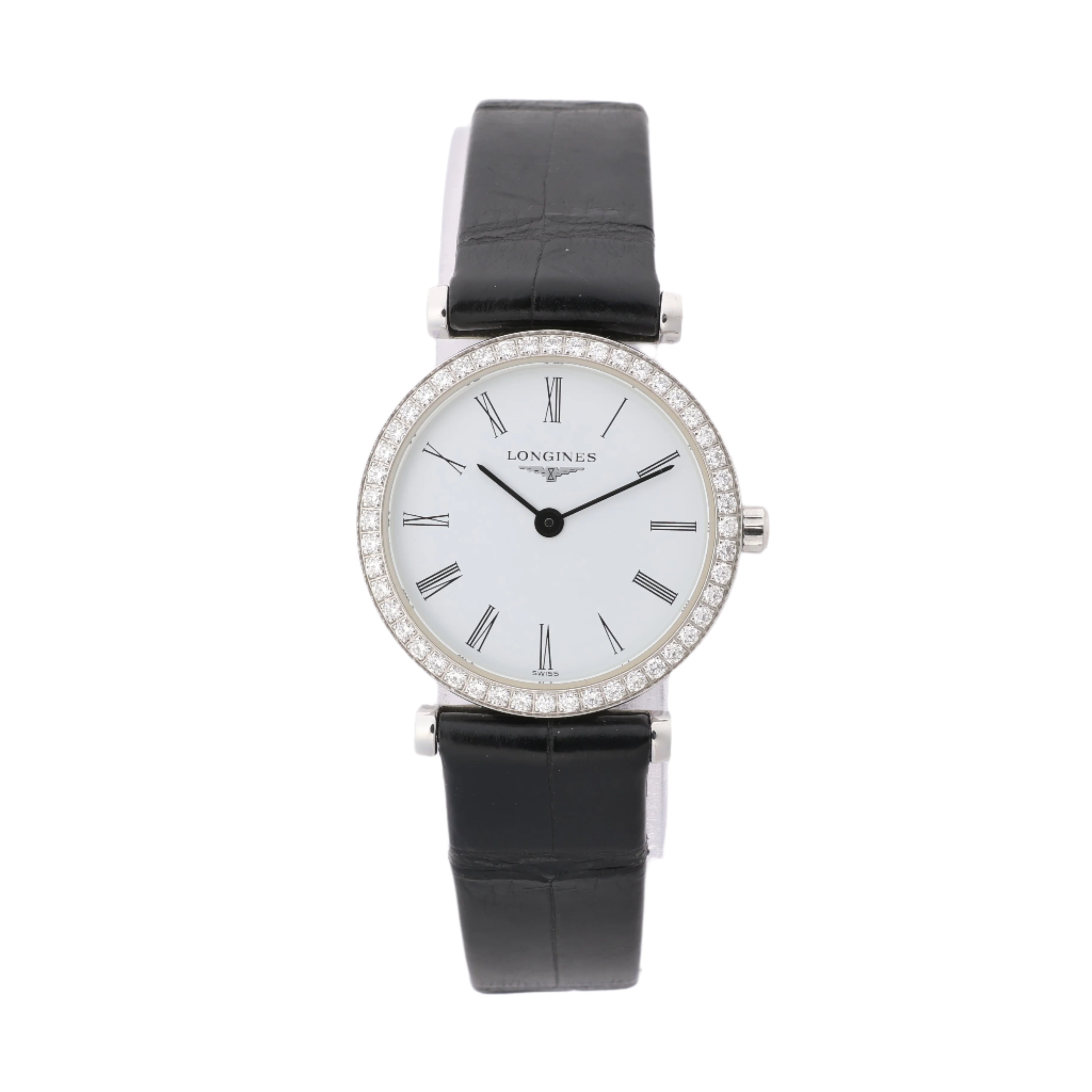 Timeless elegance defines this Longines Grand Classic L4.241.0. Featuring a white dial with Roman numerals, diamond bezel, and sleek black leather strap, this quartz timepiece is a refined expression of sophistication and grace.