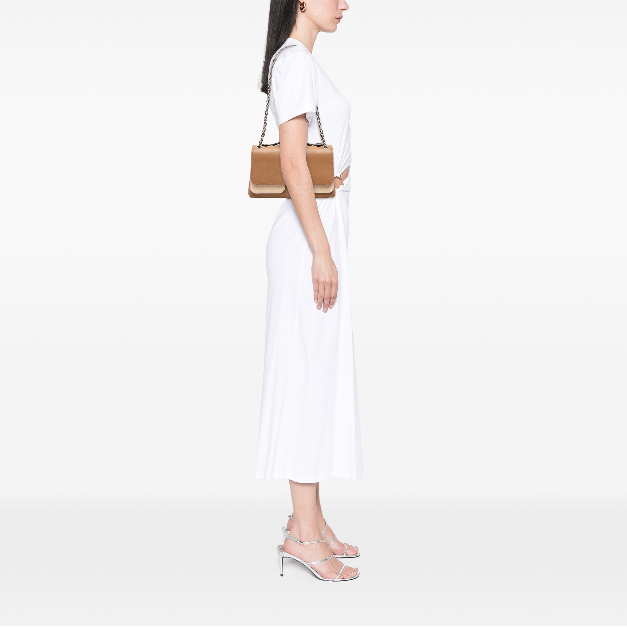 The Cuir Plume Ecume Very Chain Bag features a leather body, a leather top handle, a gold-tone chain shoulder strap, a front flap with push lock closure, exterior flap pockets, an interior compartment, and an interior slip pocket. Retail Price: 1900.00