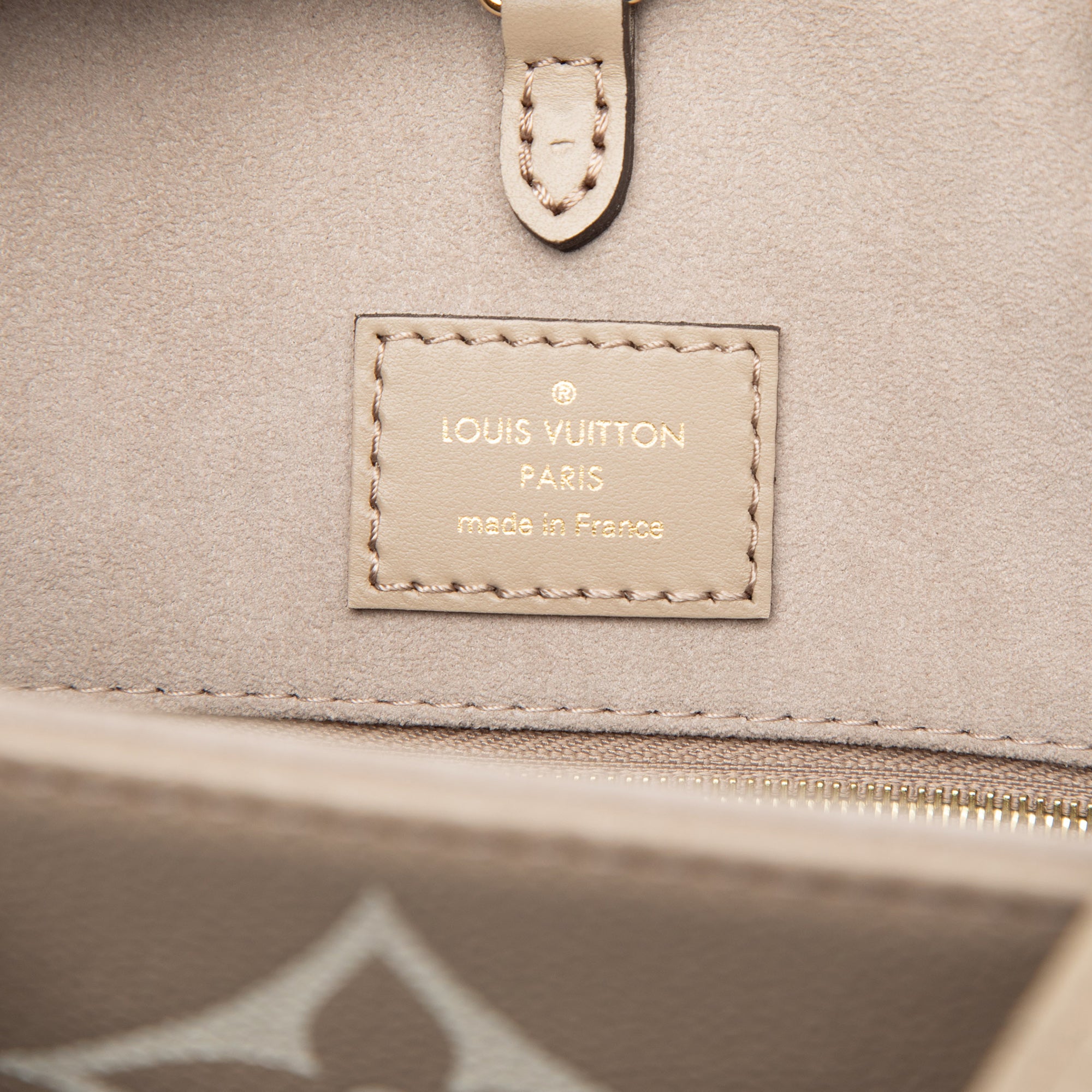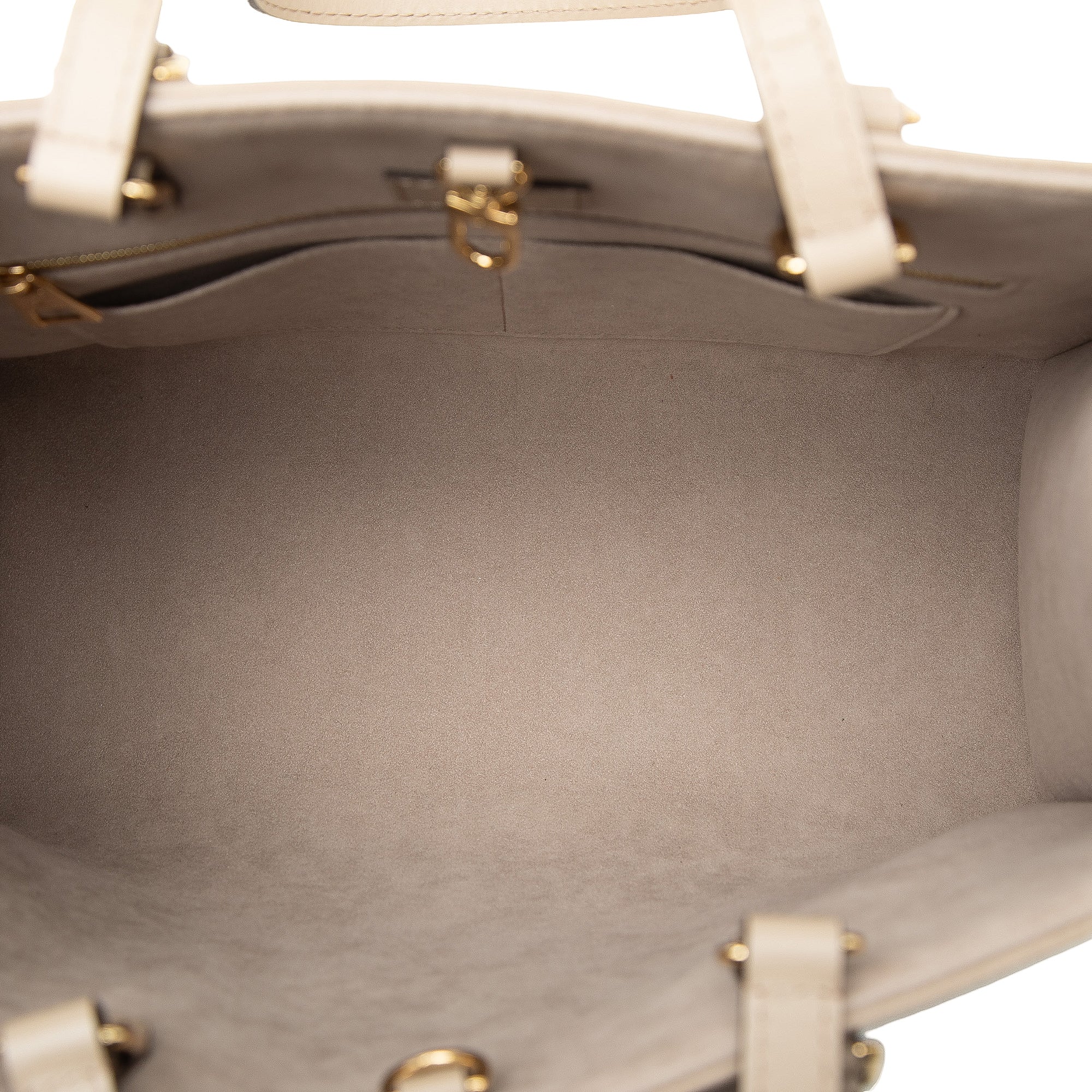 The Onthego MM features a monogram empreinte body, rolled leather handles, flat leather shoulder straps, an open top with lobster clasp closure, and interior zip and slip pockets. Retail Price: 5045.00