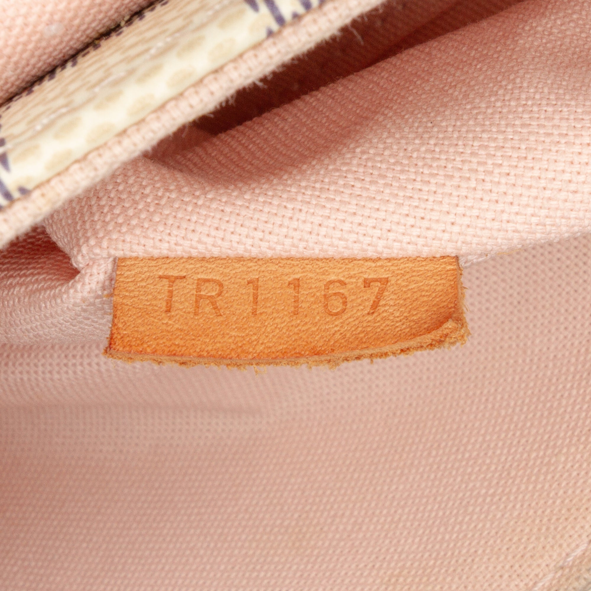 The Croisette features a damier azur canvas body with vachetta leather trim, a leather tassel detail, a flat vachetta leather top handle, a detachable flat vachetta leather strap, a front flap with a gold-tone push-lock closure, and an interior slip pocket. Retail Price: 1960.00