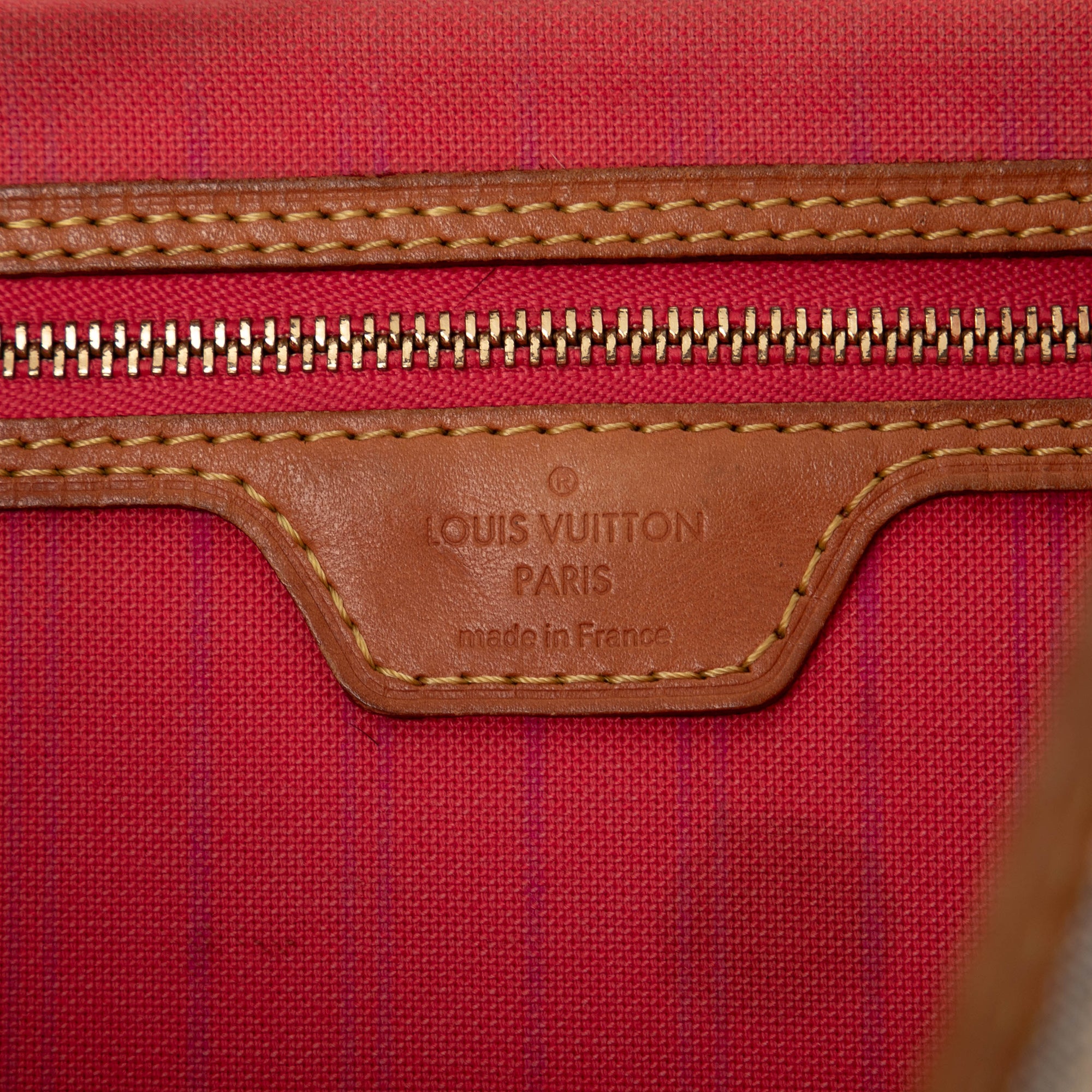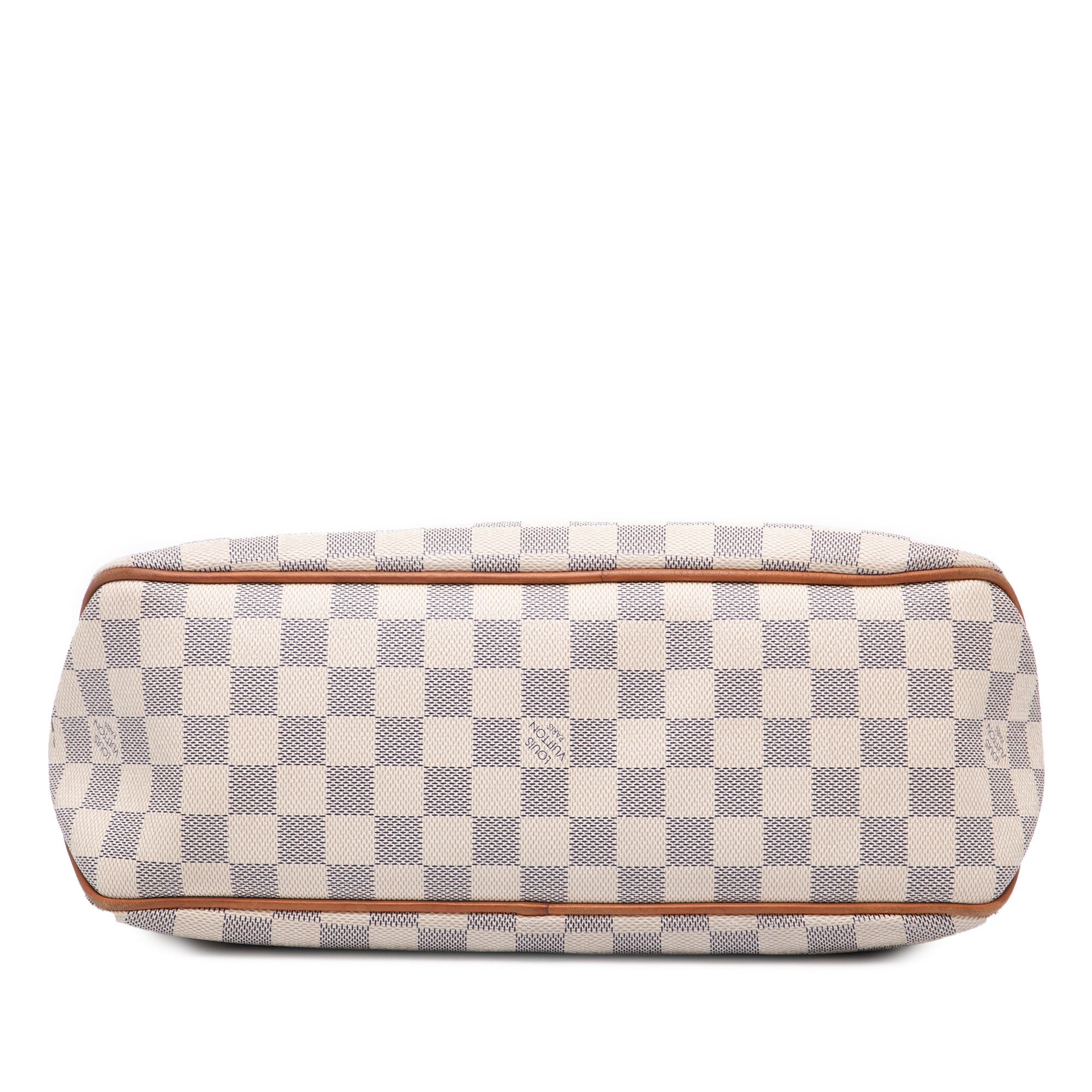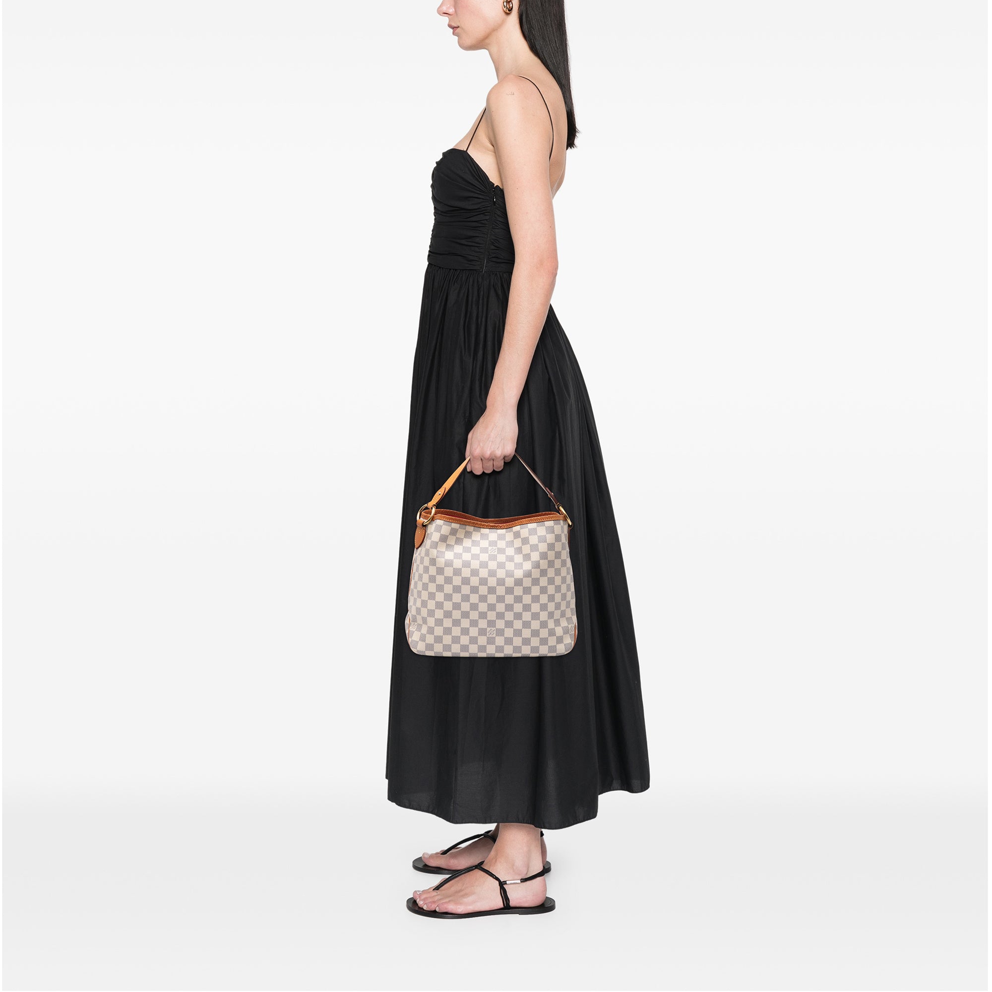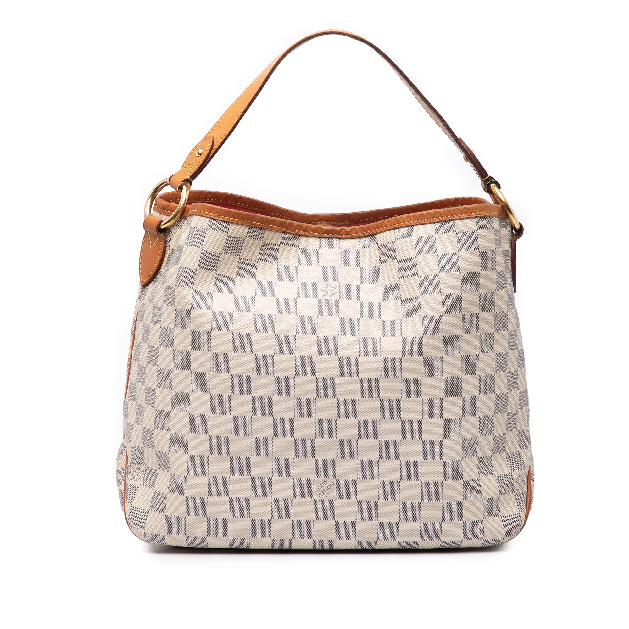 The Delightful PM features a damier azur canvas body with vachetta leather trim, a flat vachetta leather strap, an open top with lobster clasp closure, and an interior zip pocket. Retail Price: 1695.00