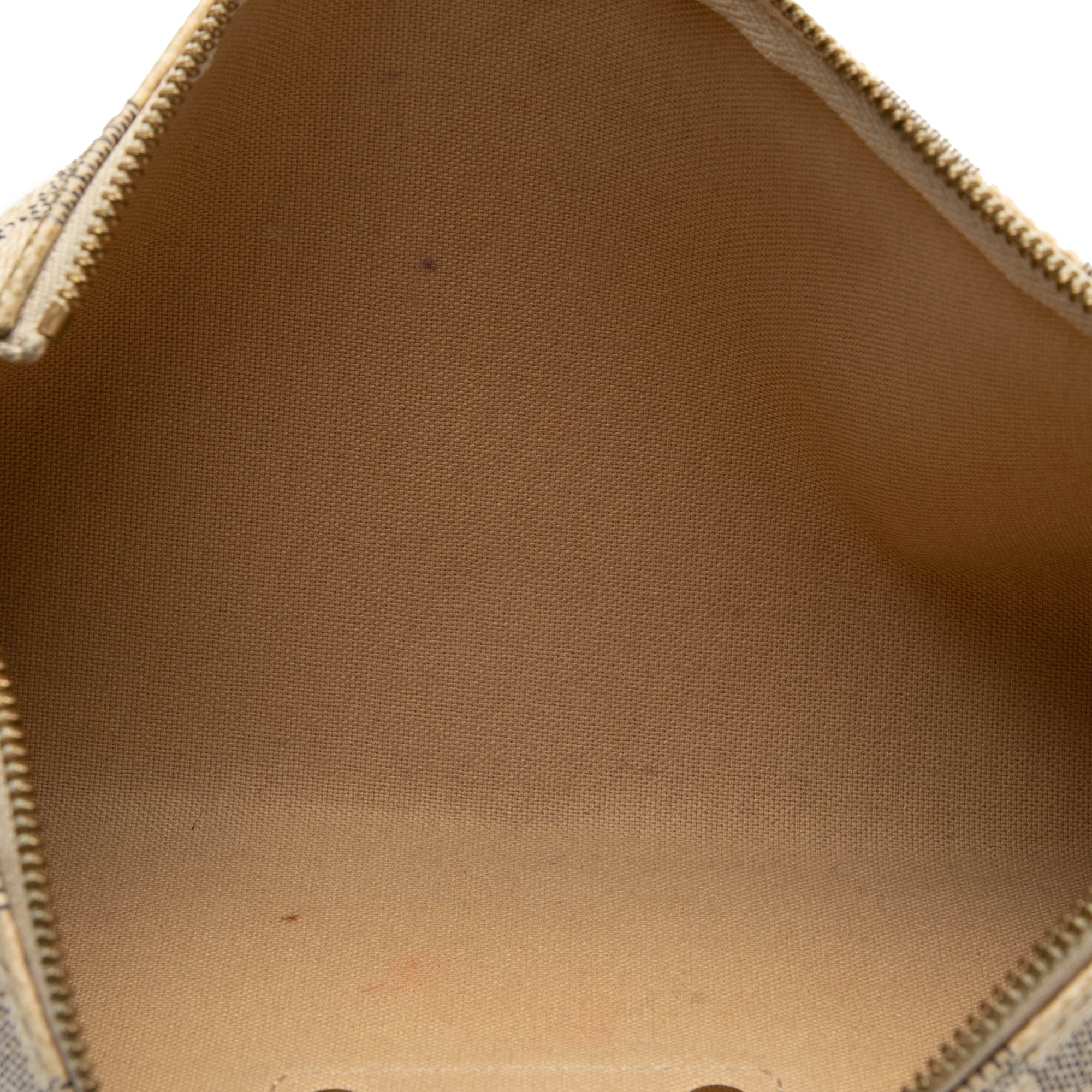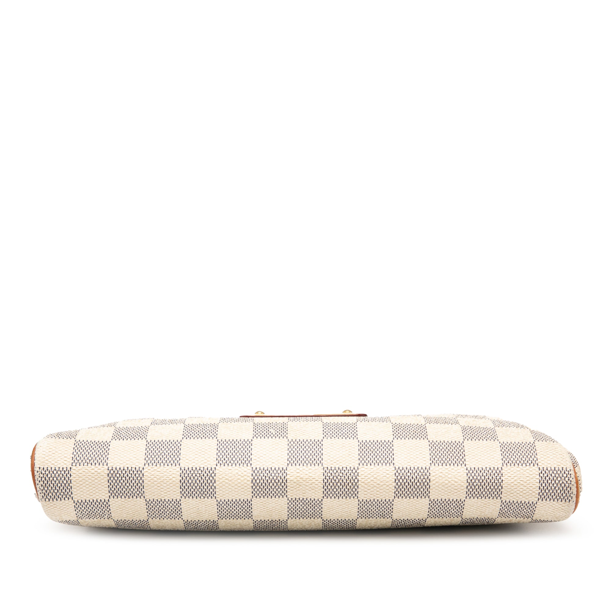 The Eva features a damier azur canvas body, a detachable gold-tone chain link handle, and a top zip closure. Retail Price: 1150.00
