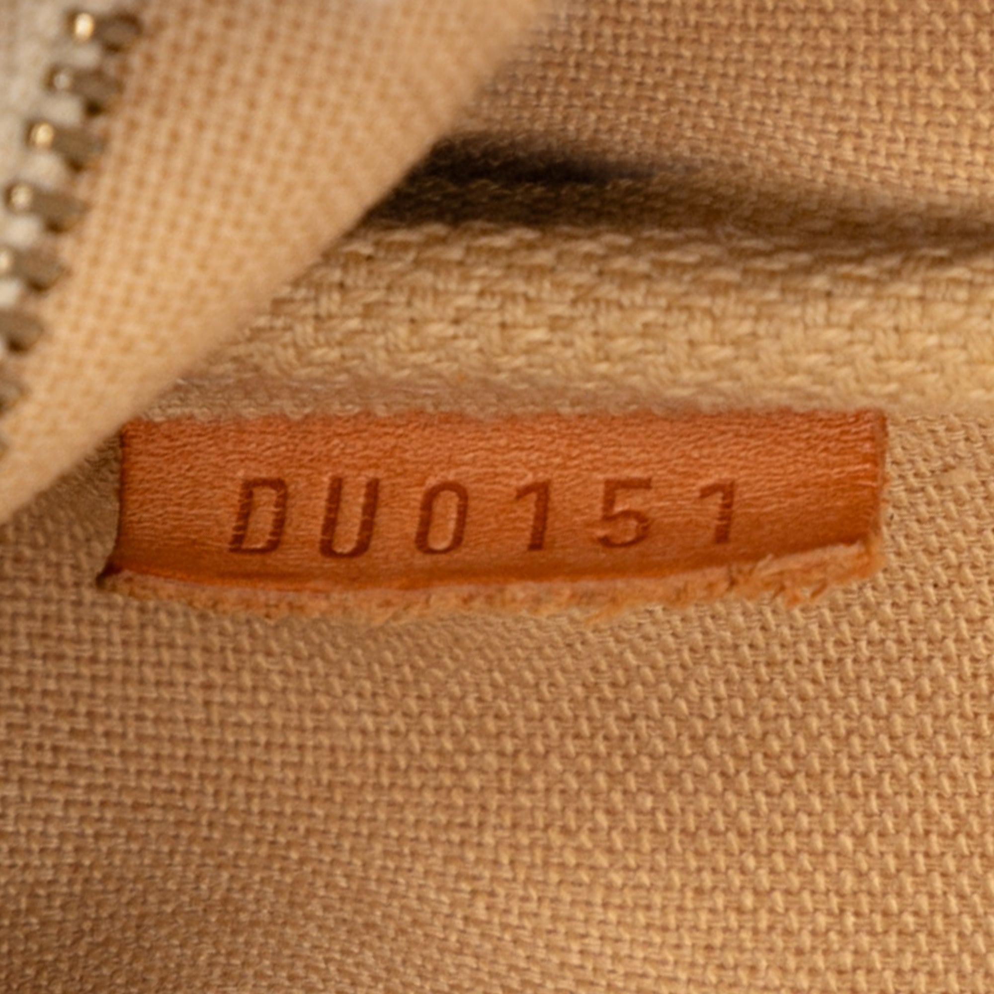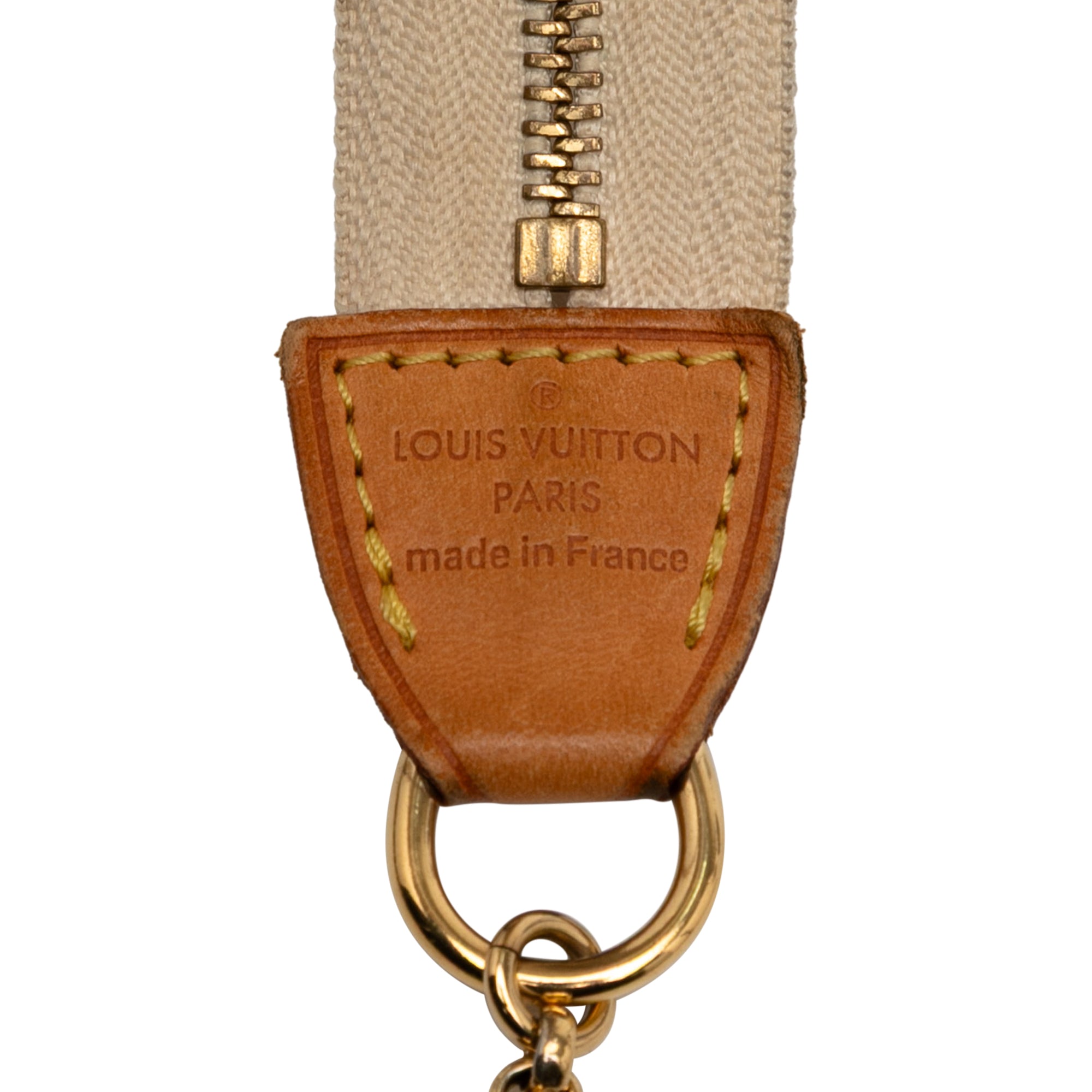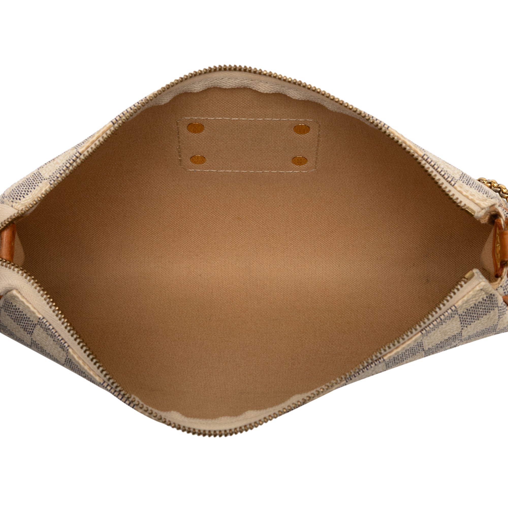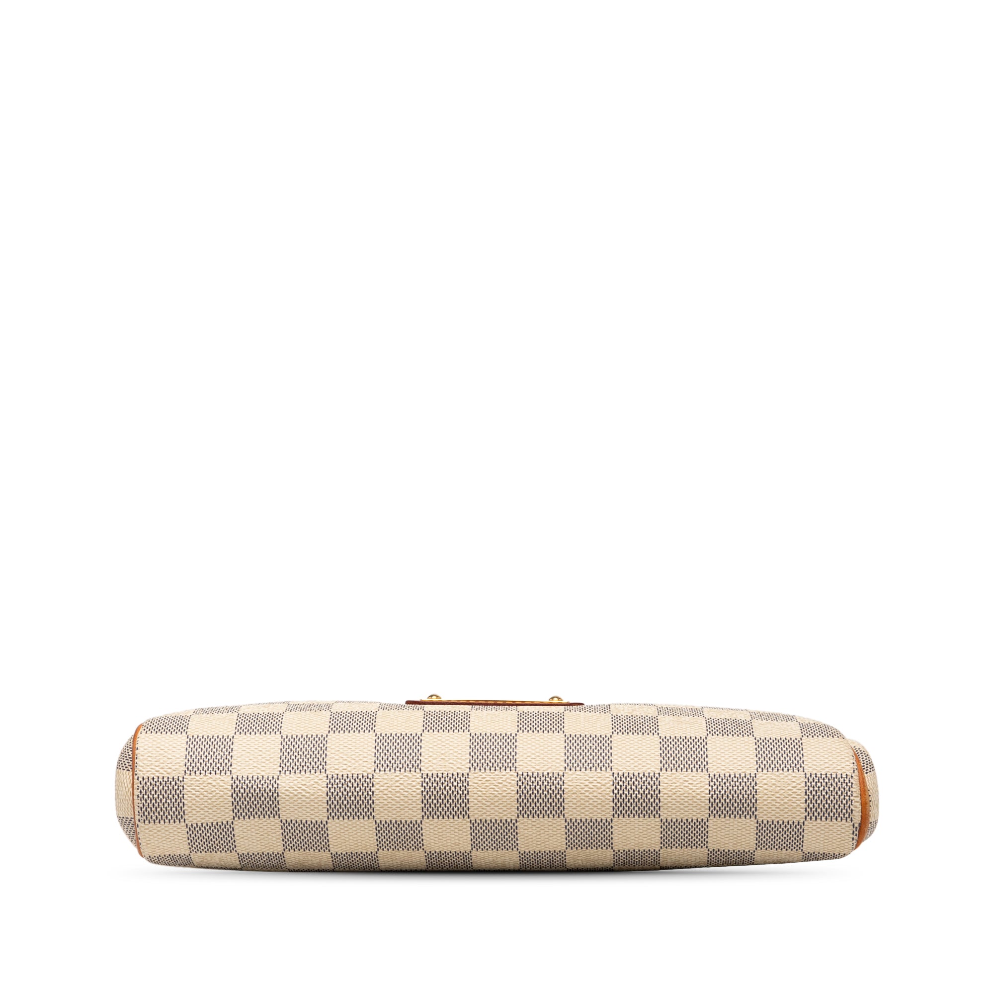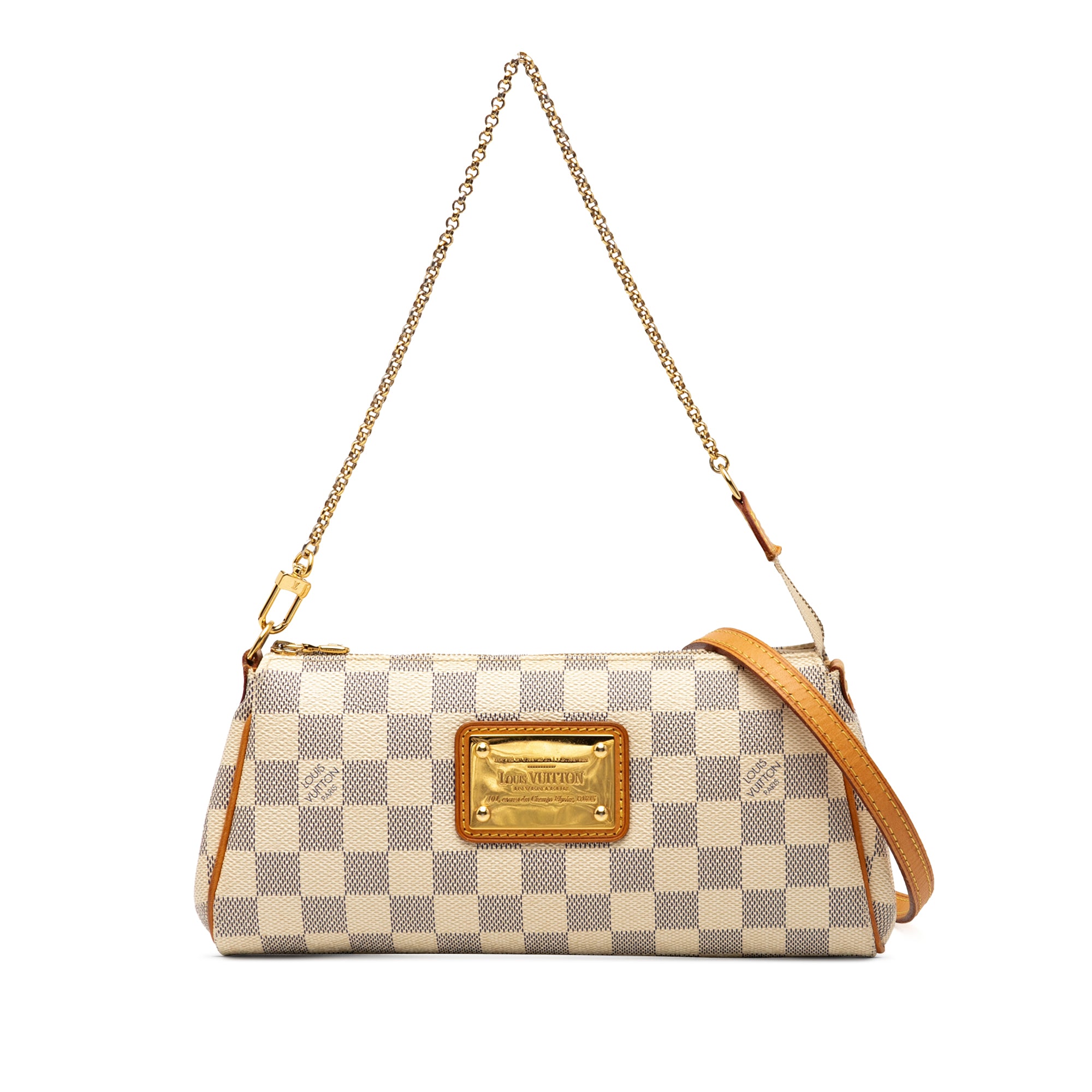 The Eva features a damier azur canvas body, a removable chain link handle, a detachable flat vachetta leather strap, and a top zip closure. Retail Price: 1150.00
