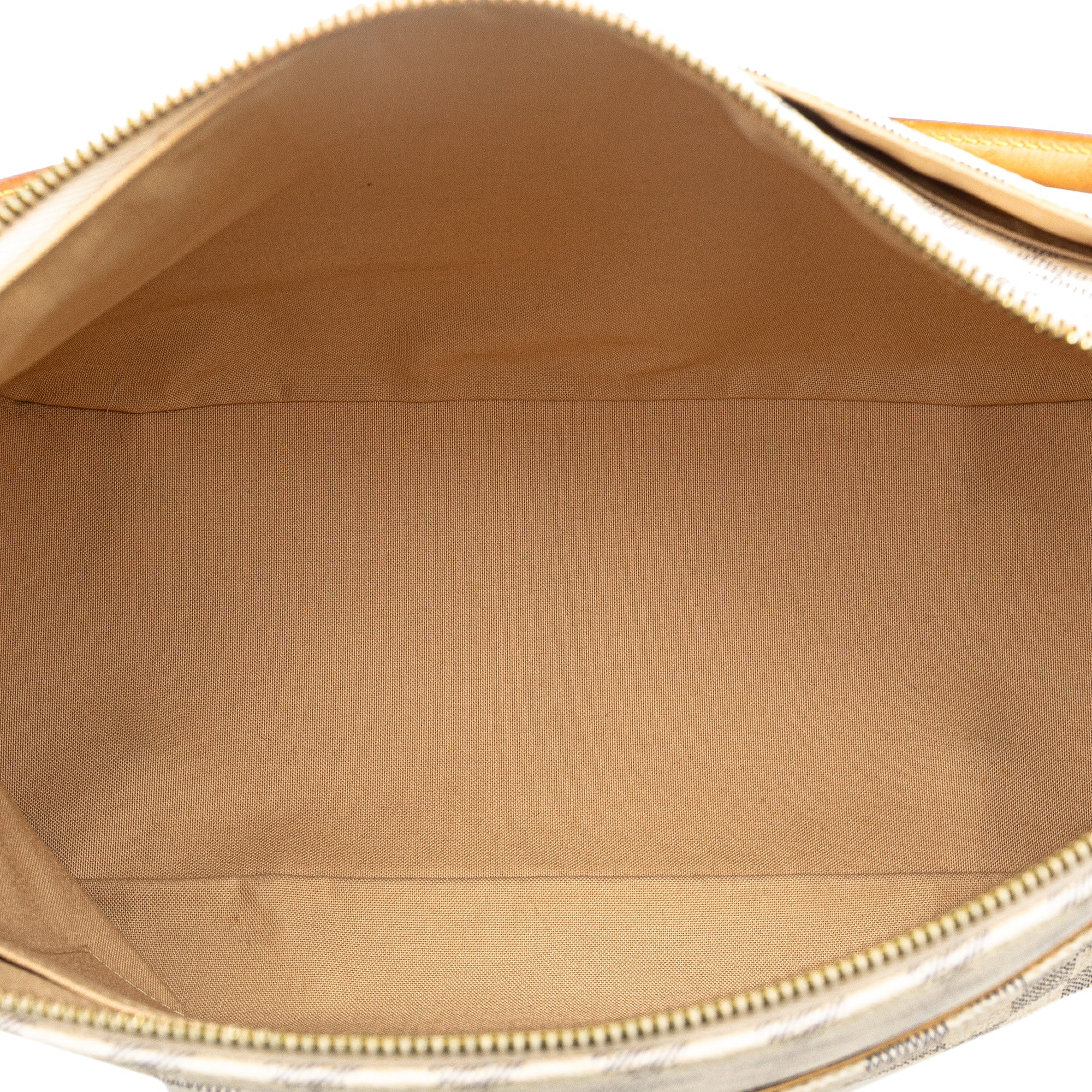 The Figheri GM features a damier azur canvas body, rolled vachetta leather straps, a top zip closure, front and back exterior slip pockets, and an interior slip pocket. Retail Price: 1275.00
