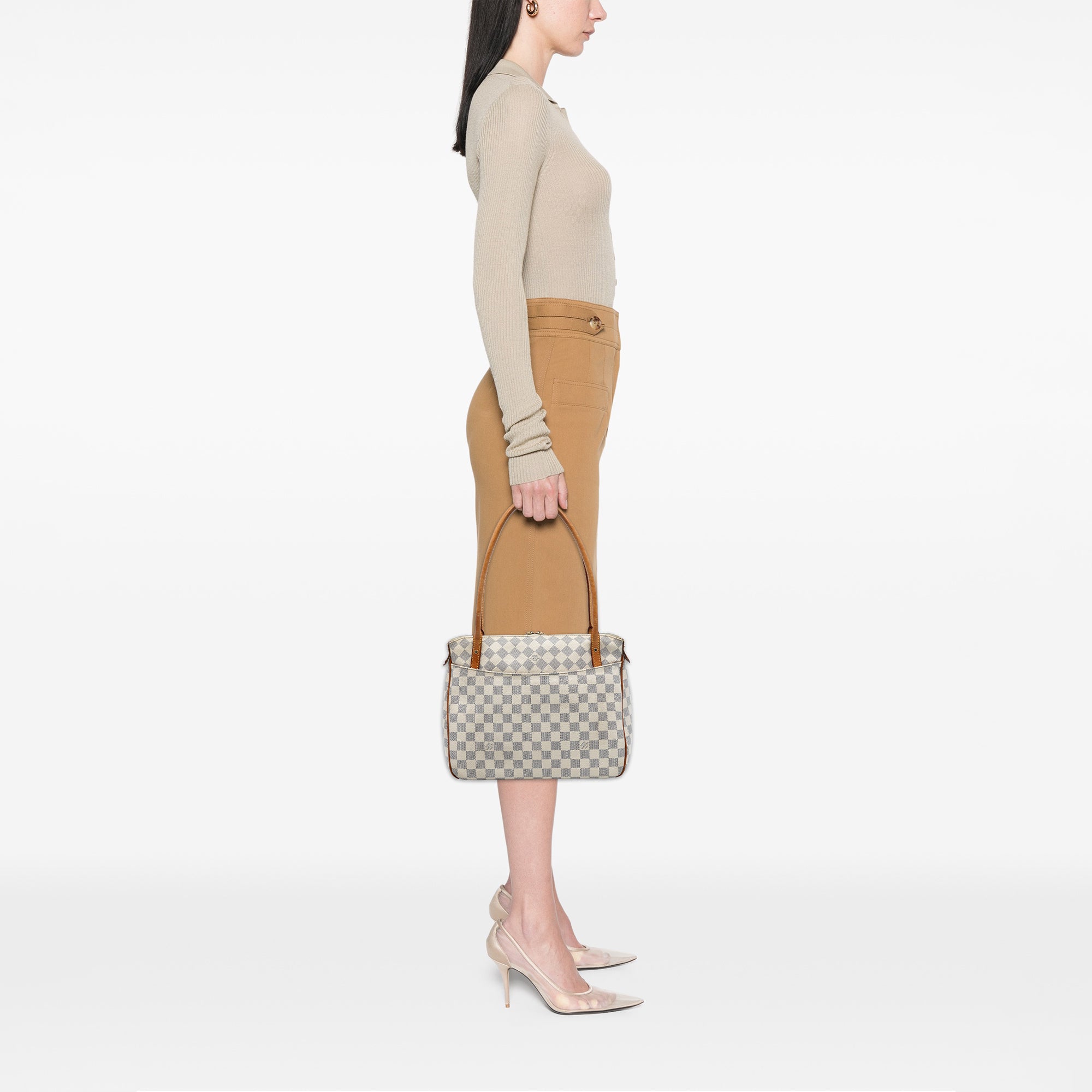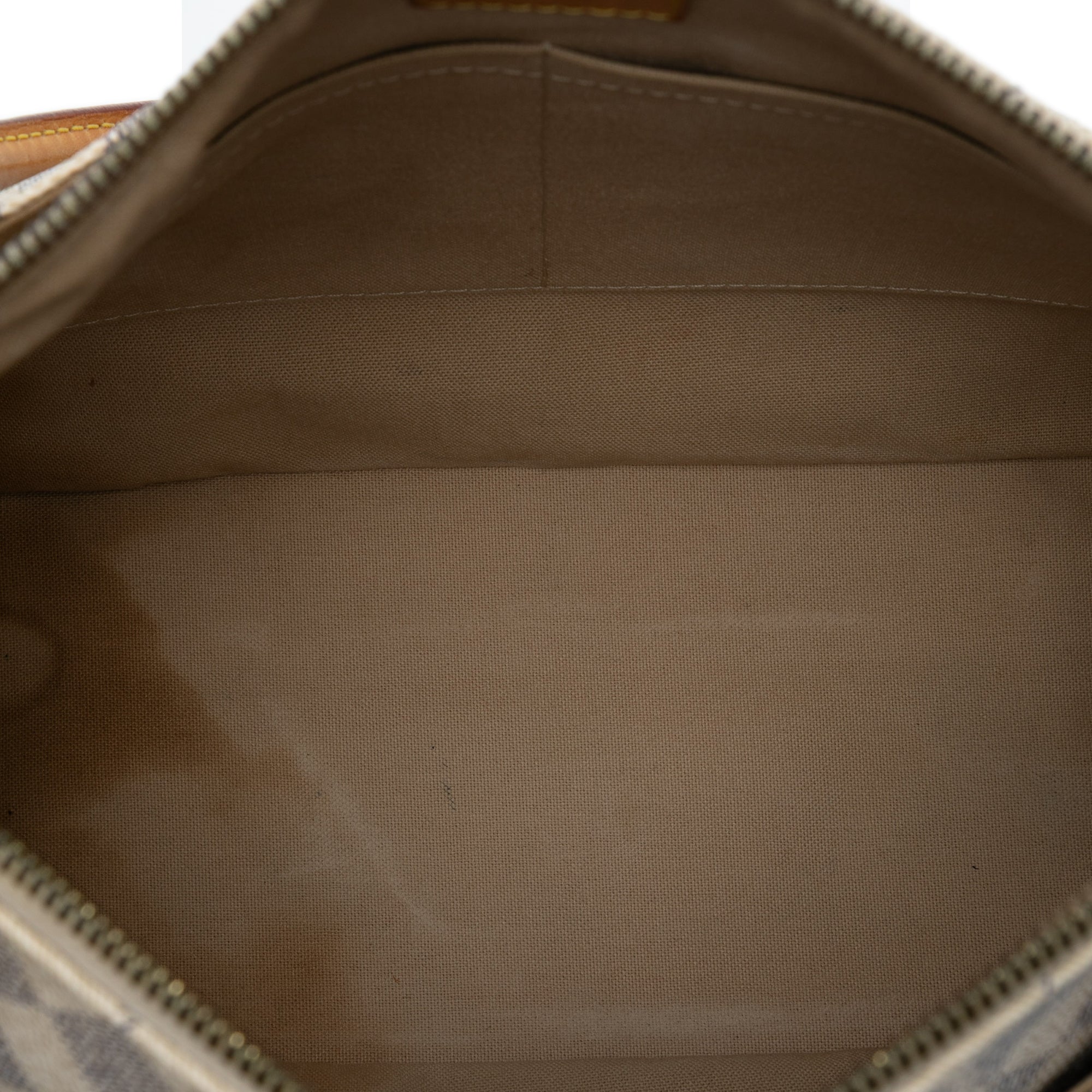 The Figheri PM features a damier azur canvas body with vachetta leather trim, rolled vachetta leather handles, a two-way top zip closure, exterior front and back slip pockets, and interior slip pockets. Retail Price: 1590.00