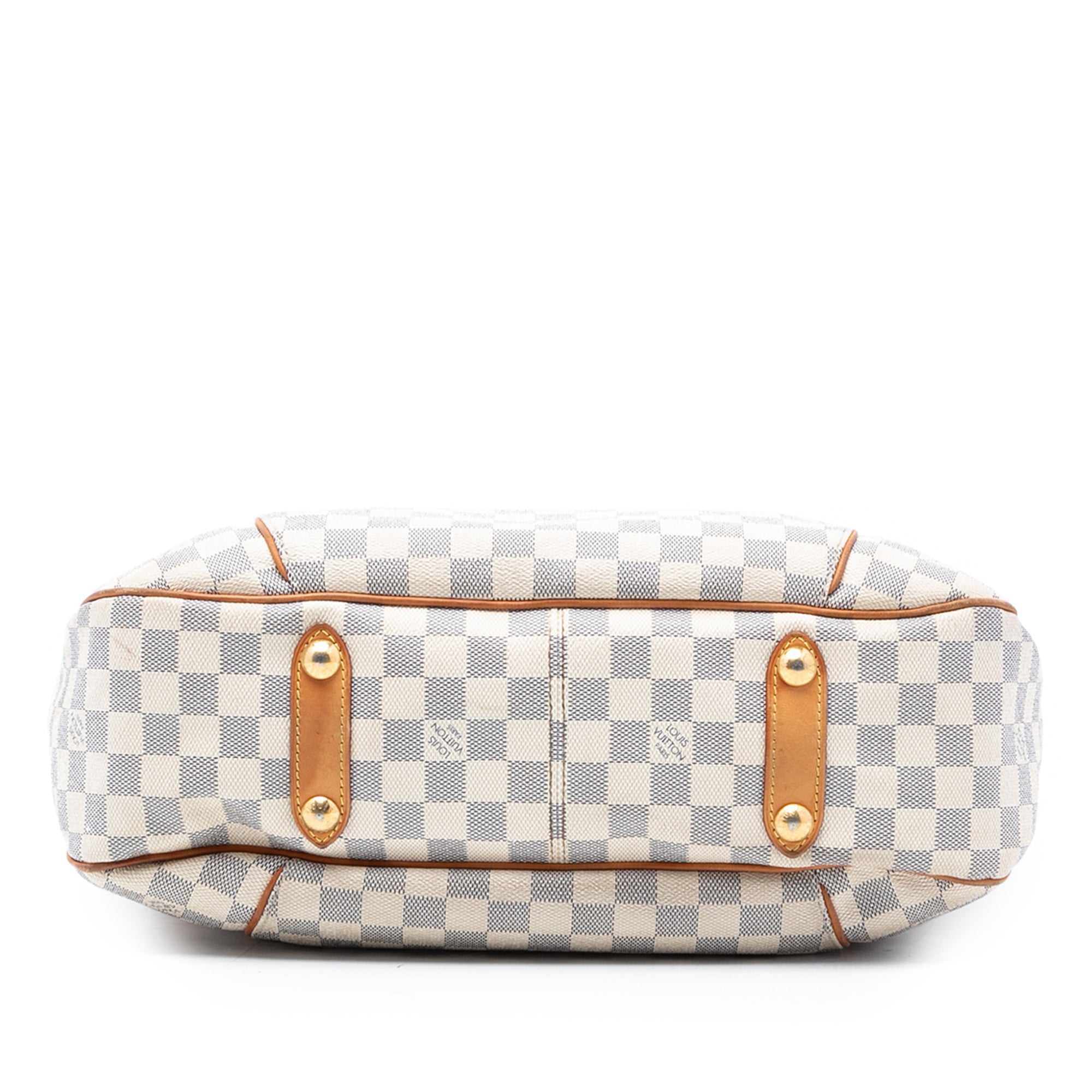 The Galliera PM features a damier azur canvas body with vachetta leather trim, a flat vachetta leather strap, an open top with a magnetic closure, and interior flap and slip pockets. Retail Price: 1800.00