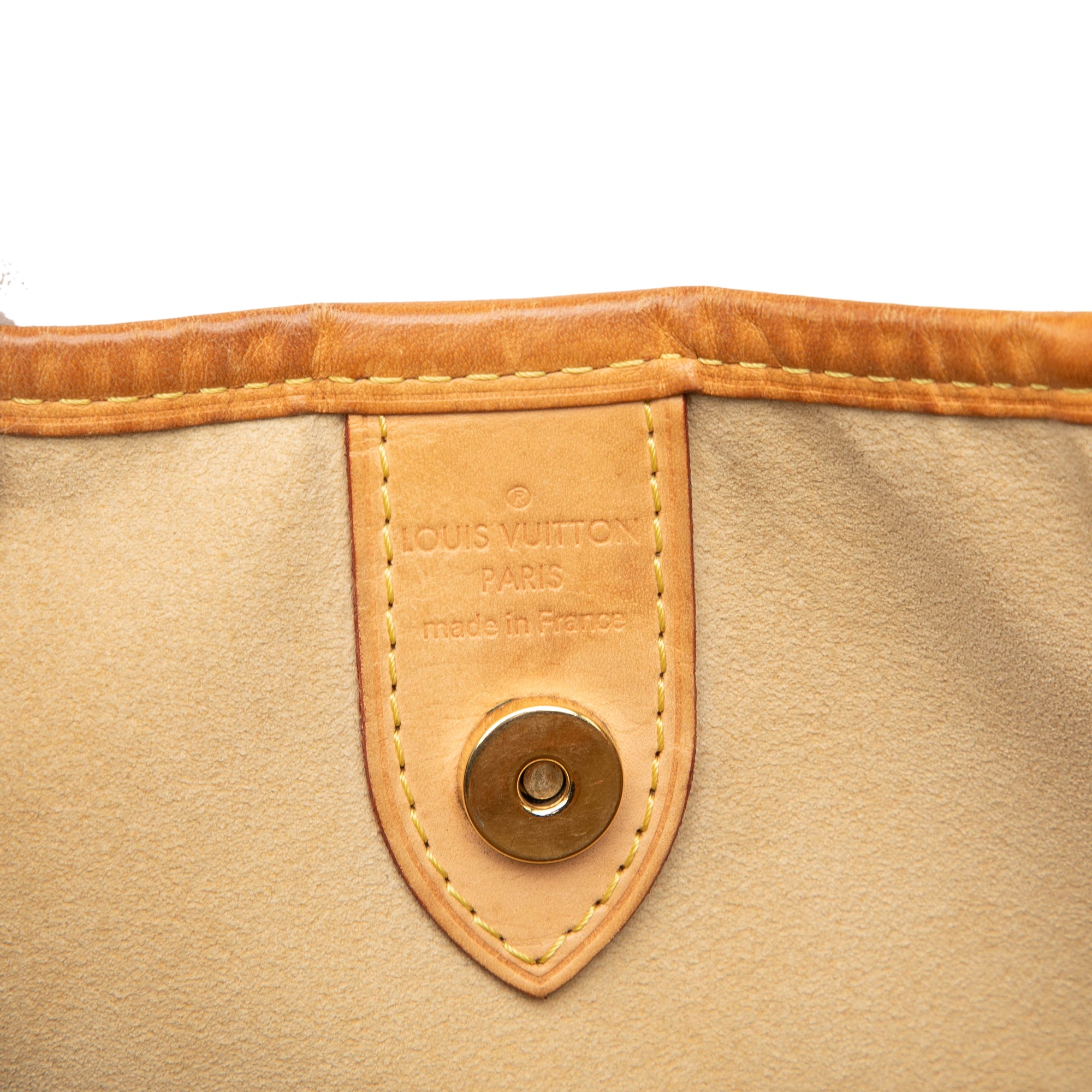 The Galliera PM features a damier azur canvas body with leather trim, flat vachetta strap, an open top with a magnetic closure, an interior flap pocket, and an interior slip pocket. Retail Price: 1680.00