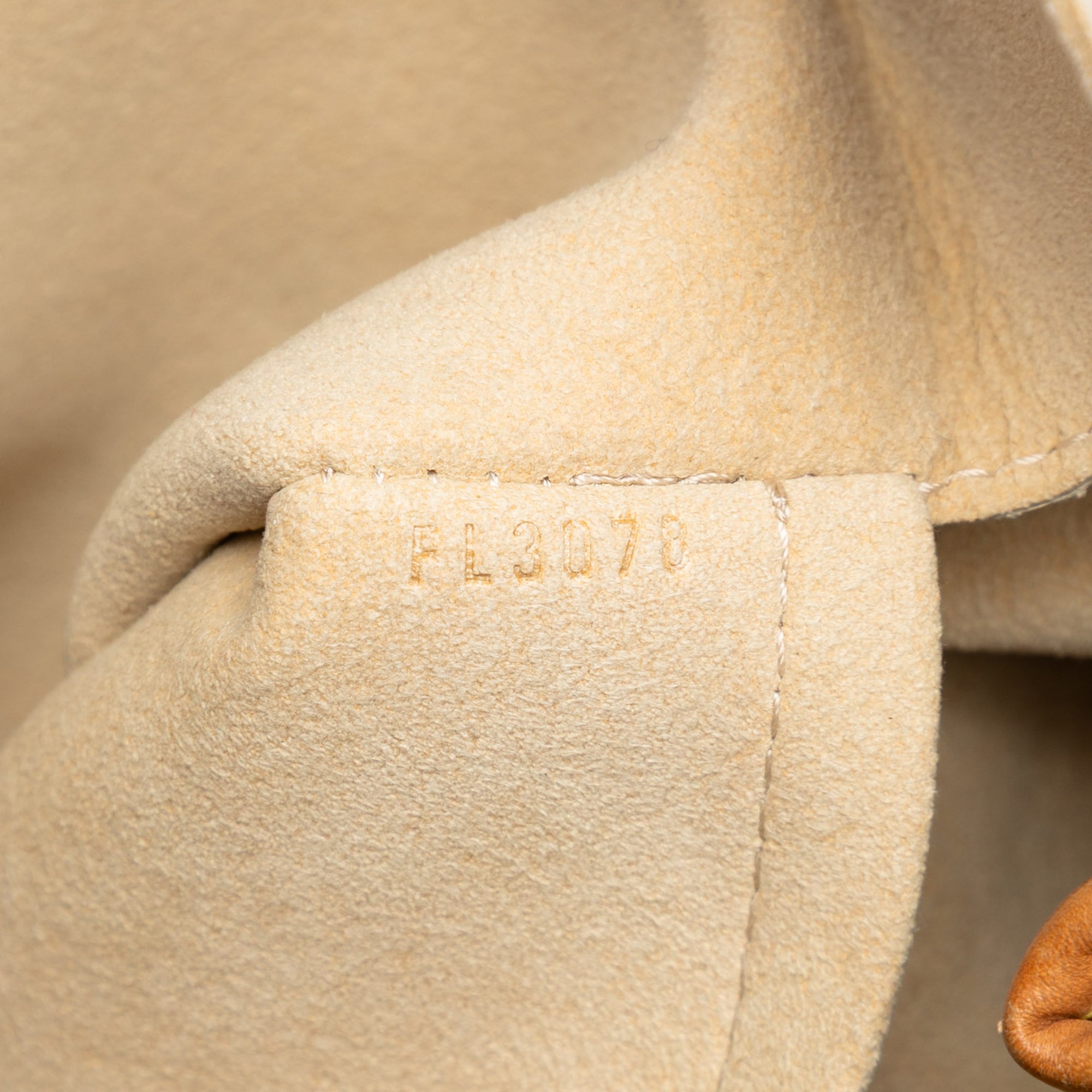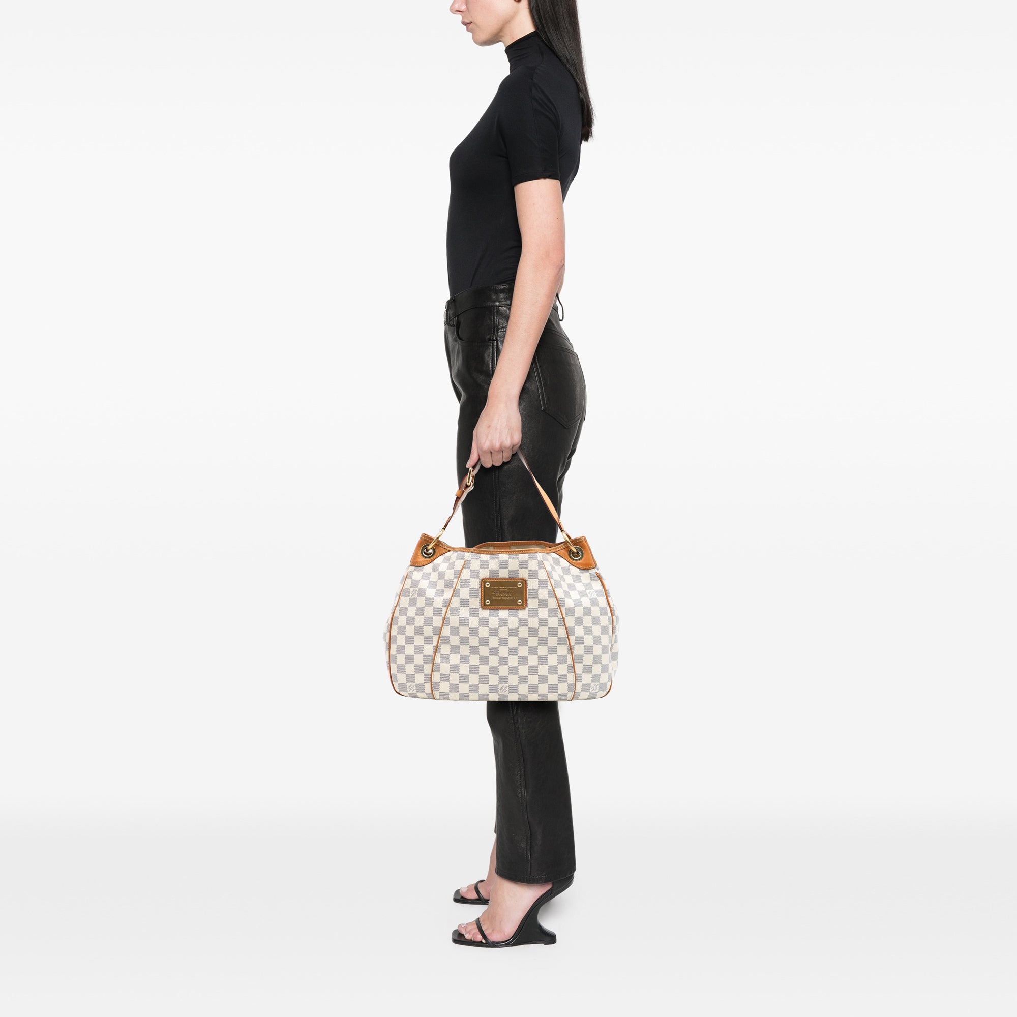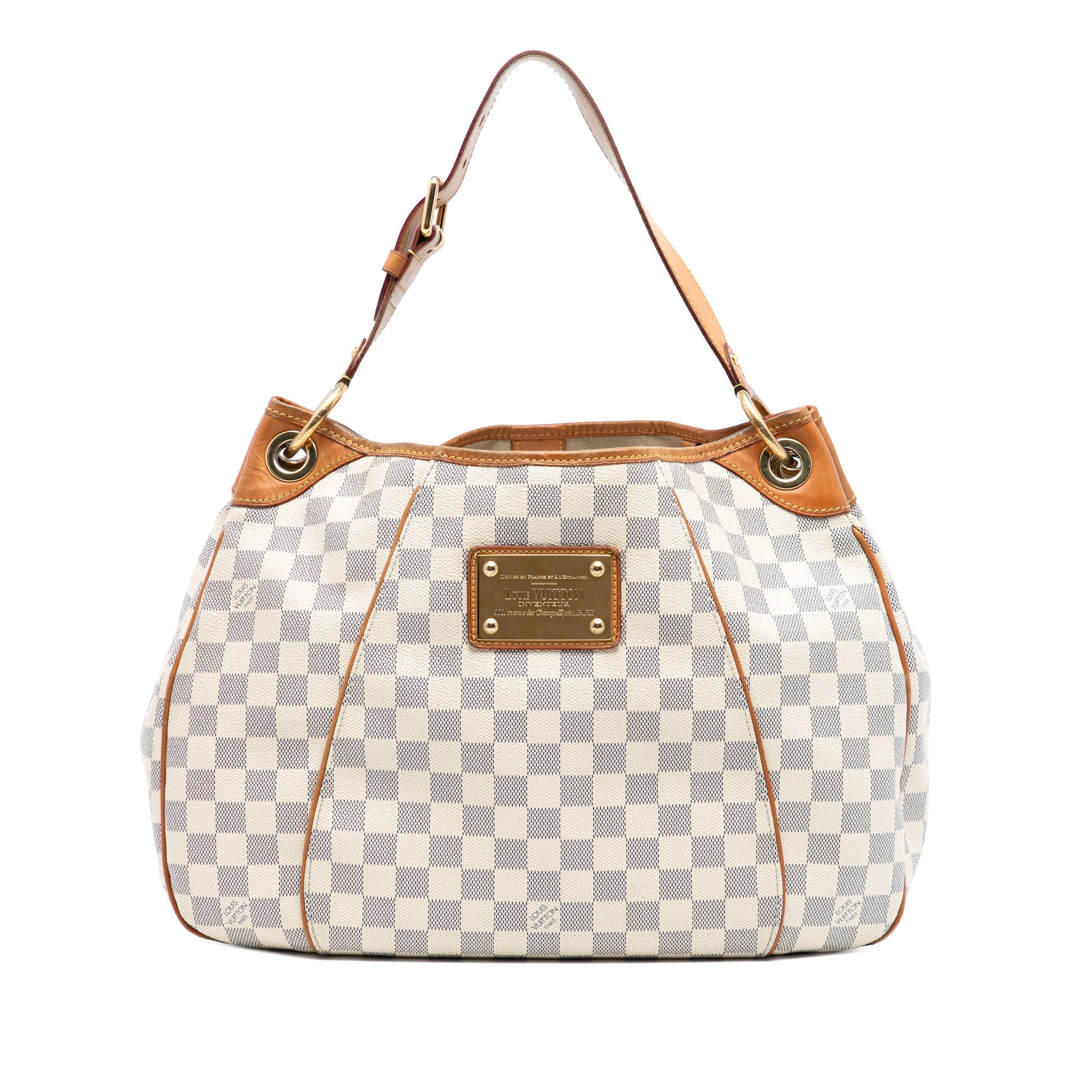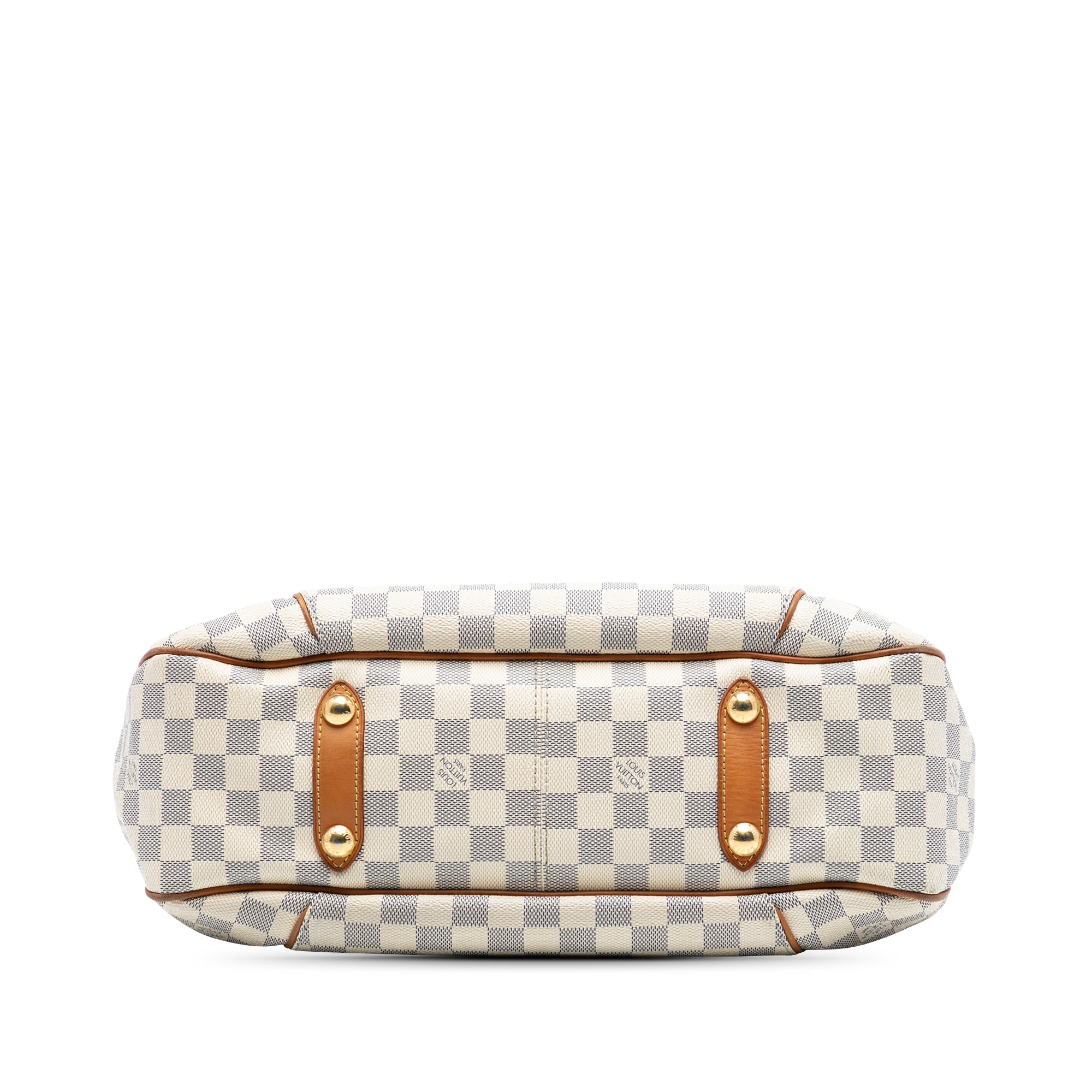 The Galliera PM features a damier azur canvas body with vachetta leather trim, a flat vachetta leather strap, an open top with magnetic snap closure, interior flap and slip pockets. Retail Price: 1680.00