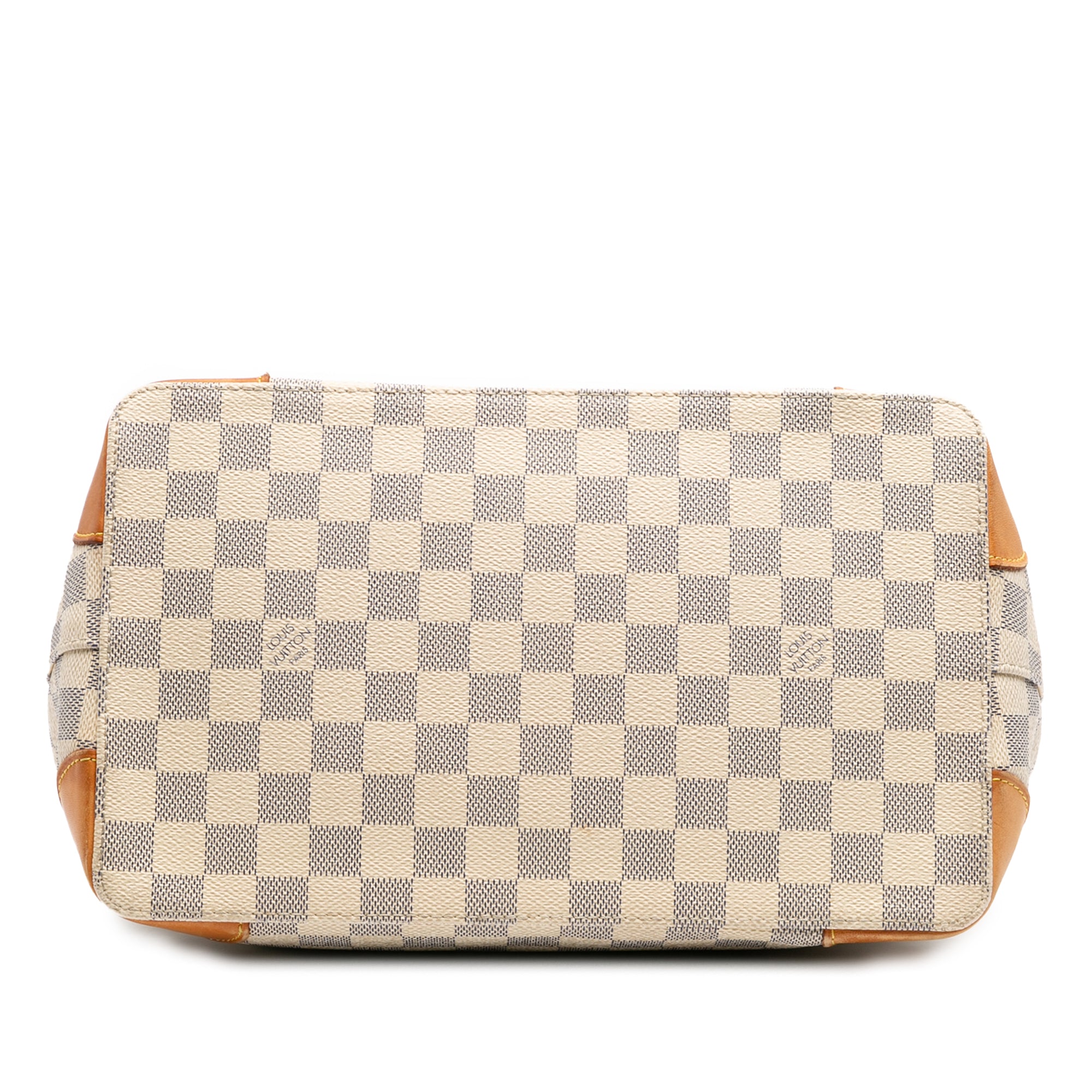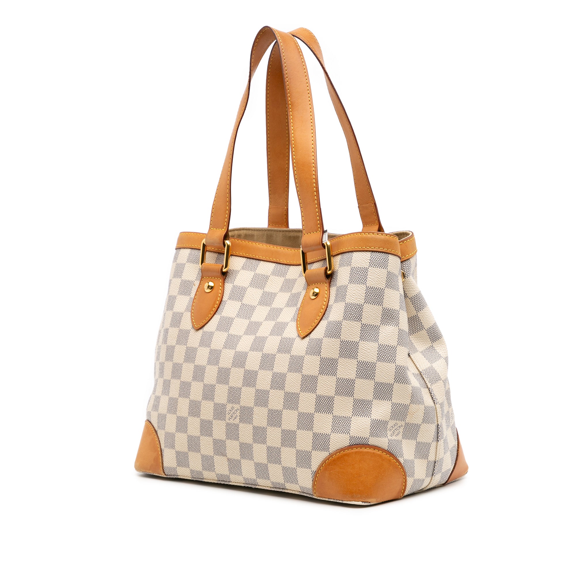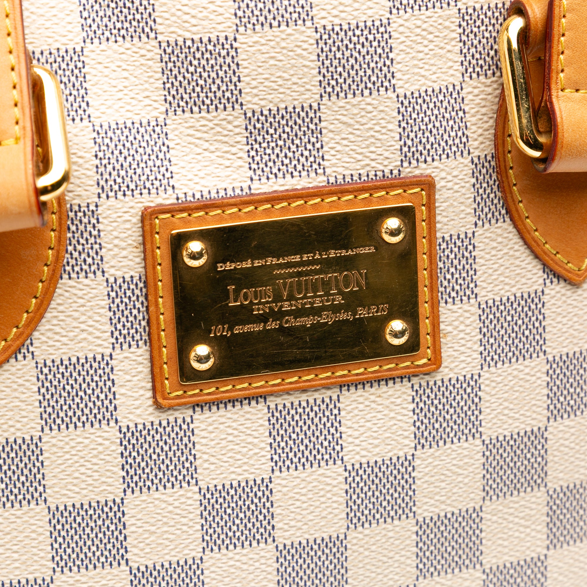 The Hampstead PM features a damier azur canvas body with vachetta trim, flat vachetta leather straps, an open top with lobster clasp closure, and interior zip and slip pockets. Retail Price: 1450.00