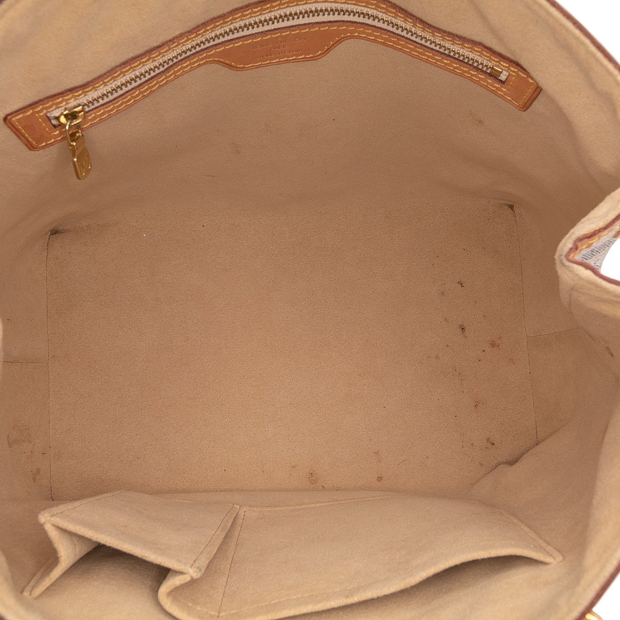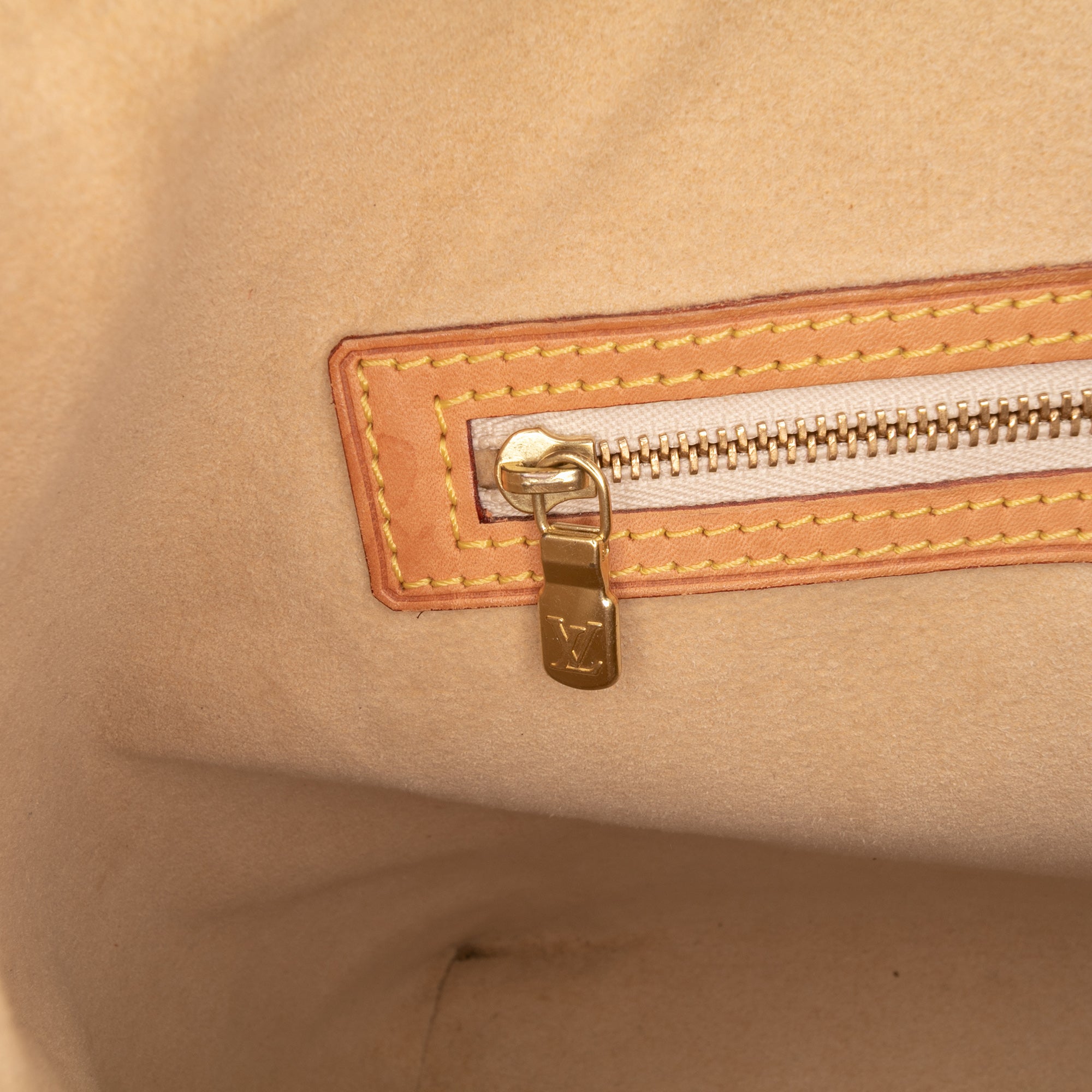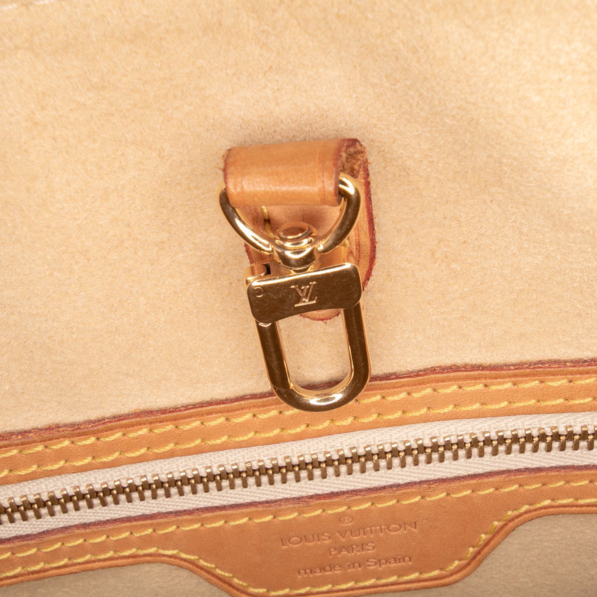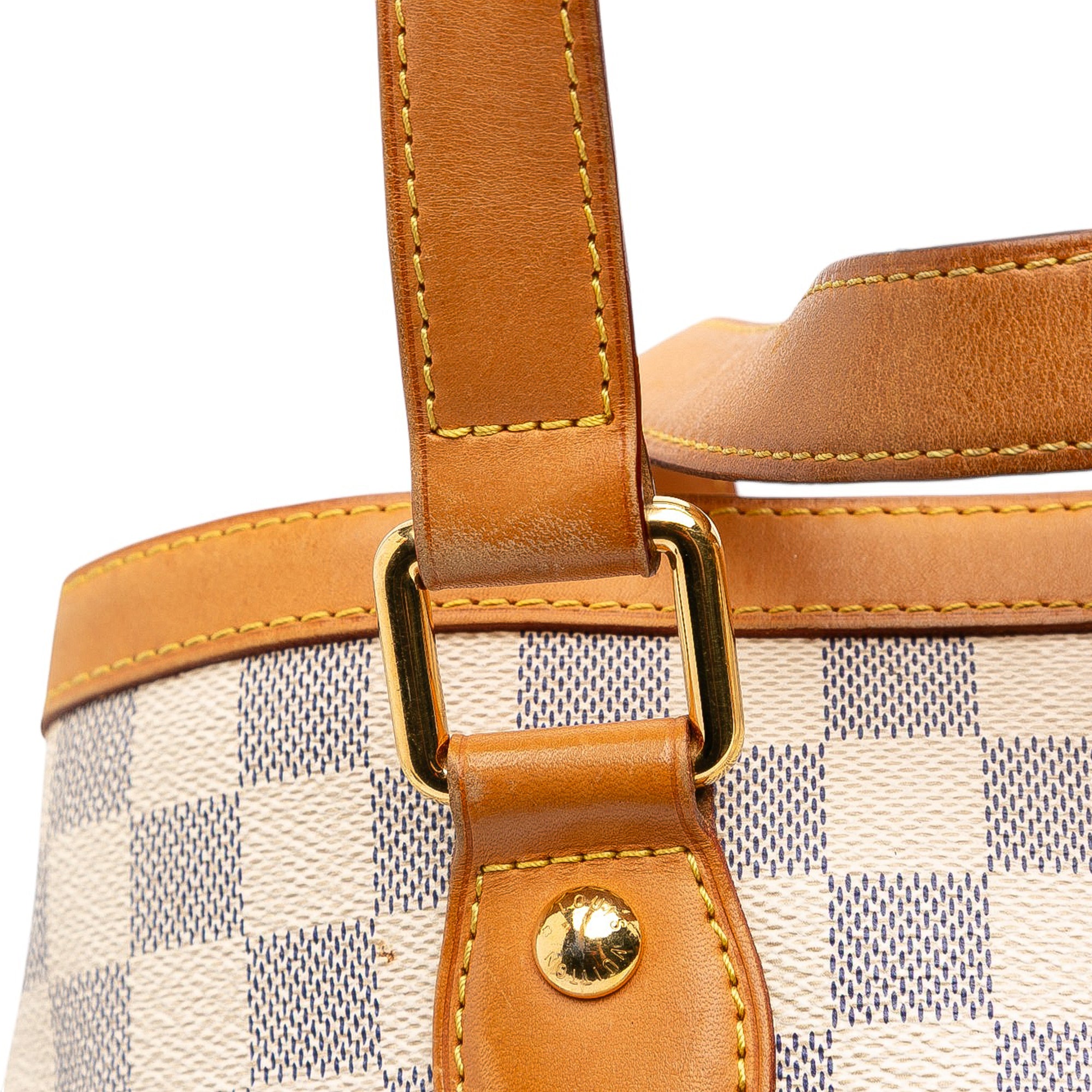 The Hampstead PM features a damier azur canvas body with vachetta trim, flat vachetta leather straps, an open top with lobster clasp closure, and interior zip and slip pockets. Retail Price: 1450.00