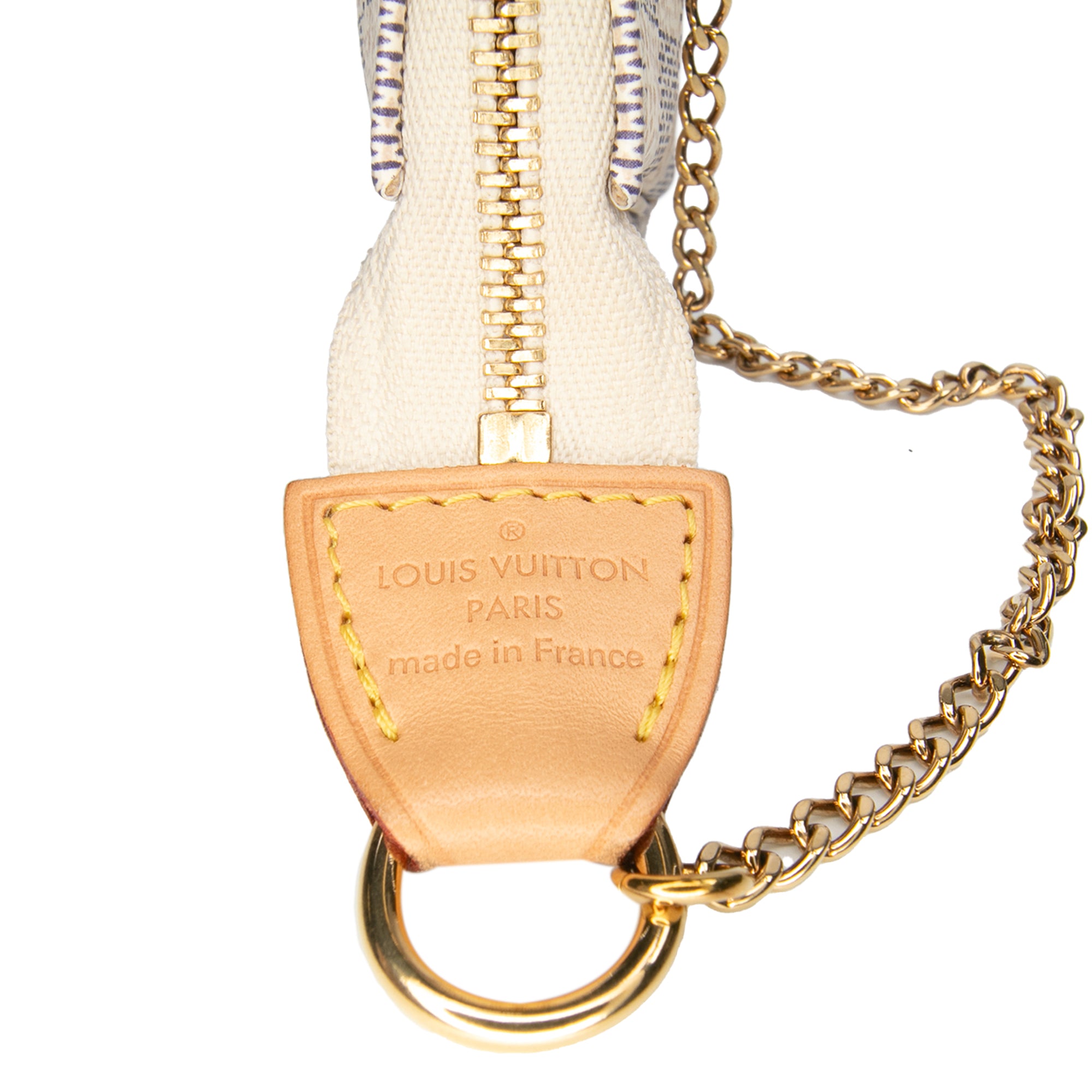 The Mini Pochette Accessoires features a damier azur canvas body, a detachable chain strap, and a top zip closure. Retail Price: 753.00