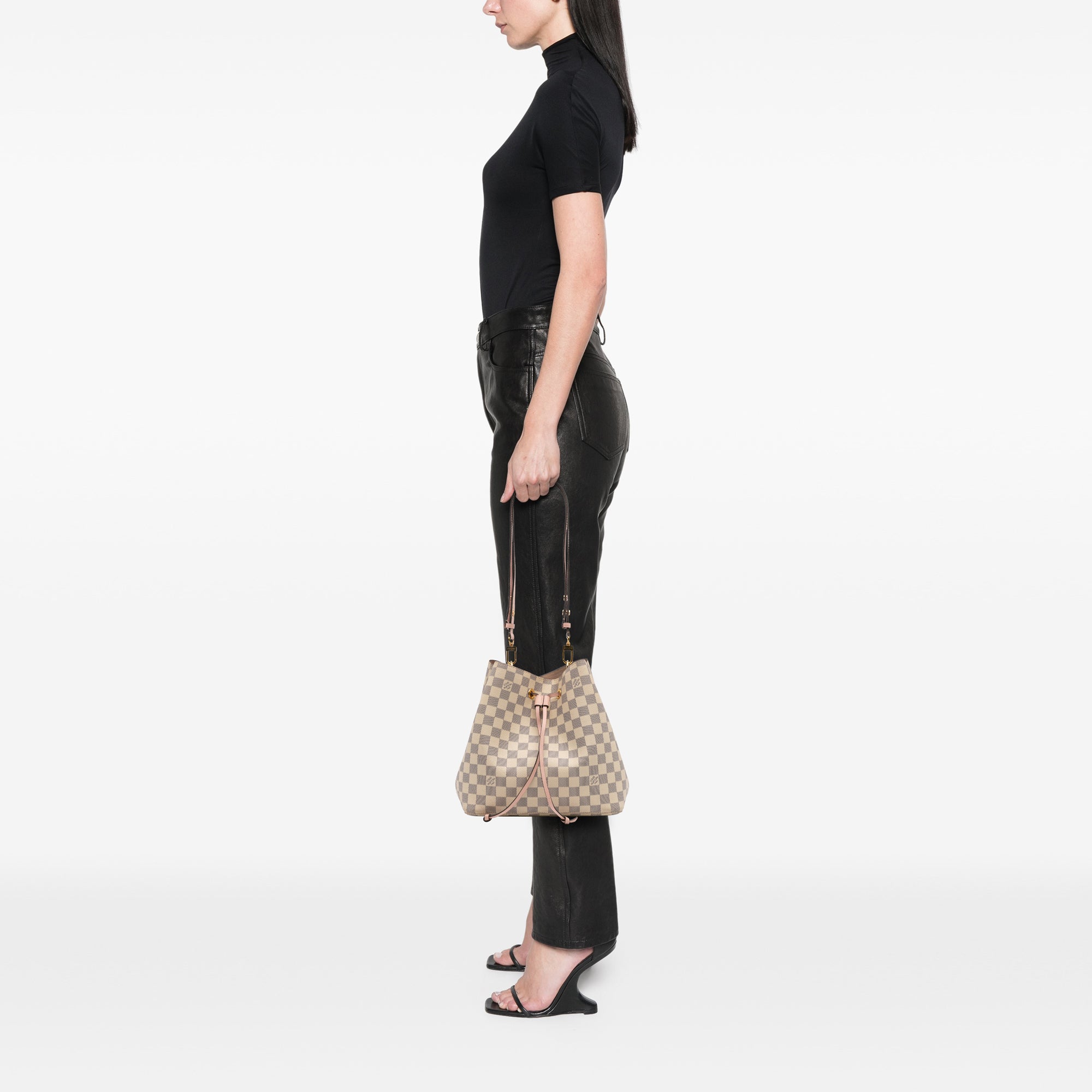The Neonoe features a damier azur canvas body, an adjustable flat leather strap, a top drawstring closure, and an interior zip pocket. Retail Price: 1930.00