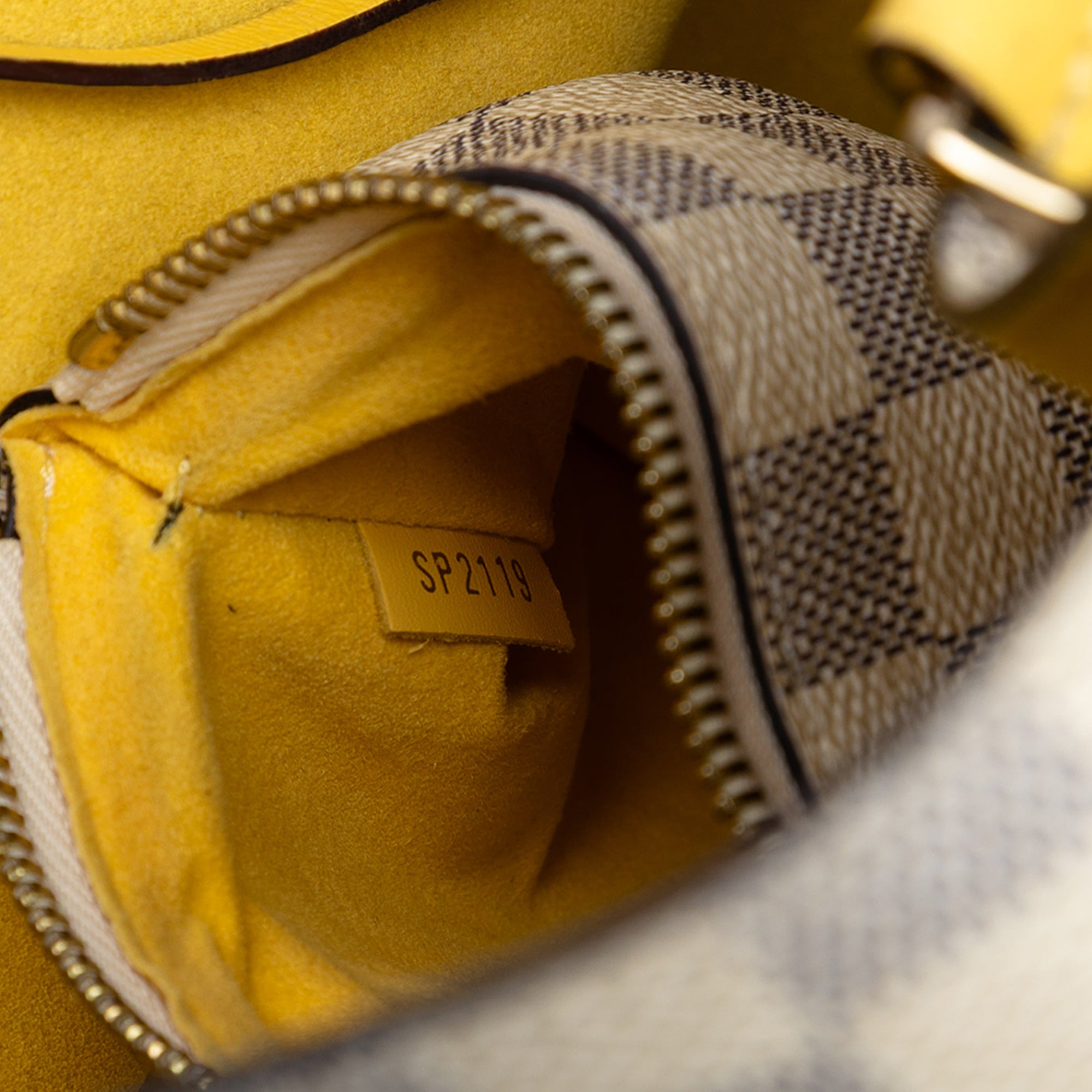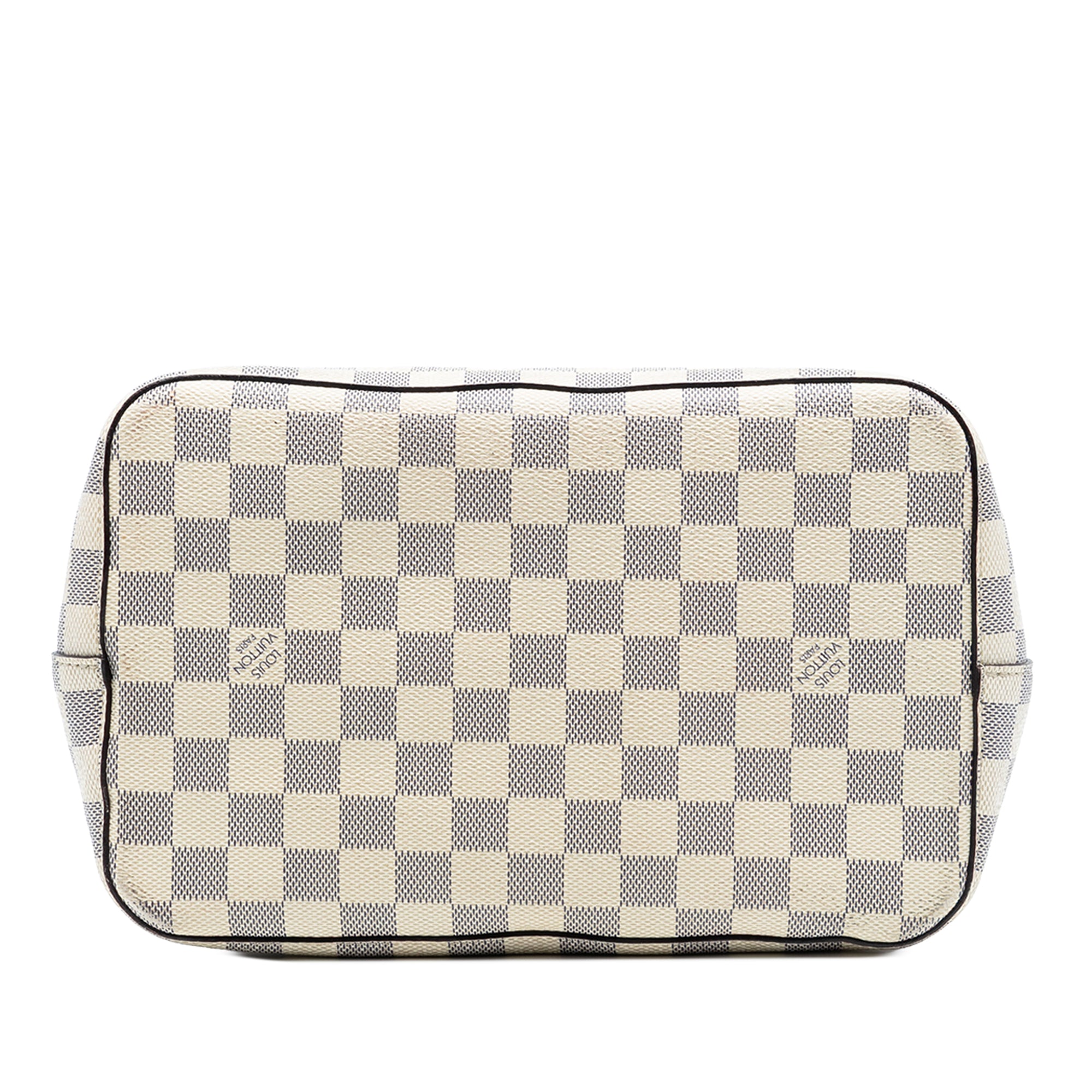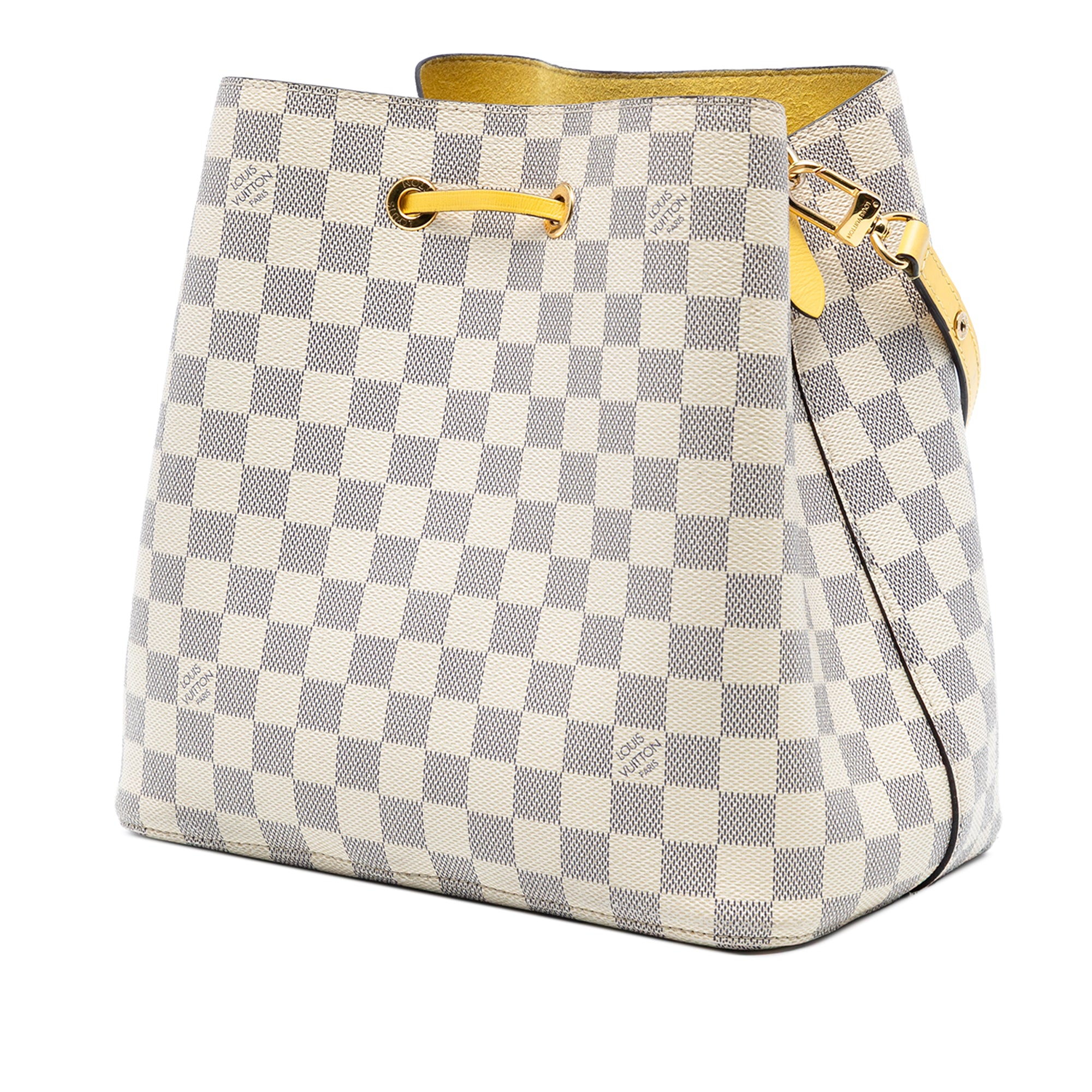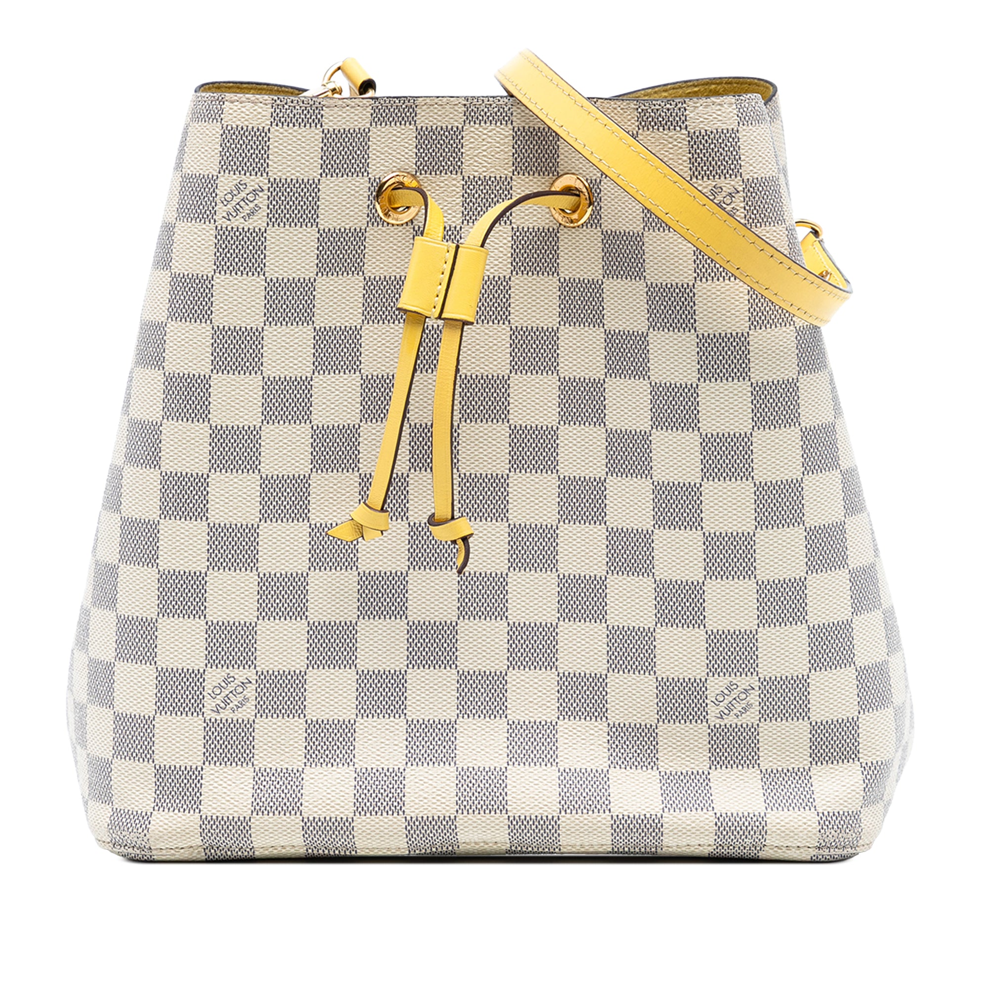 The Neonoe features a damier azur canvas body, an adjustable flat leather strap, a top drawstring closure, and an interior zip pocket. Retail Price: 2220.00