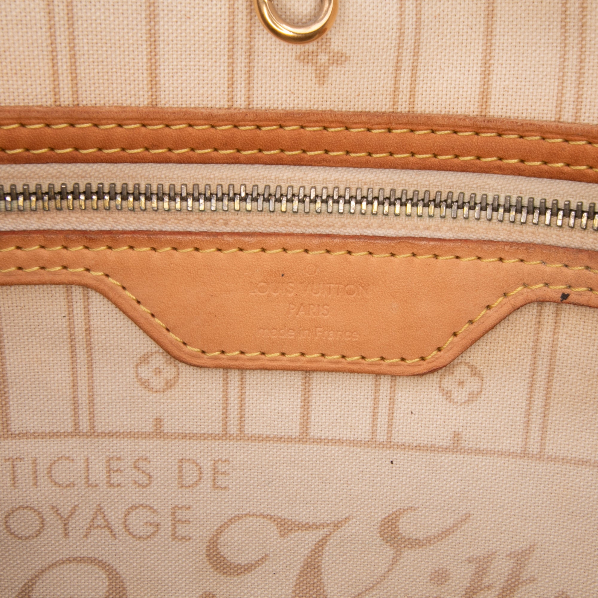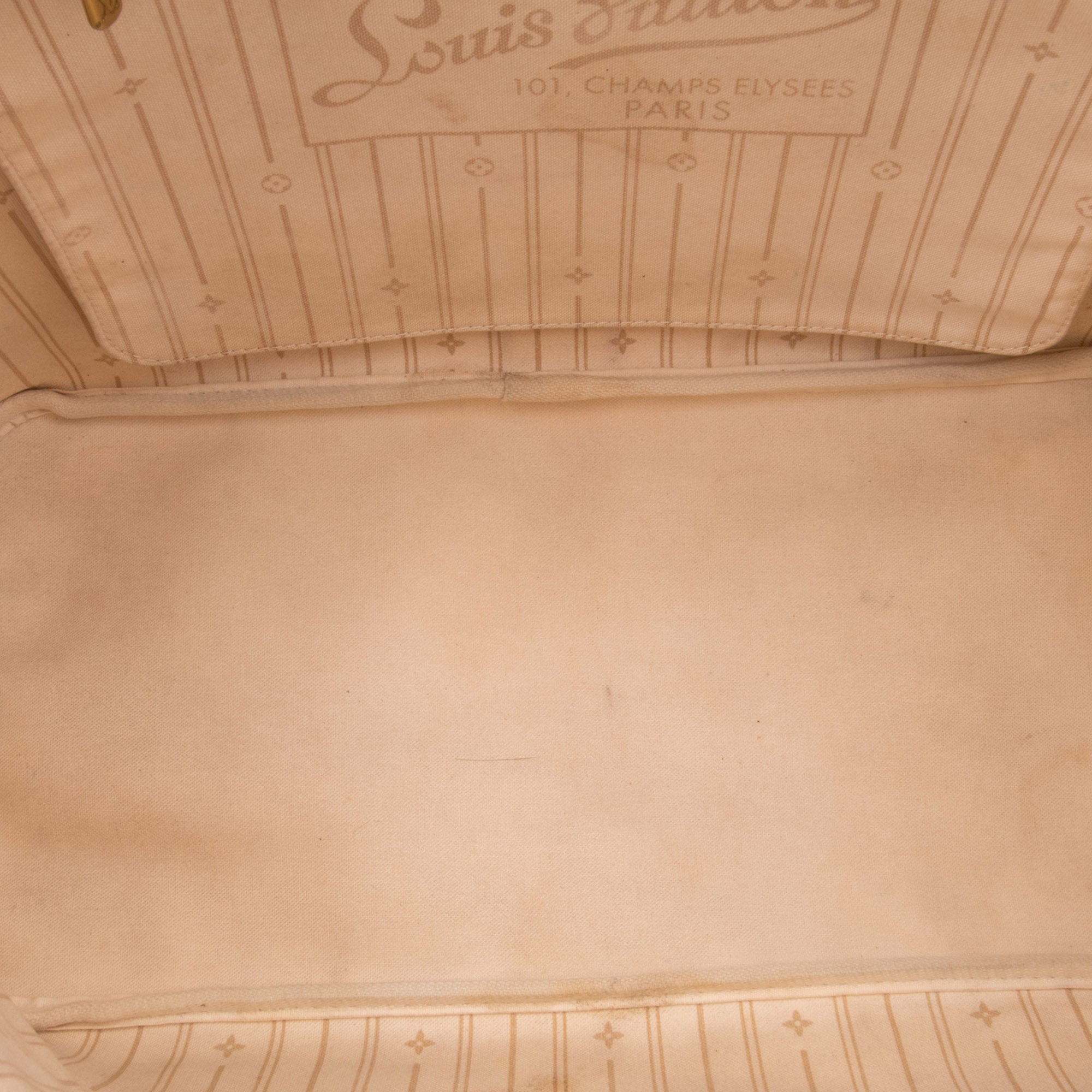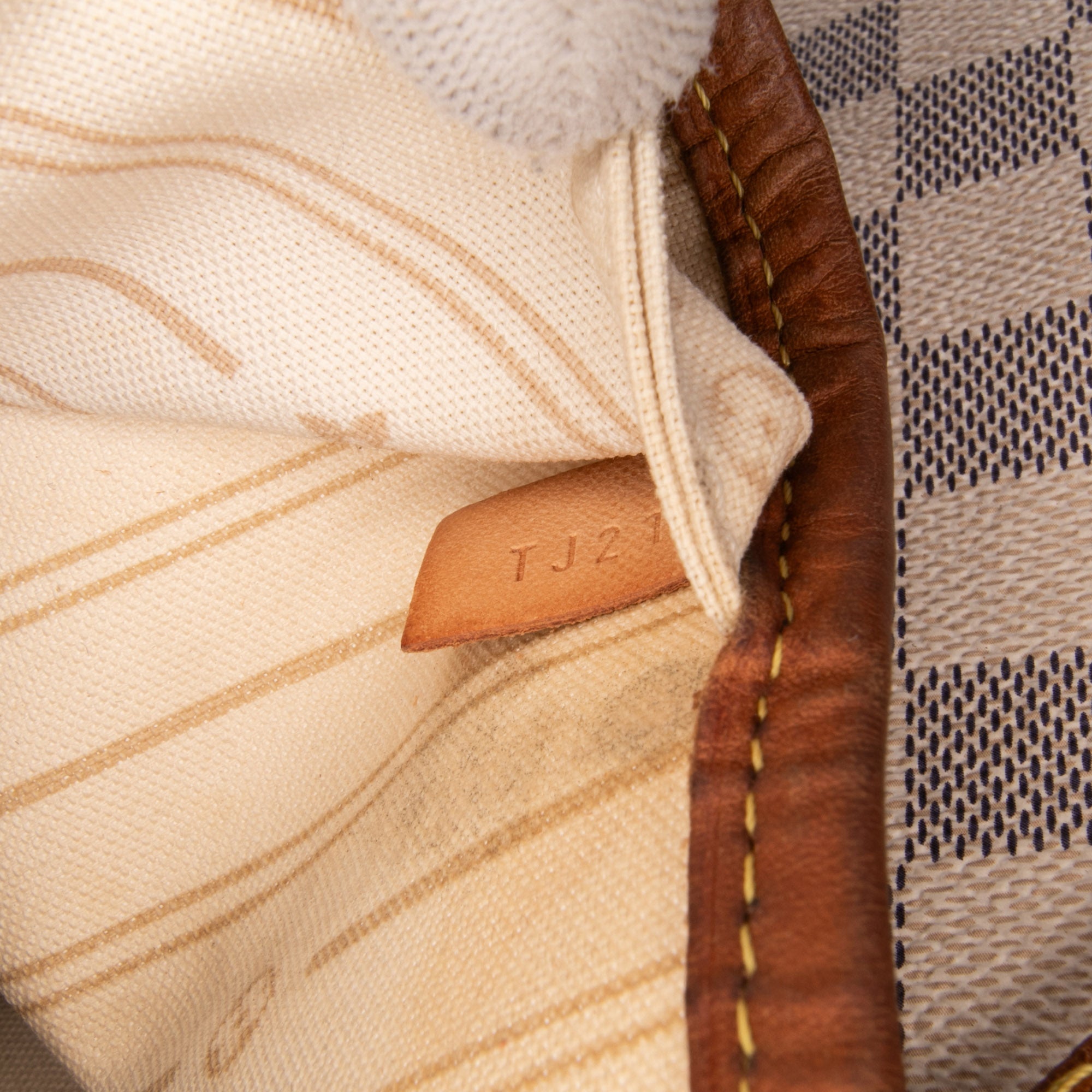 The Neverfull GM features a damier azur canvas body with vachetta leather trim, flat vachetta leather straps, an open top with lobster clasp closure, and an interior zip pocket. Retail Price: 2130.00