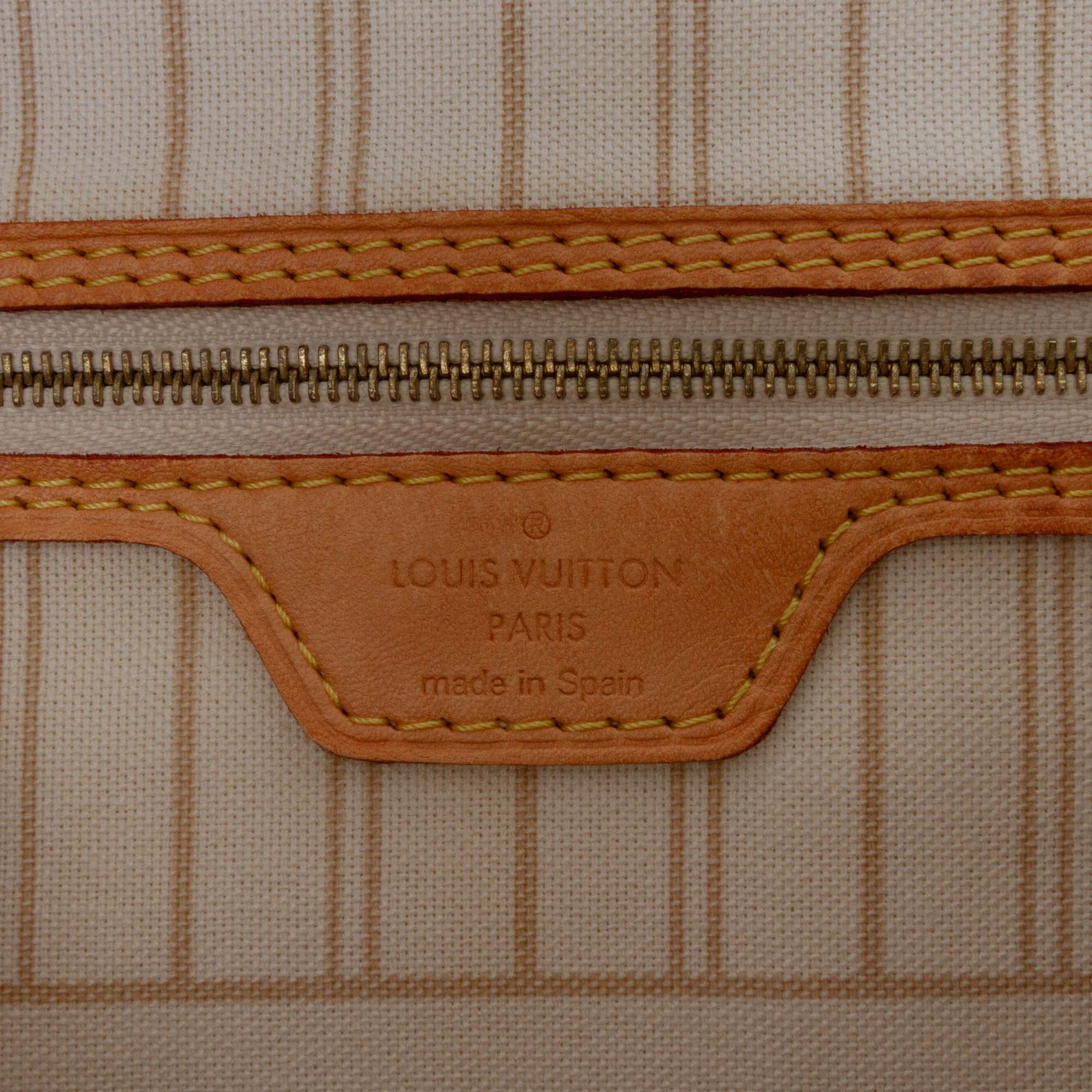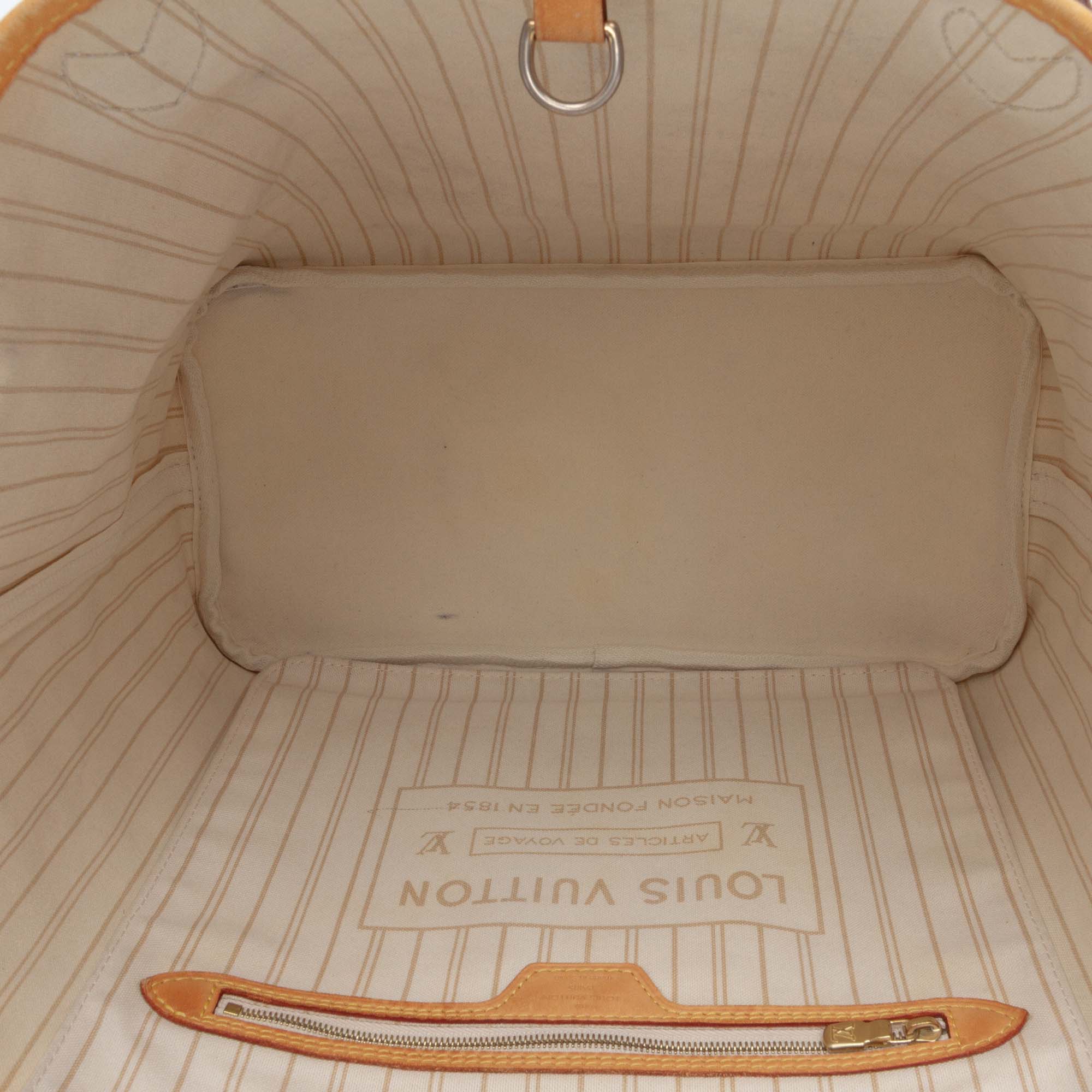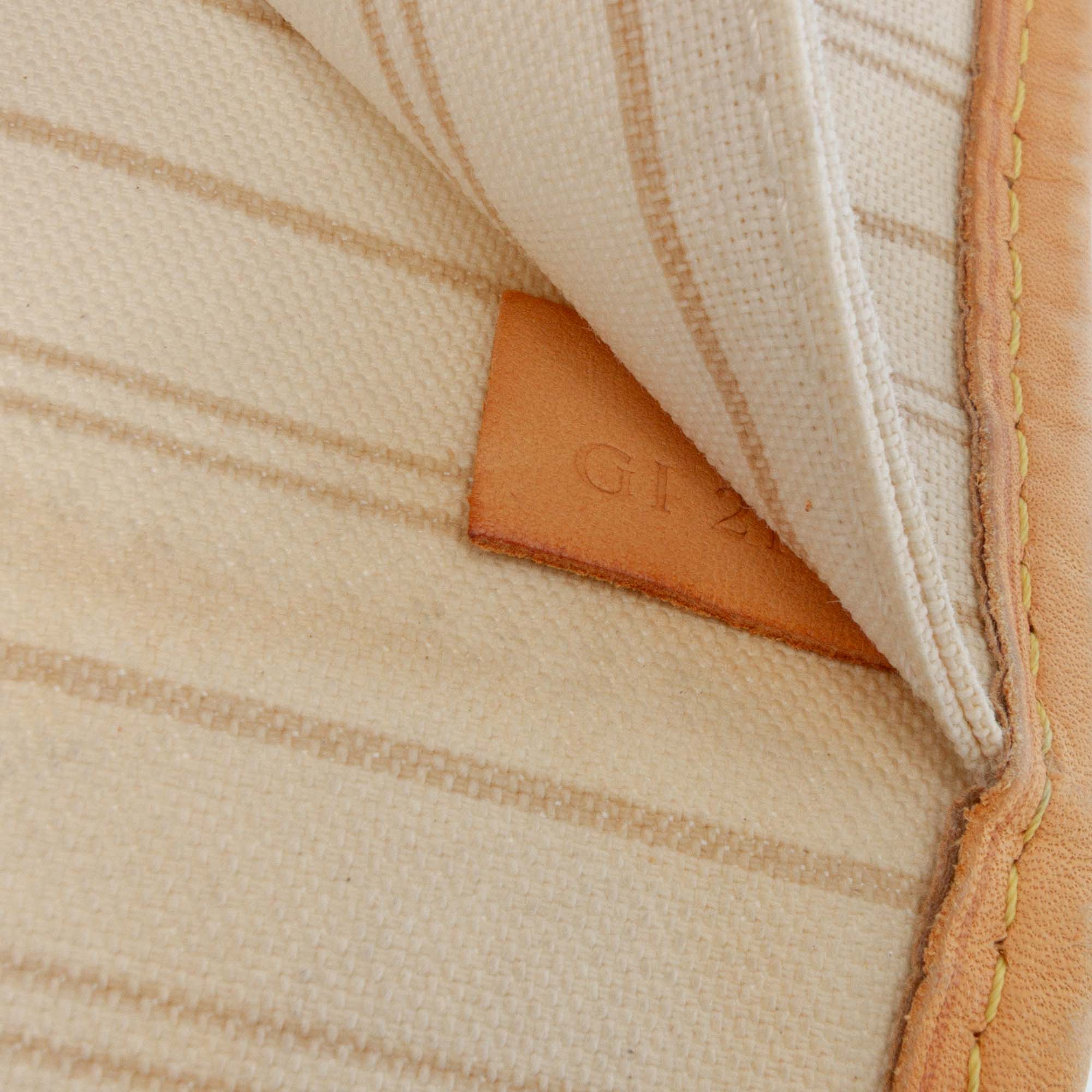 The Neverfull MM features a damier azur canvas body with vachetta leather trim, flat vachetta leather straps, an open top with a lobster clasp closure, an interior zip pocket, and a pouch inclusion. Retail Price: 1963.00
