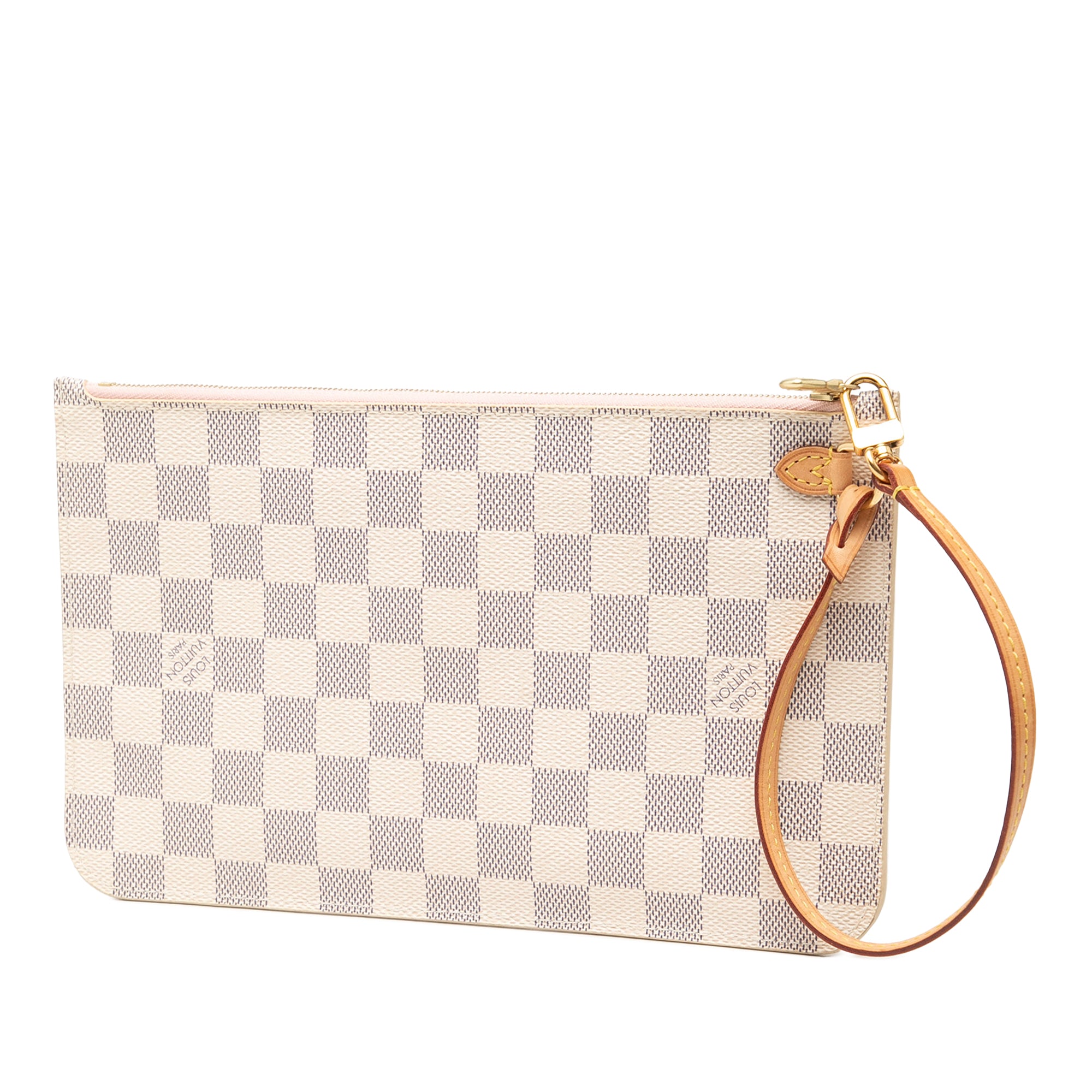 The Neverfull pouch features a damier canvas body, a flat vachetta leather wrist strap, a top zip closure, and an interior slip pocket. Retail Price: 900.00