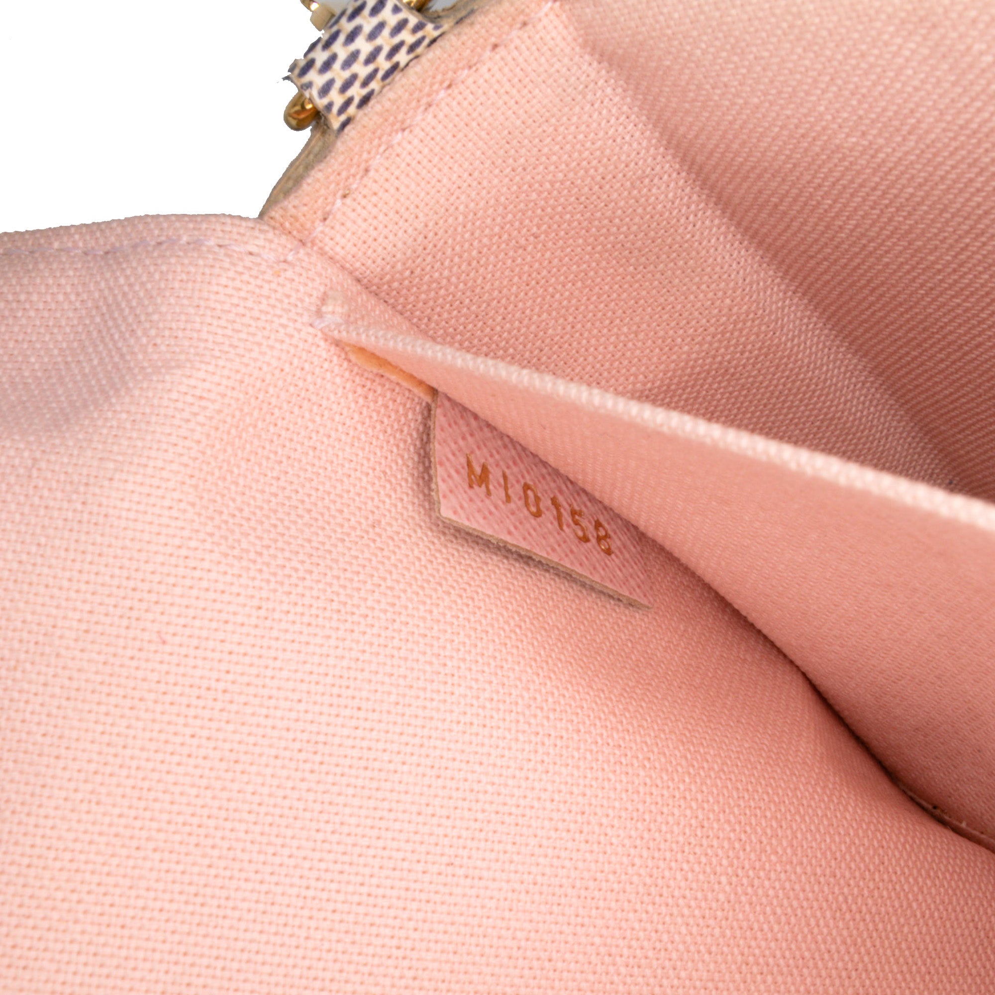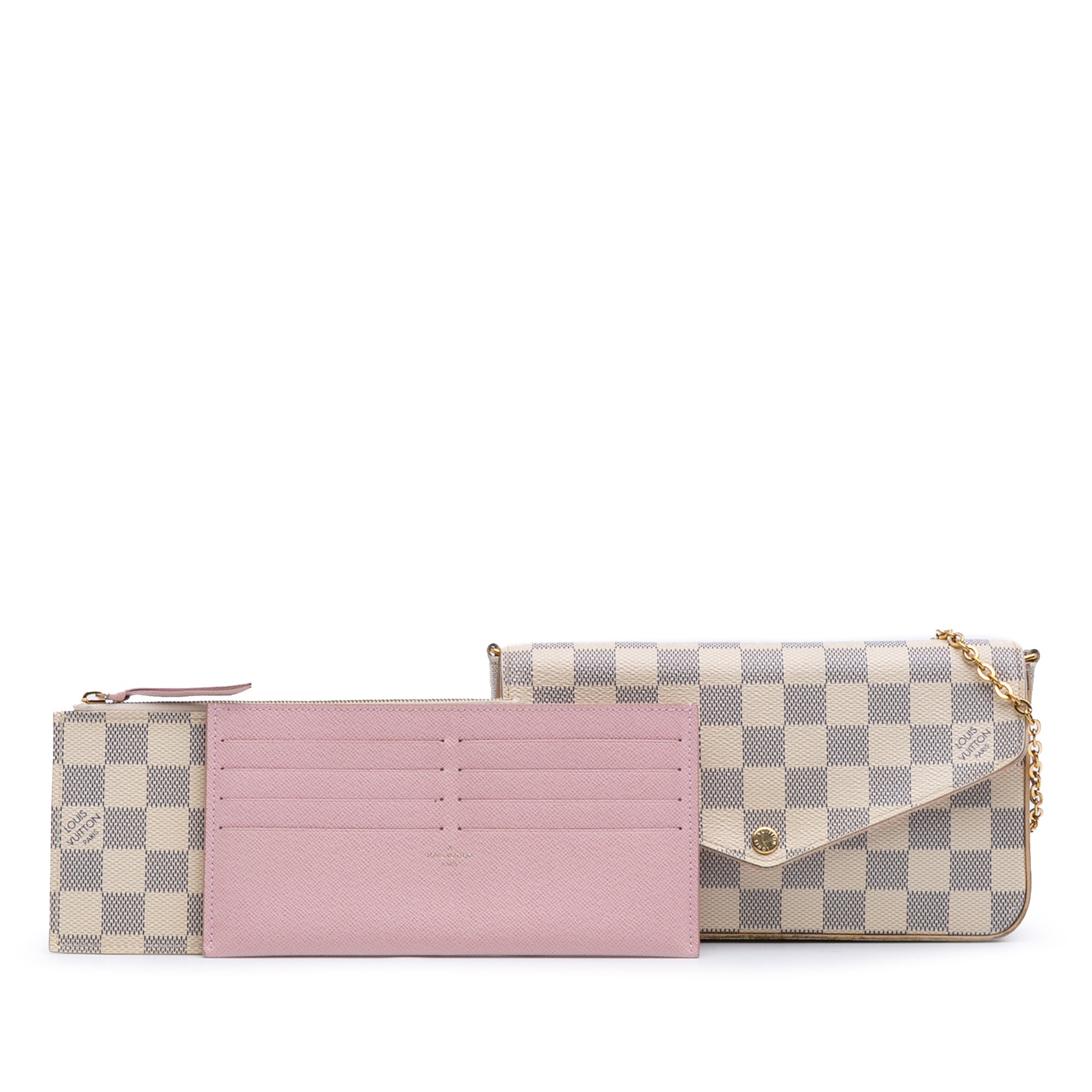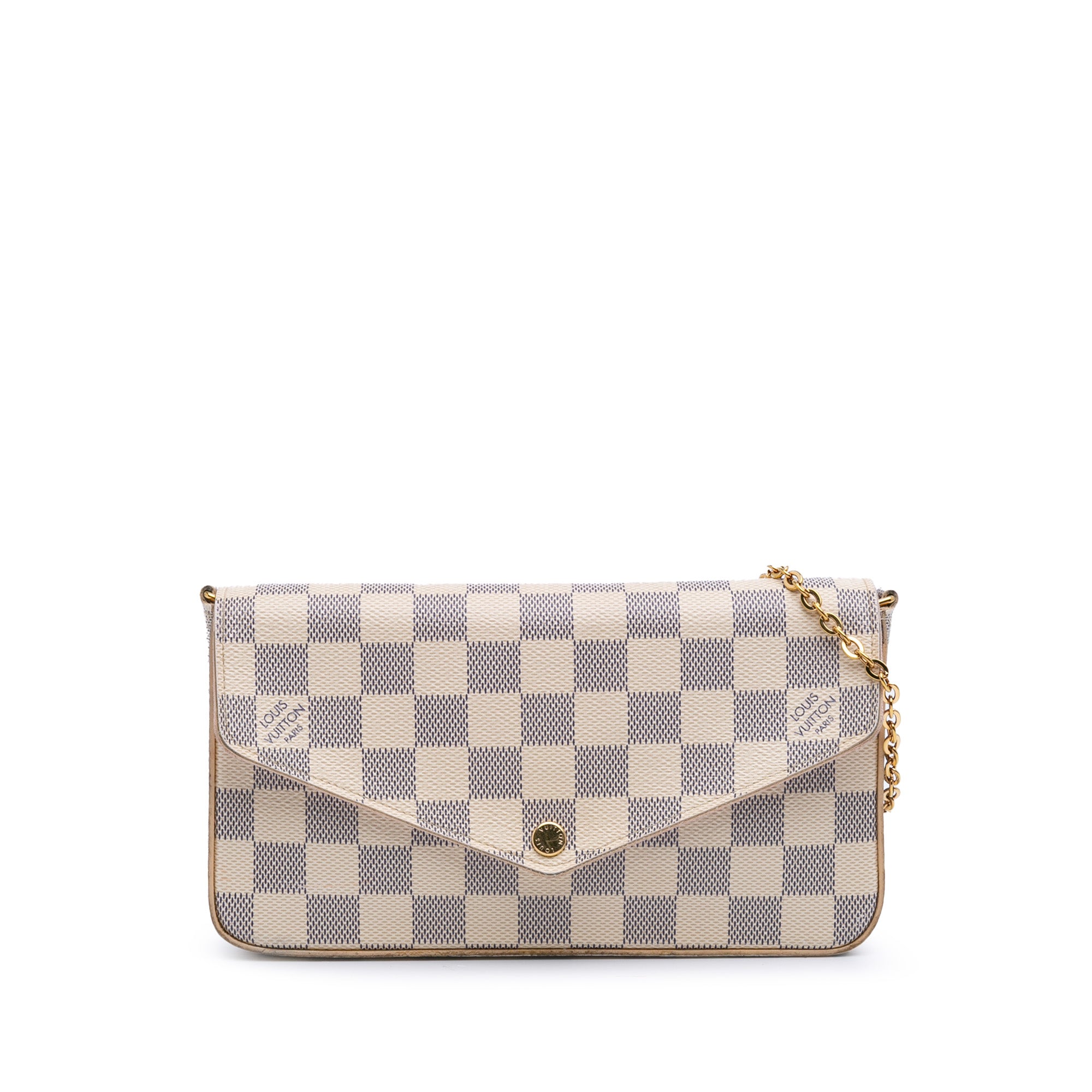 The Pochette Felicie crossbody bag features a damier azur canvas body, a detachable chain-link shoulder strap, a front flap with snap button closure, an interior slip pocket, and detachable pouch inclusions. Retail Price: 2145.00