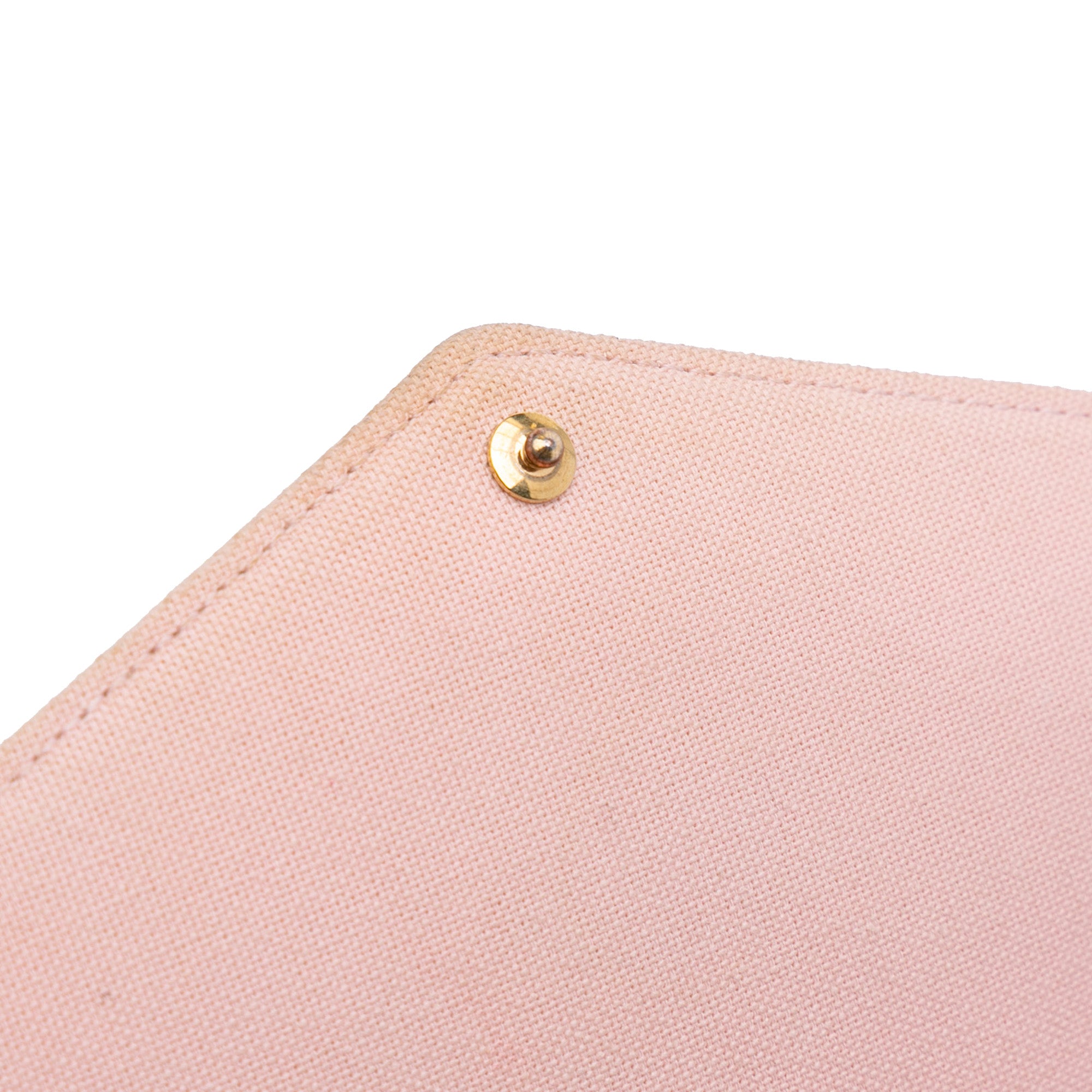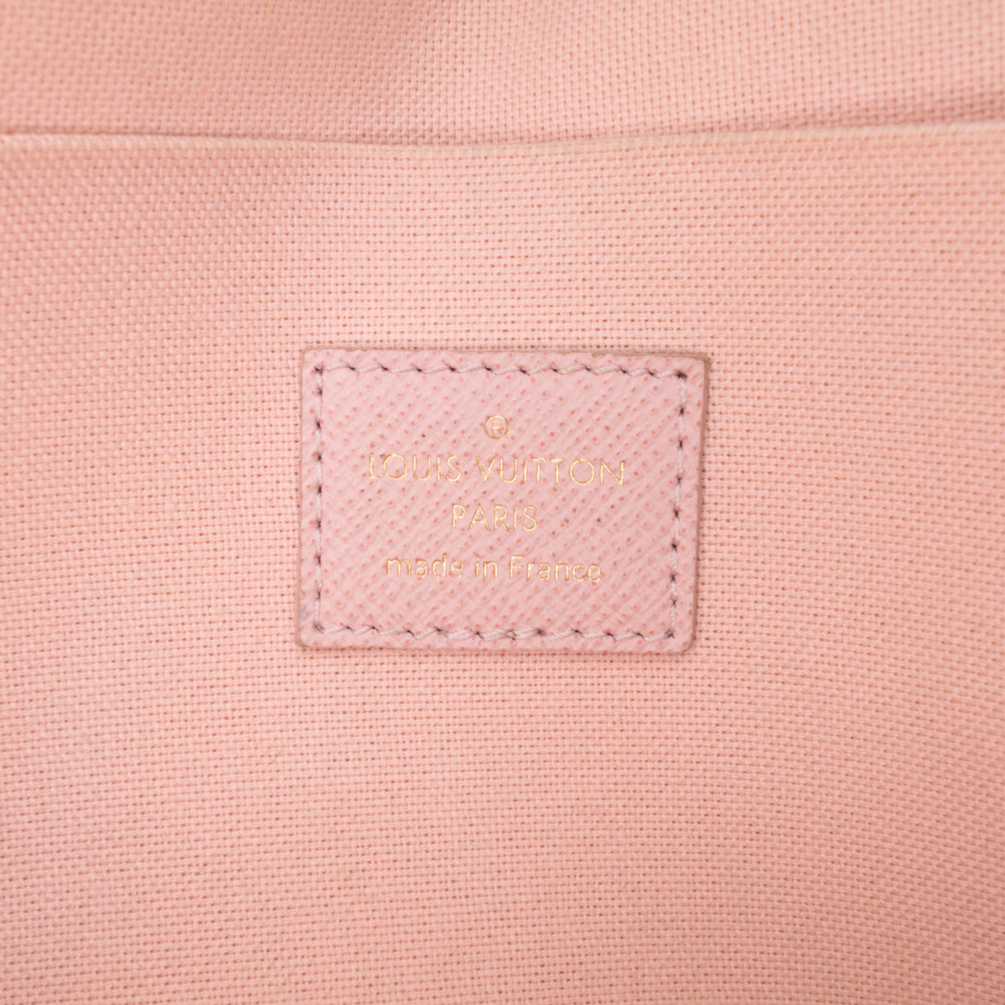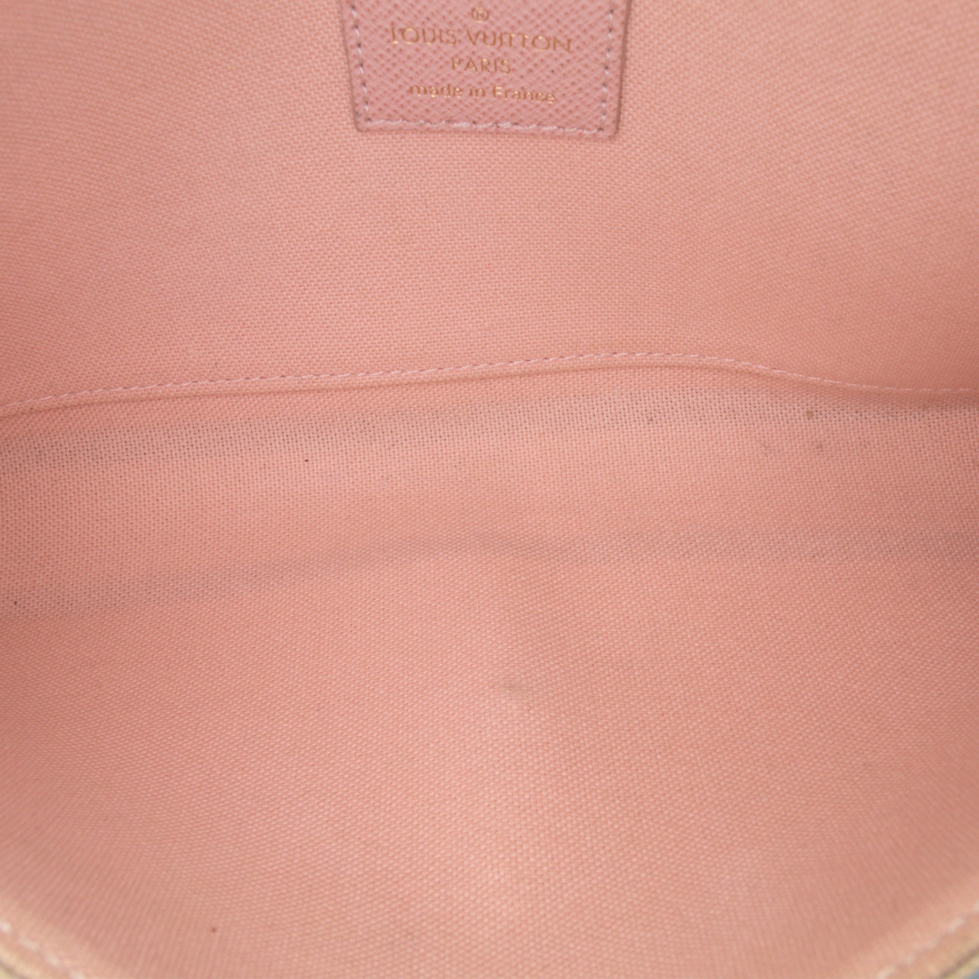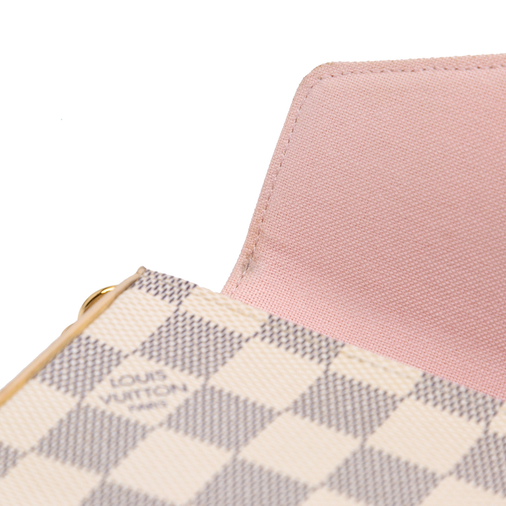 The Pochette Felicie crossbody bag features a damier azur canvas body, a detachable chain-link shoulder strap, a front flap with snap button closure, an interior slip pocket, and detachable pouch inclusions. Retail Price: 2145.00