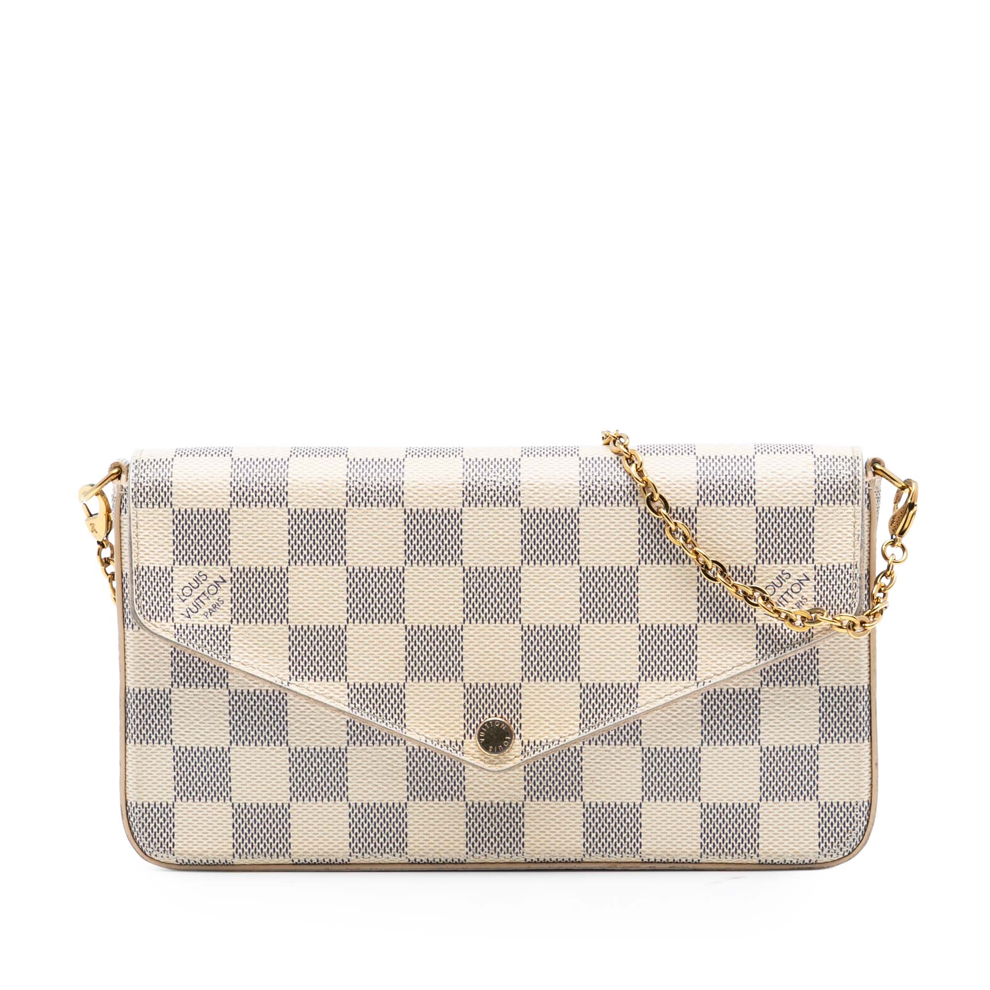 The Pochette Felicie crossbody bag features a damier azur canvas body, a detachable gold-tone chain shoulder strap, a top flap with snap button closure, an interior slip pocket, and a pouch inclusion. Retail Price: 2145.00