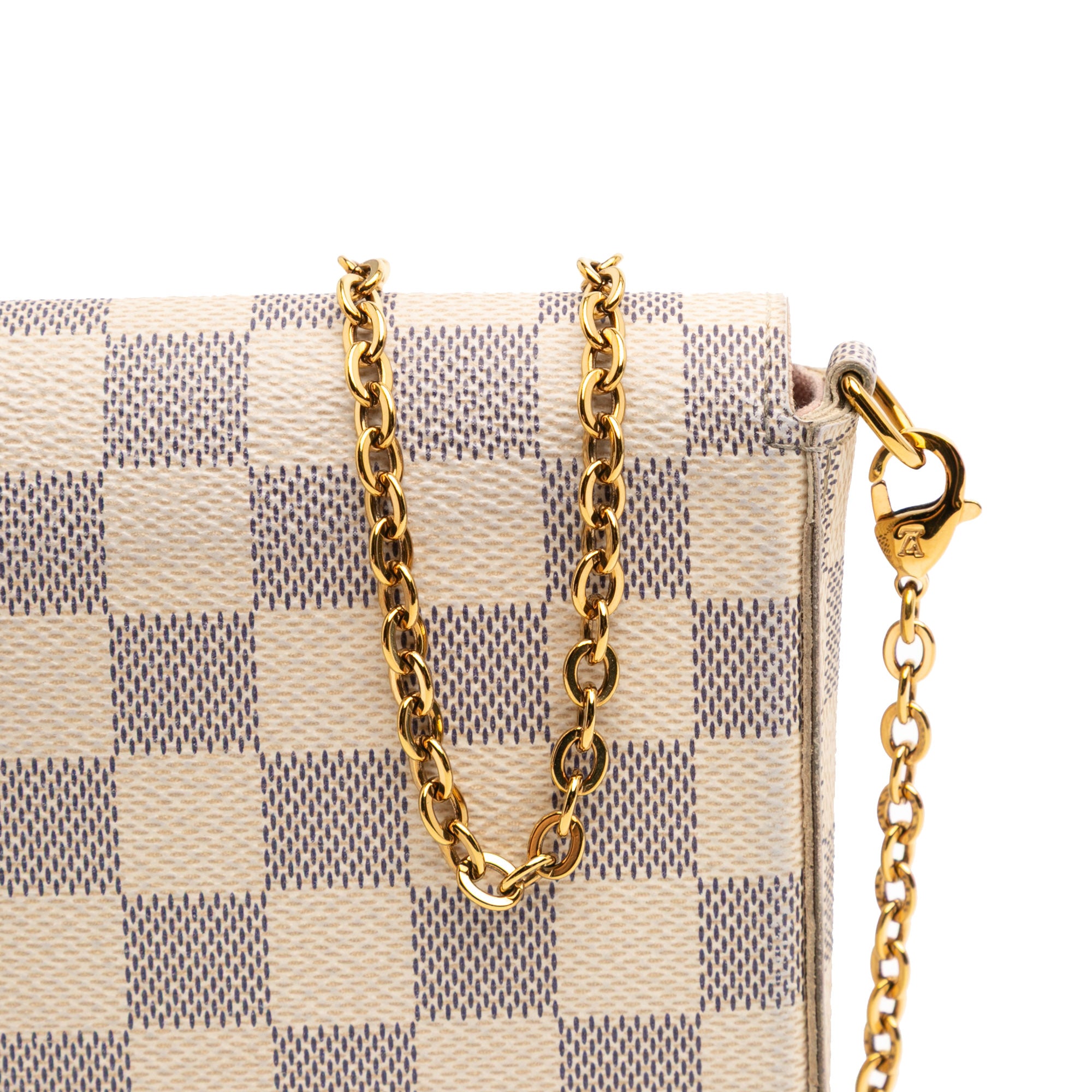 The Pochette Felicie crossbody bag features a damier azur canvas body, a detachable gold-tone chain link shoulder strap, a front flap with magnetic snap closure, an interior slip pocket, and pouch inclusions. Retail Price: 1550.00