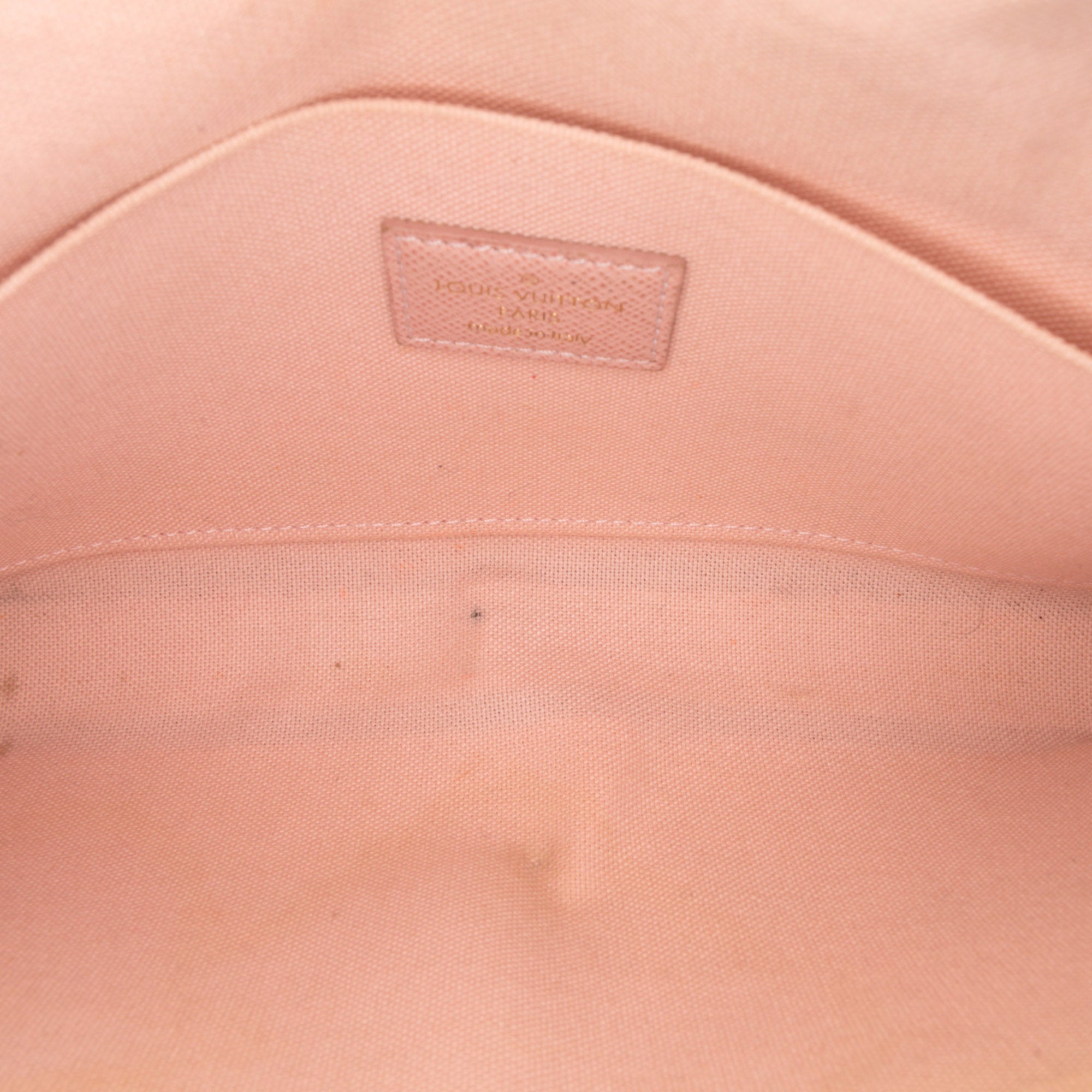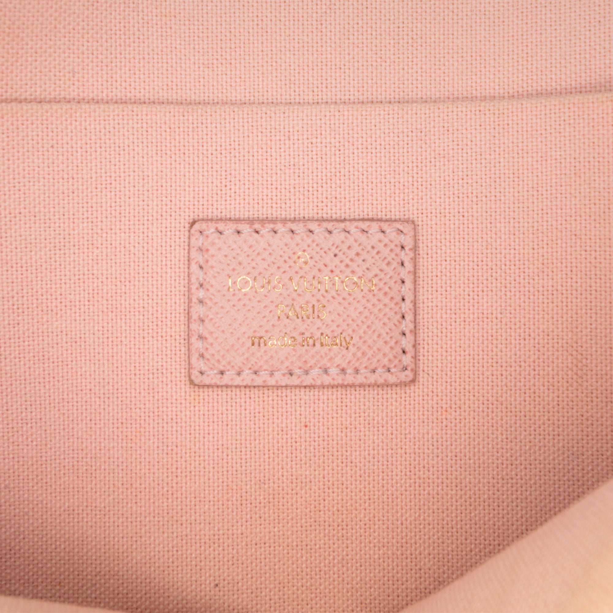 The Pochette Felicie crossbody bag features a damier azur canvas body, a detachable gold-tone chain shoulder strap, a top flap with snap button closure, and an interior slip pocket. Retail Price: 2145.00