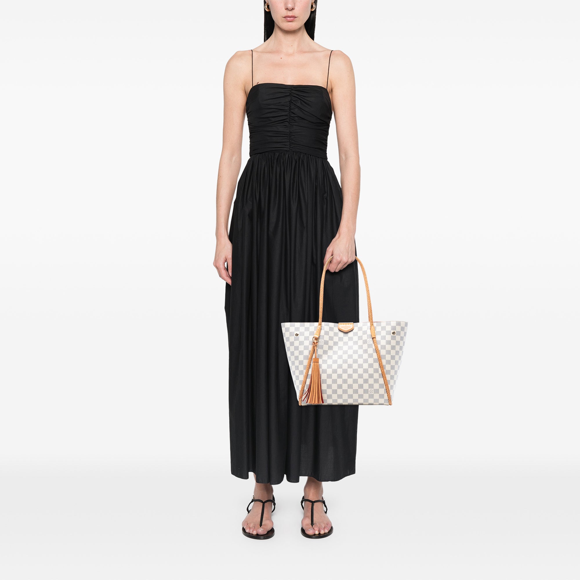The Propriano features a damier azur canvas body with vachetta leather trim, a vachetta leather tassel detail, woven vachetta leather straps, an open top with magnetic snap closure, and an interior zip pocket. Retail Price: 2440.00