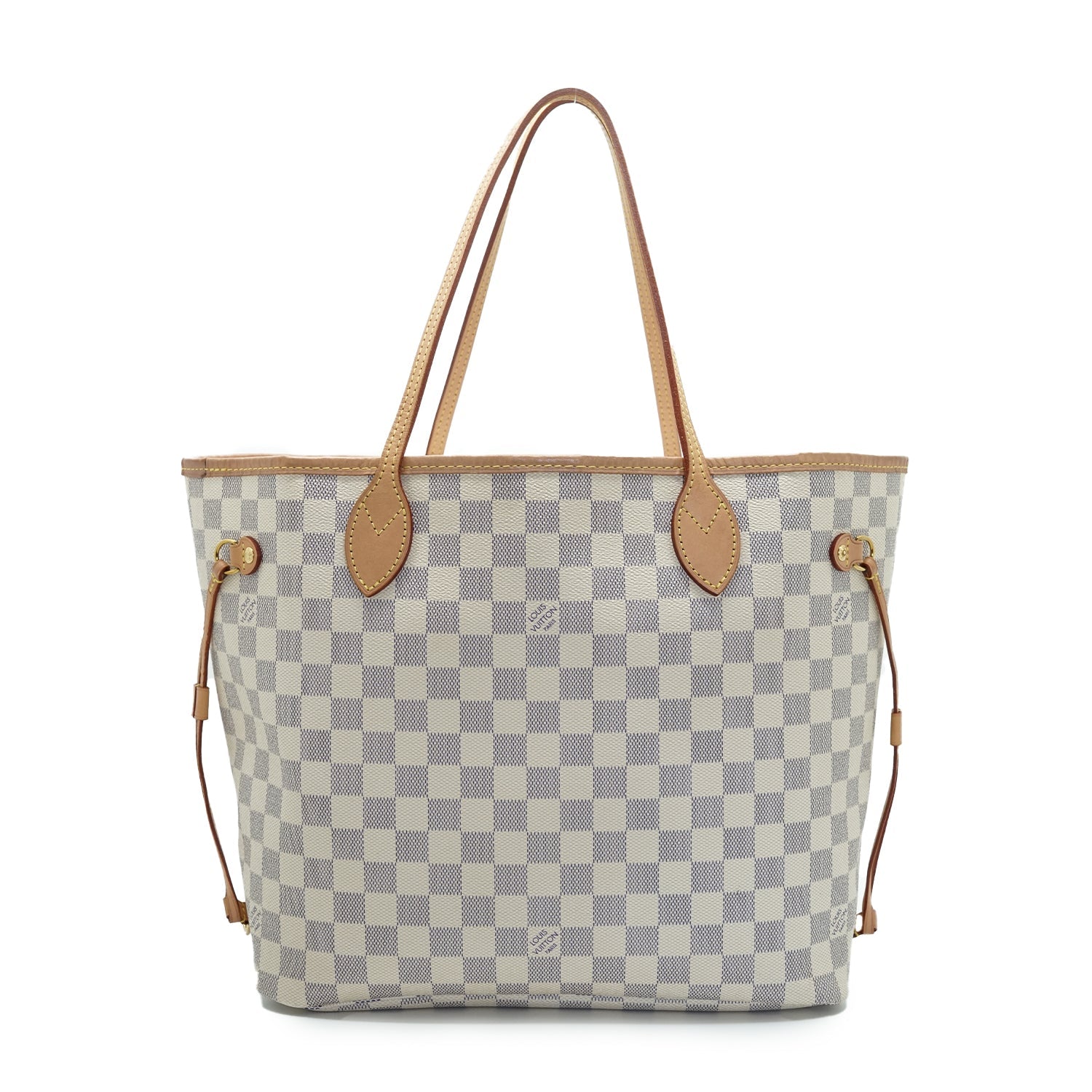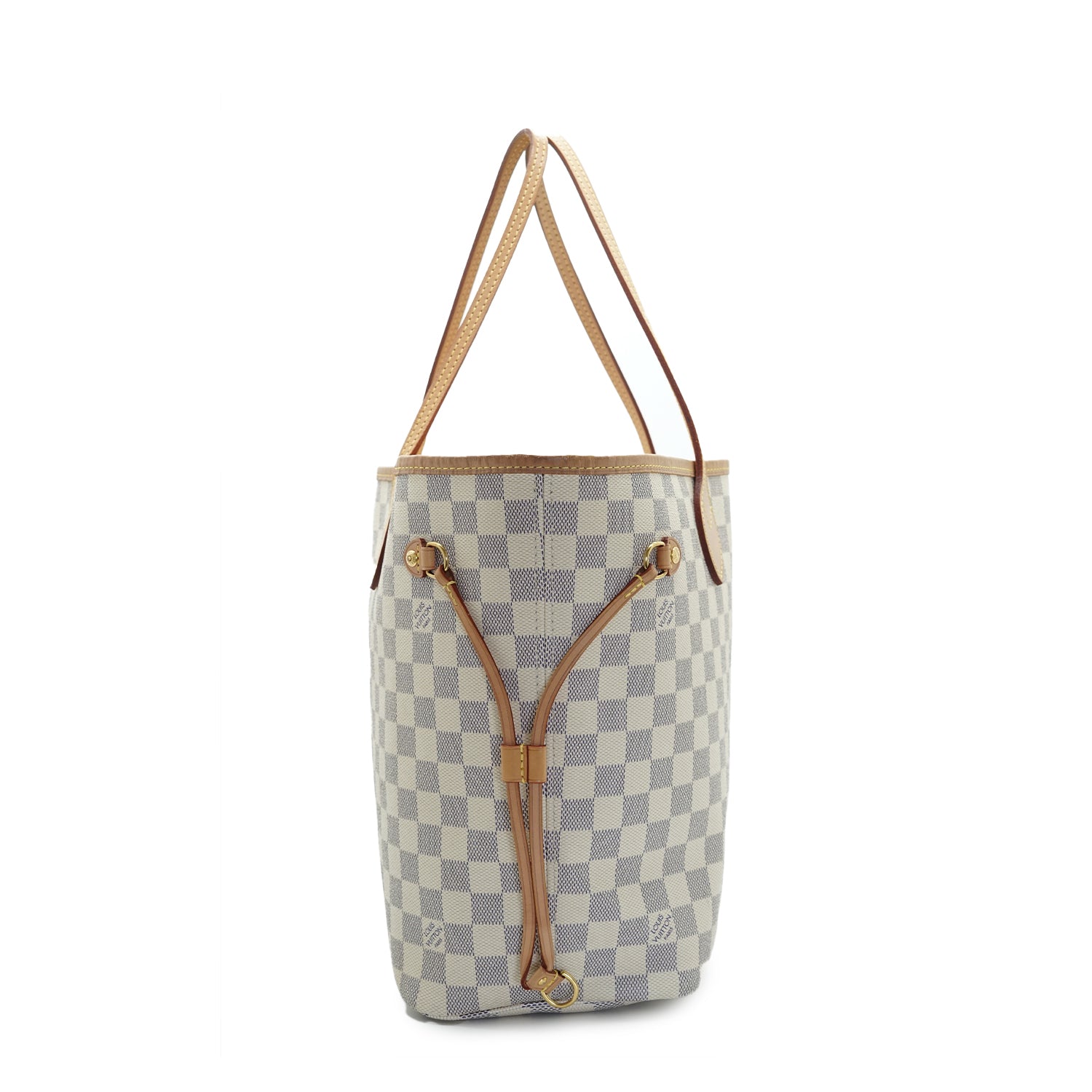 Damier Azur Rose Ballerine Neverfull MM White/Light pink Canvas, LeatherDepth: 15.5cmHeight: 28cmWidth: 31.5cmWidth at Top: 47cmHand Drop: 21cmStain: Stains throughout the inside, pen mark on the small pouch, minor black stains on the outside canvas (bottom)Discoloration: Some hardware tarnish, some discoloration on the leather parts (top leather trim)Peeling: Some leather cracking along the side drawstring straps, with some leather dryness Include: Small pouch, model tag, store receiptSerial code: AR3280