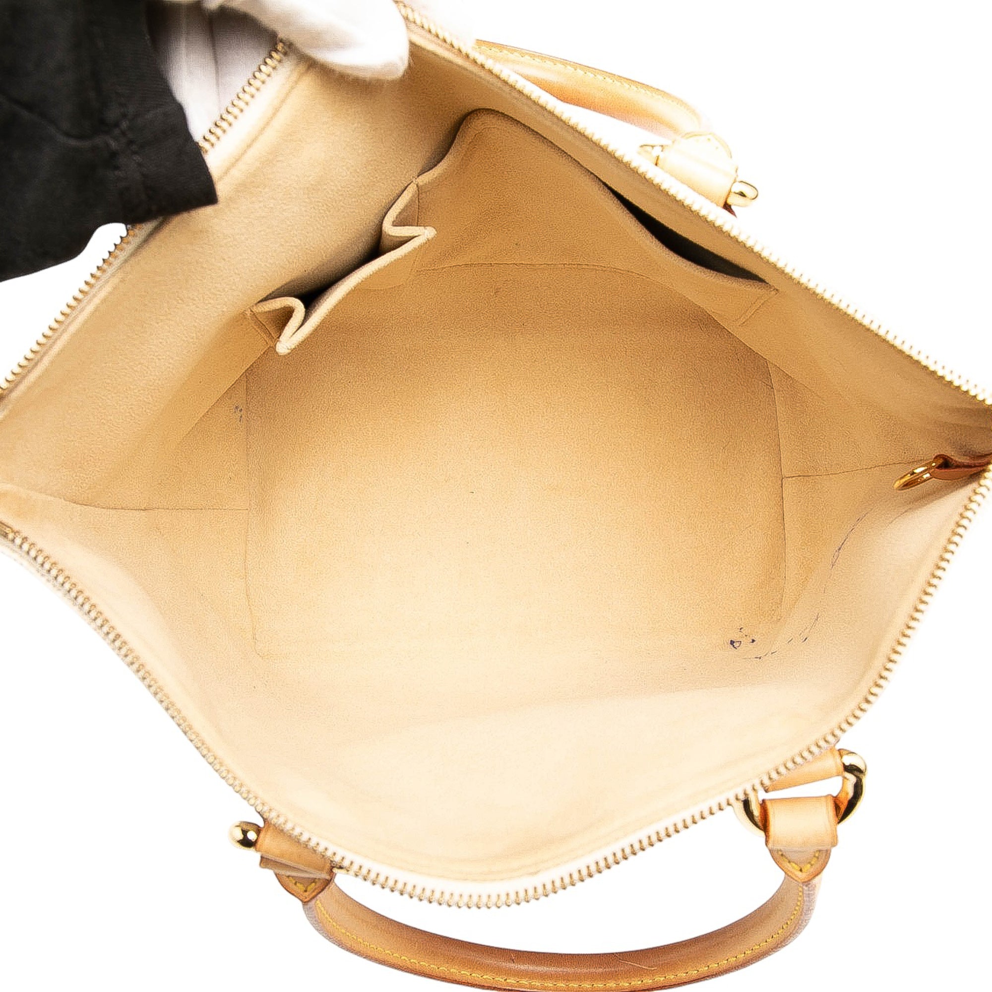 The Saleya PM features a damier azur canvas body, rolled vachetta leather handles, a top zip closure, and interior slip pockets. Retail Price: 1690.00