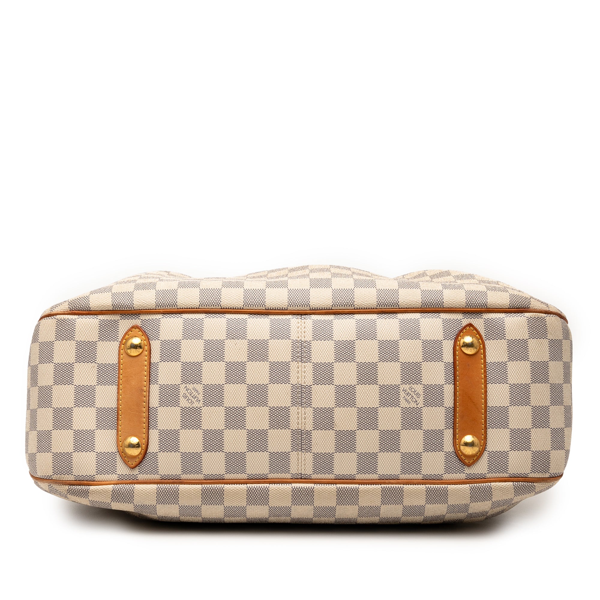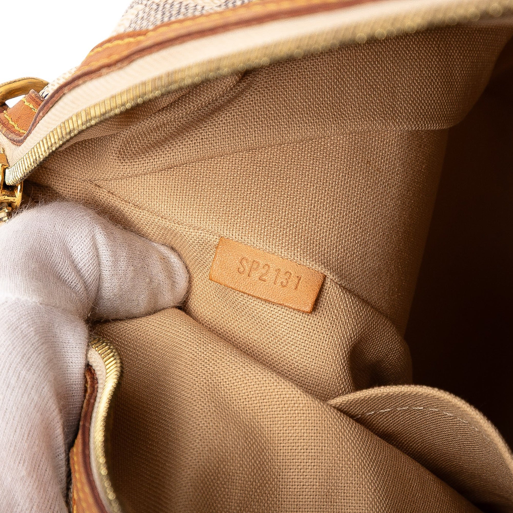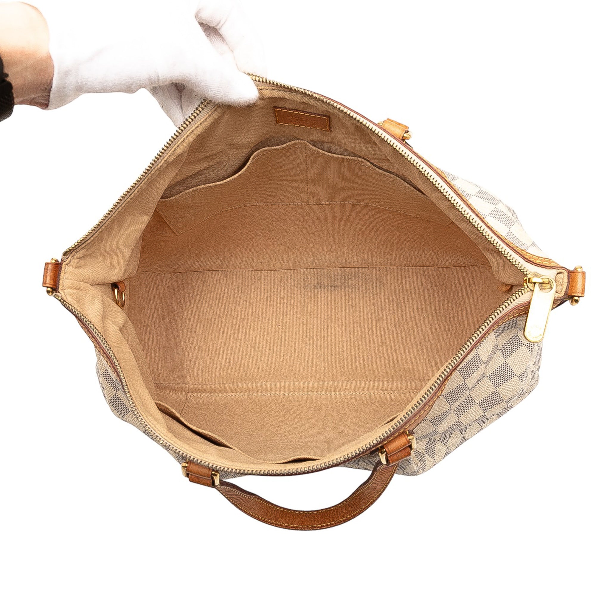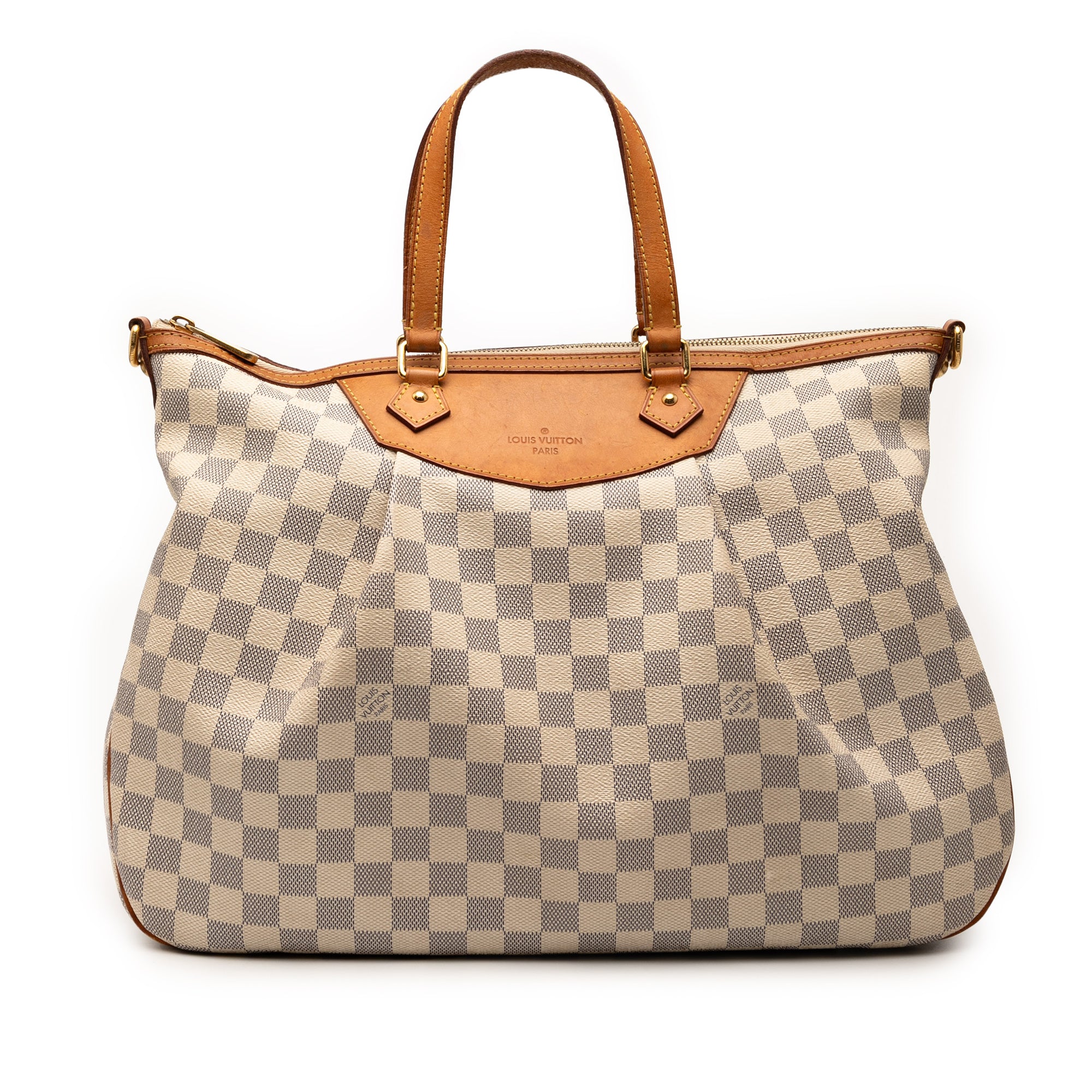 The Siracusa GM features a damier azur canvas body with vachetta leather trim, flat vachetta leather handles, a top zip closure, and interior slip pockets. Retail Price: 1810.00