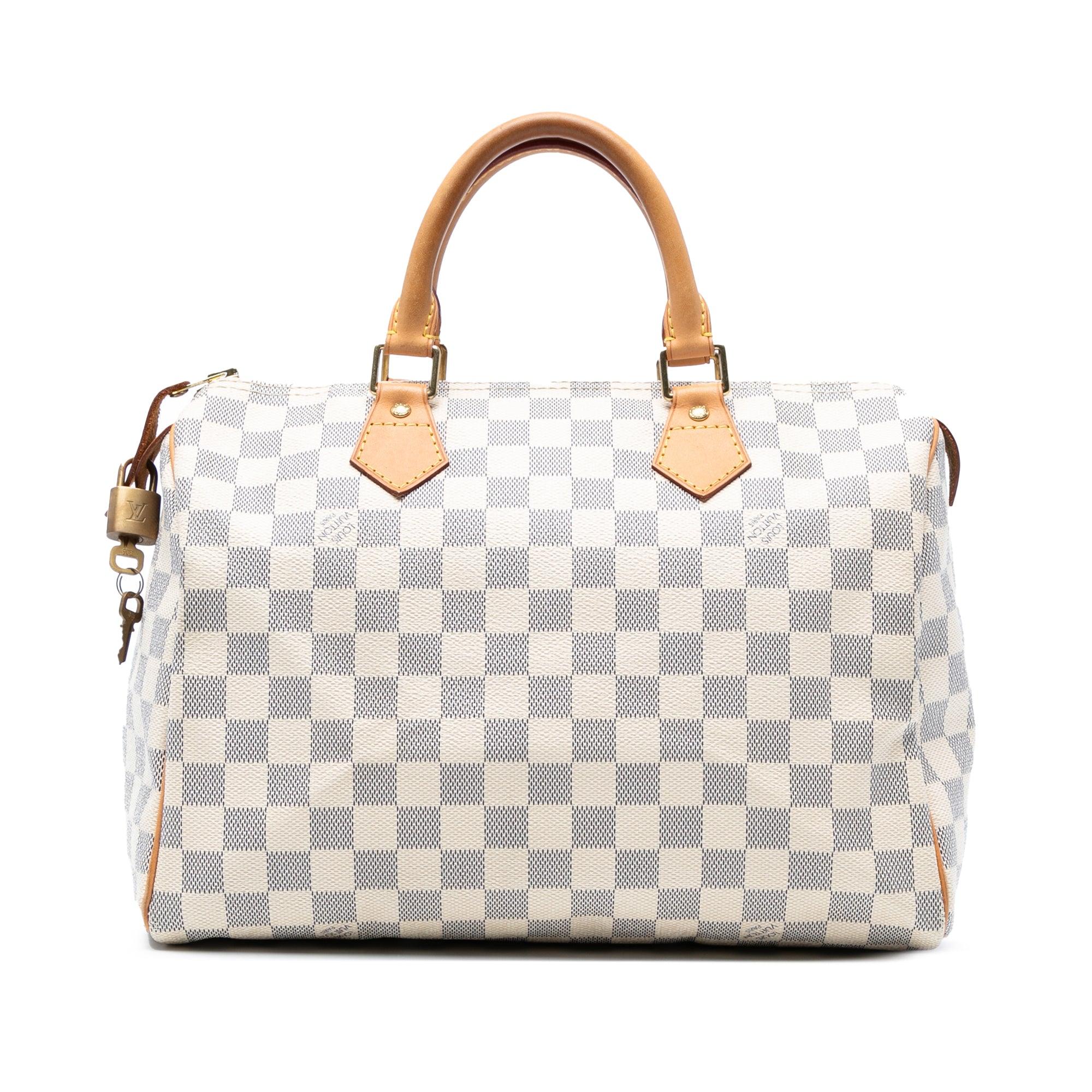 The Speedy 30 features a damier azur canvas body, rolled vachetta leather handles, a top zip closure, and an interior pocket. Retail Price: 1630.00