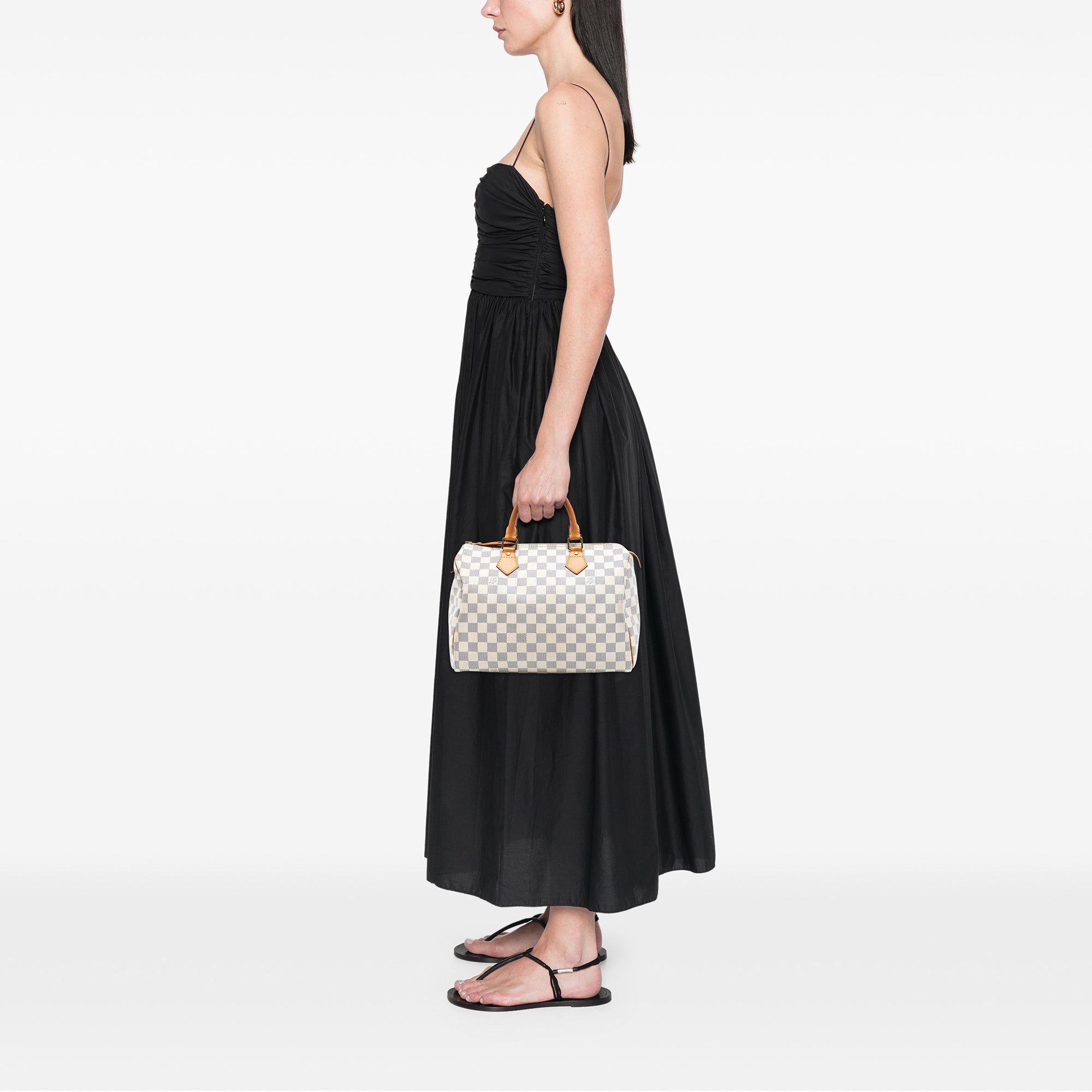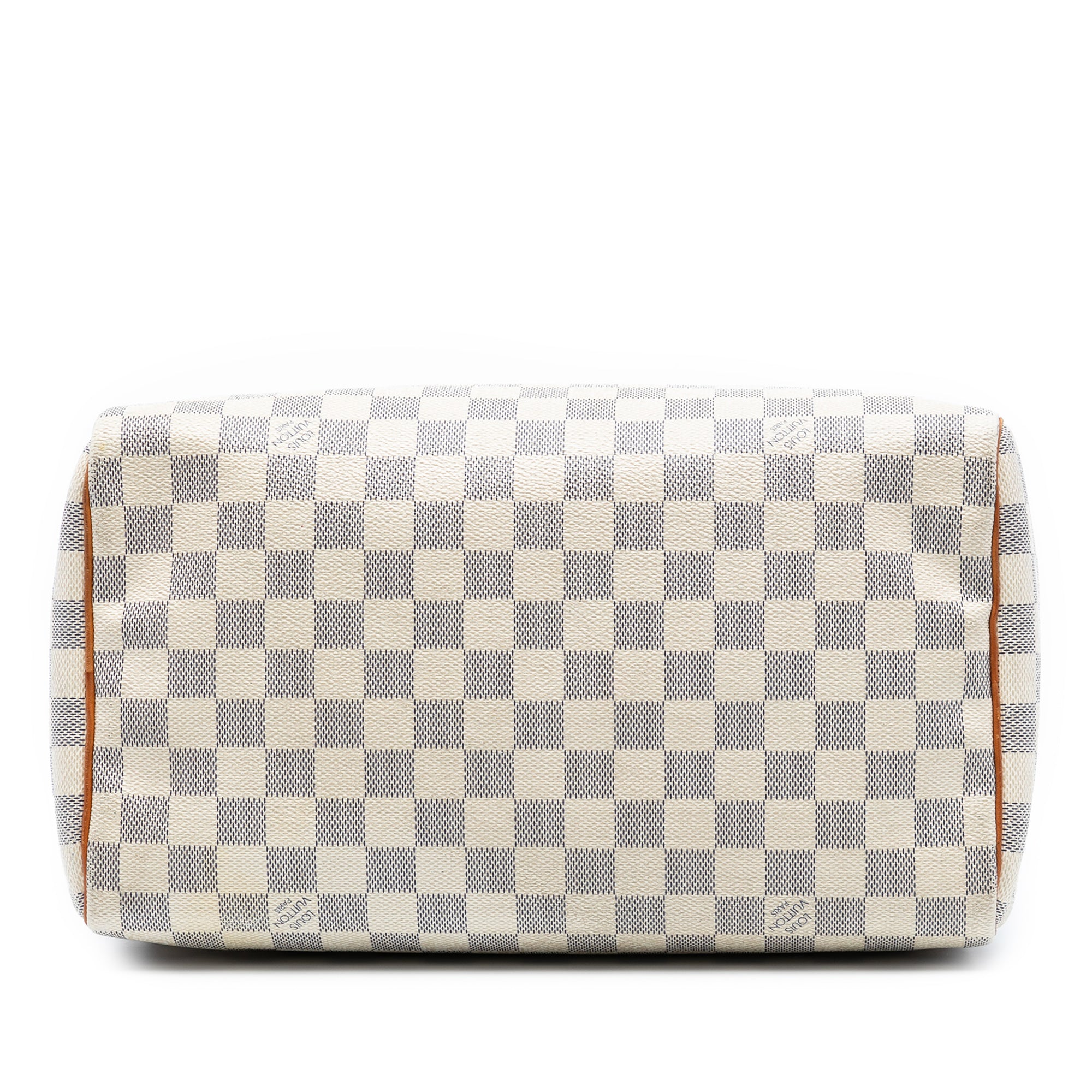The Speedy 30 features a damier canvas body, rolled vachetta leather handles, a top zip closure, and an interior pocket. Retail Price: 1630.00