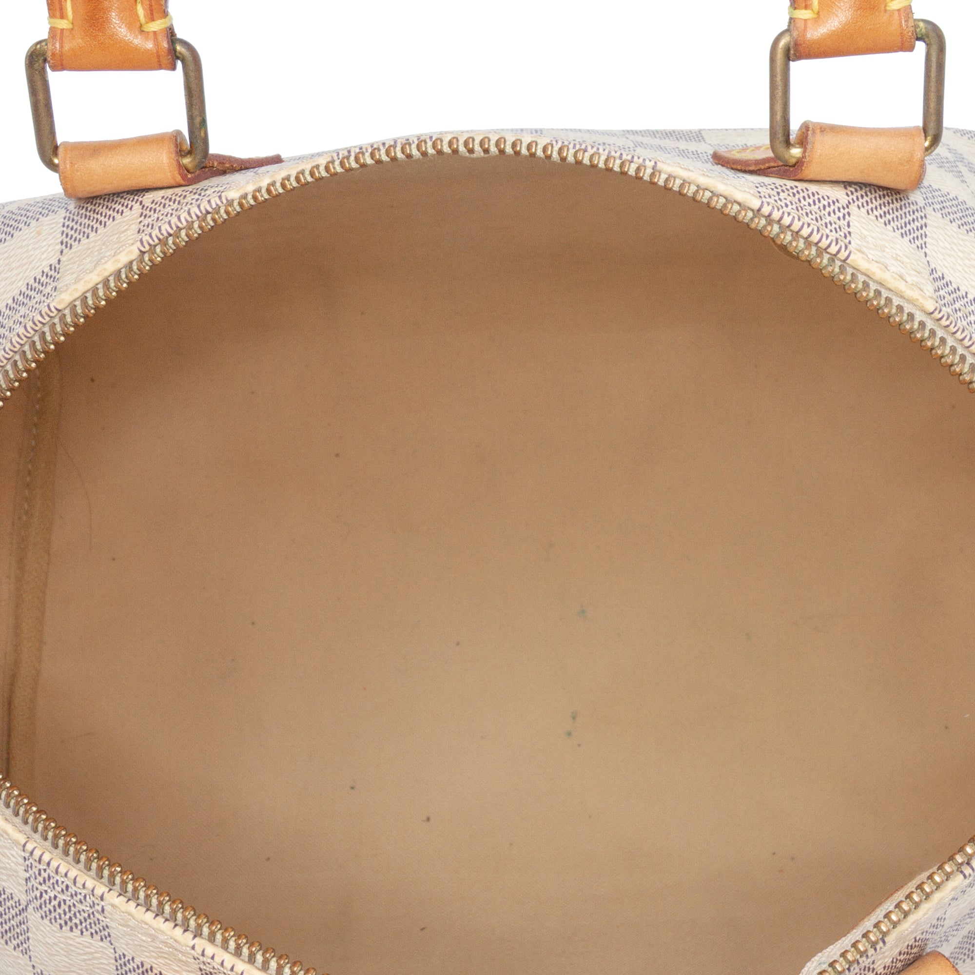 The Speedy 30 features a damier canvas body with vachetta leather trim, rolled vachetta leather handles, a top zip closure, and an interior pocket. Retail Price: 1590.00