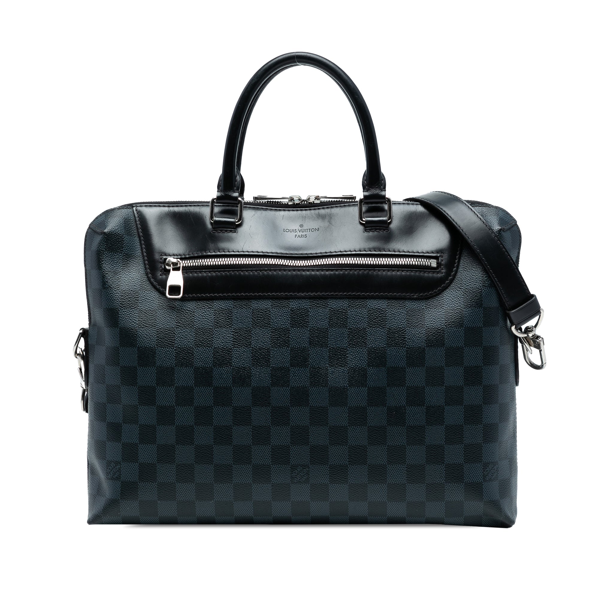 The Porte Documents Jour features a damier cobalt canvas body with leather trim, rolled leather handles, a detachable leather strap, a top zip closure, an exterior front zip pocket, and interior slip pockets. Retail Price: 1650.00