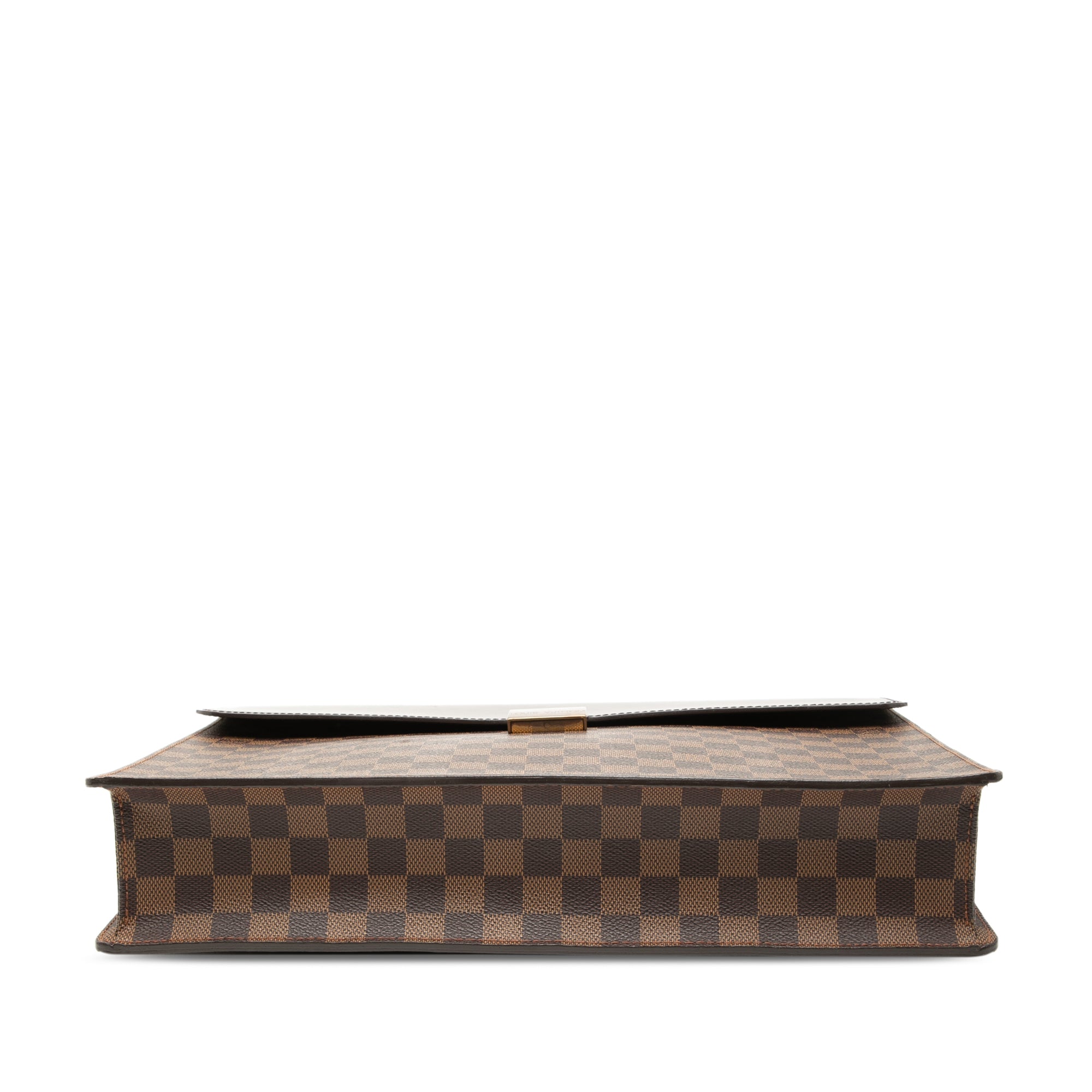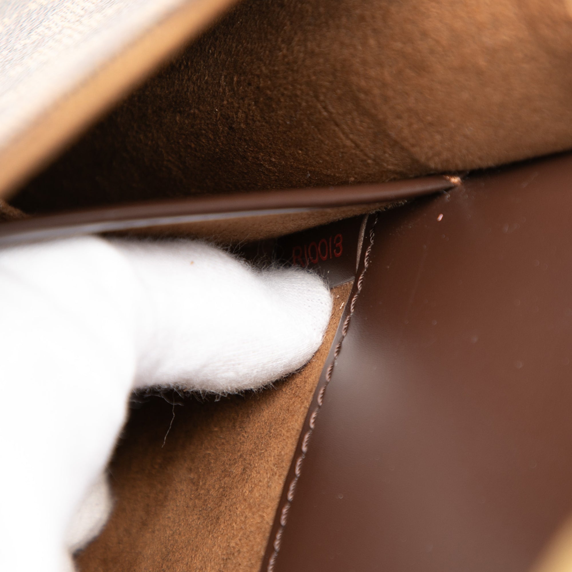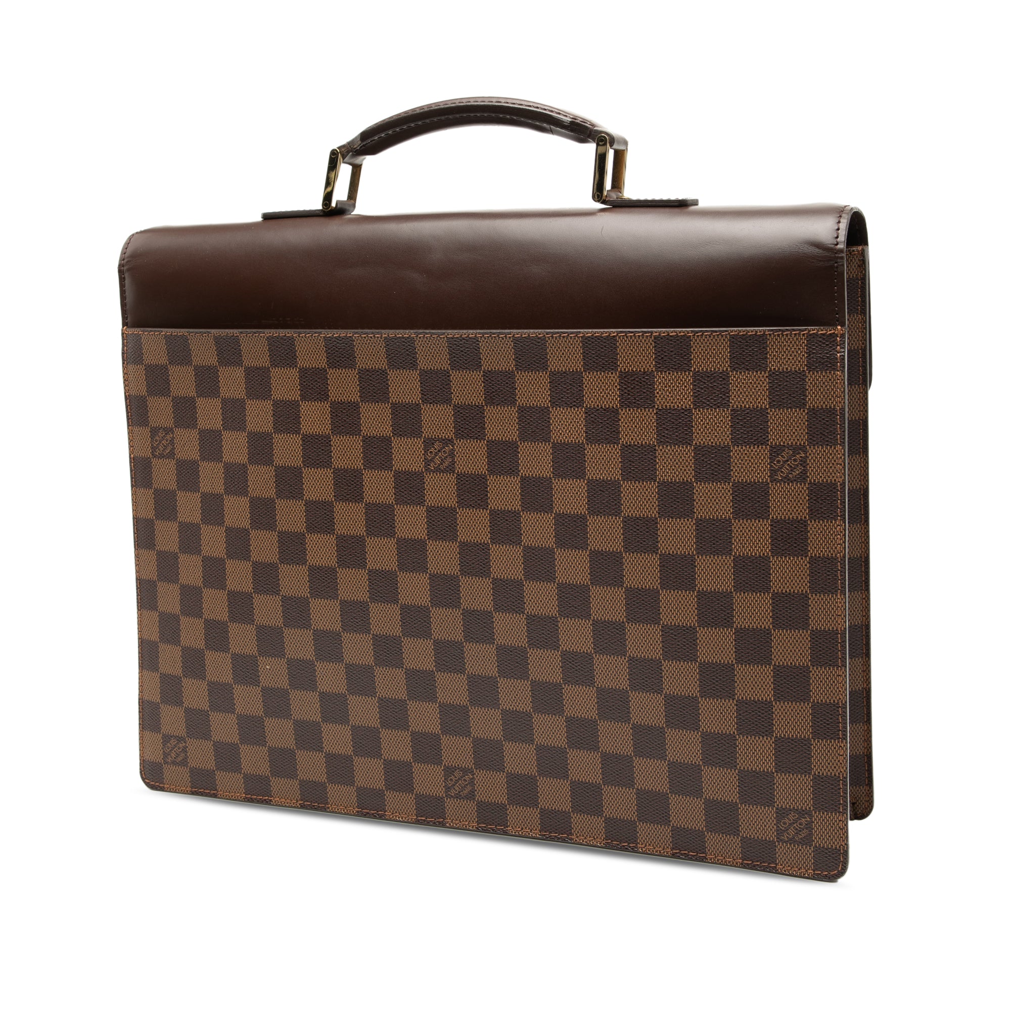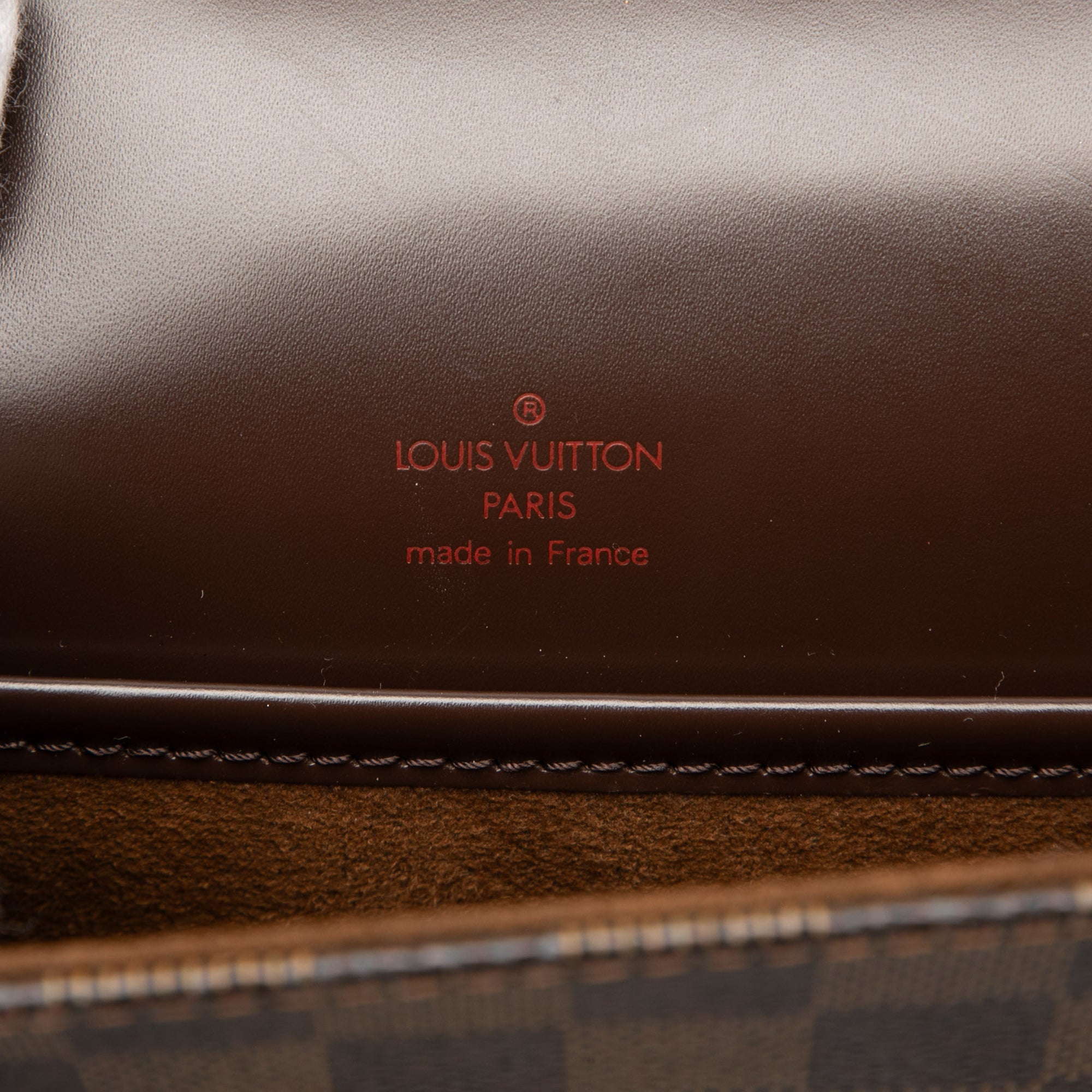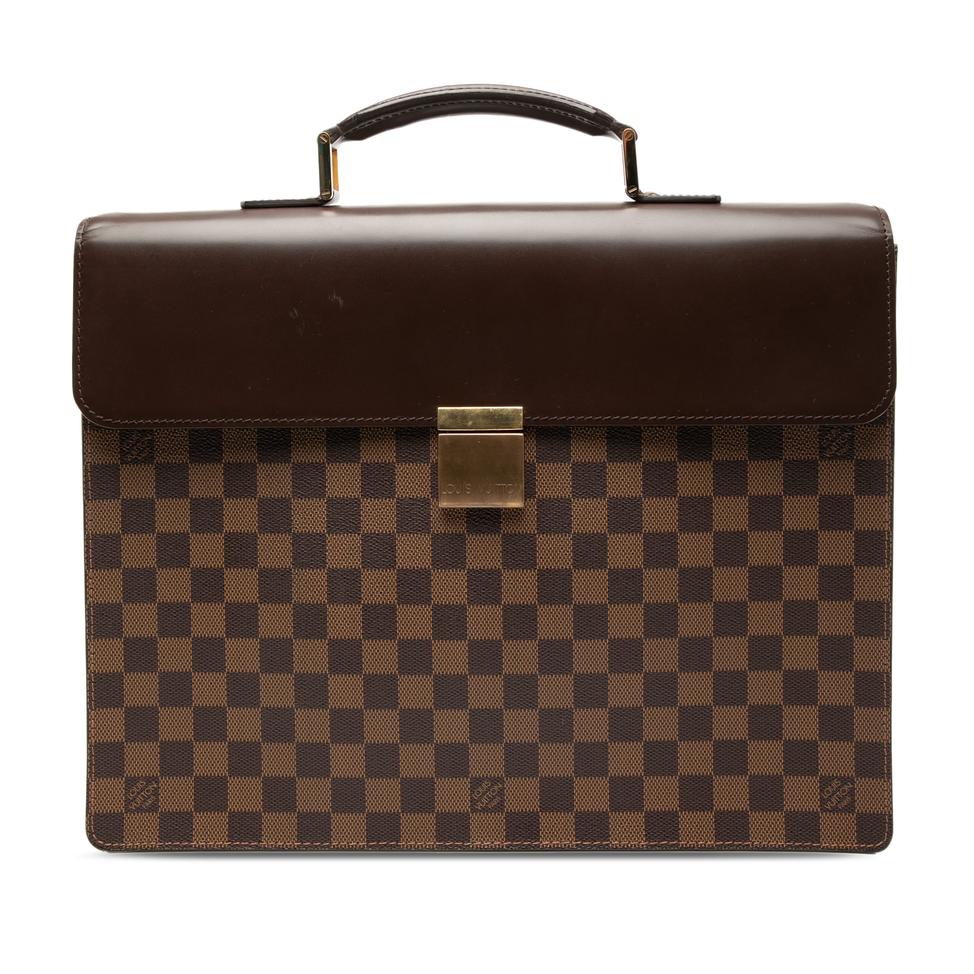 The Altona PM features a damier ebene canvas body with leather trim, a flat leather handle, a front flap with push lock closure, and interior slip pockets. Retail Price: 990.00