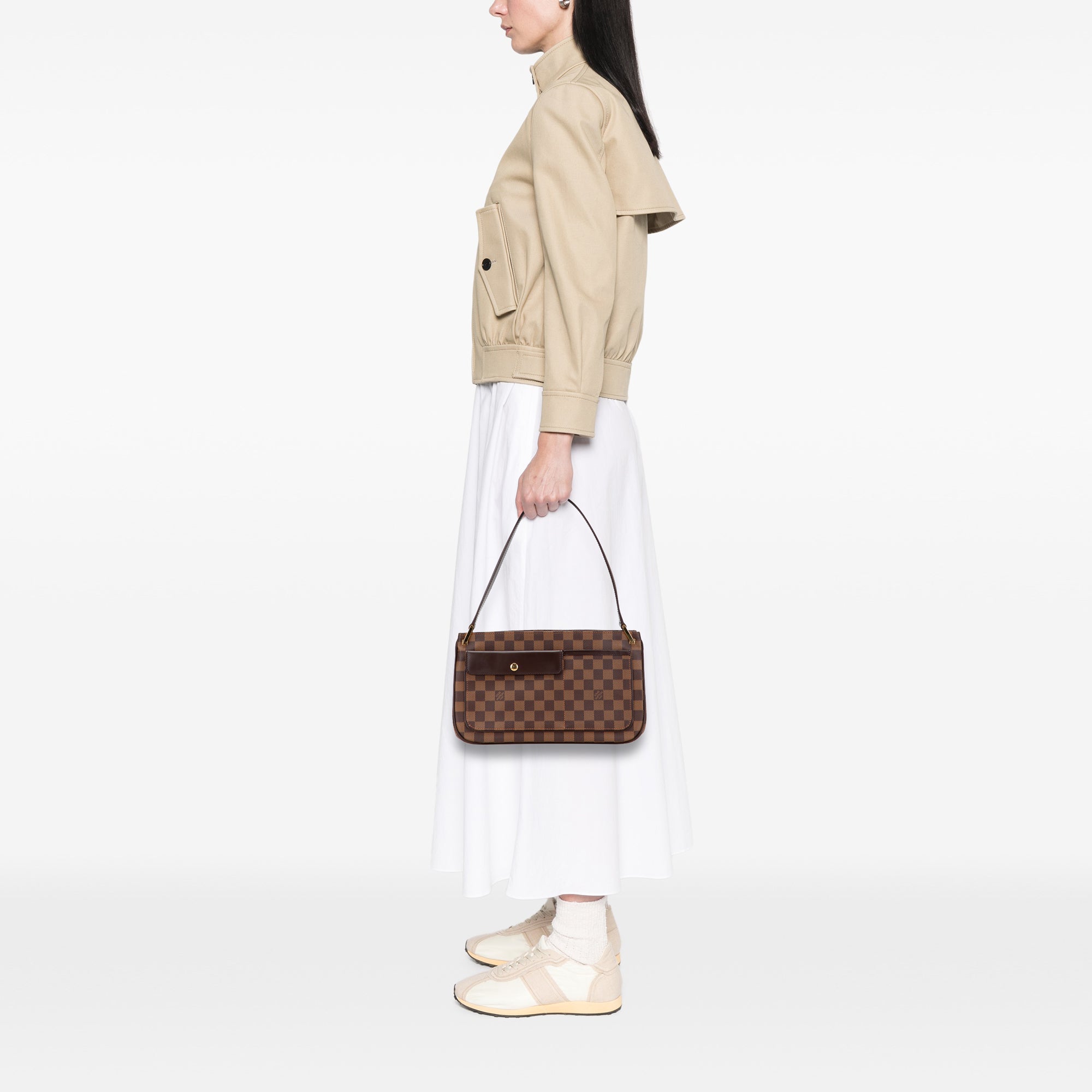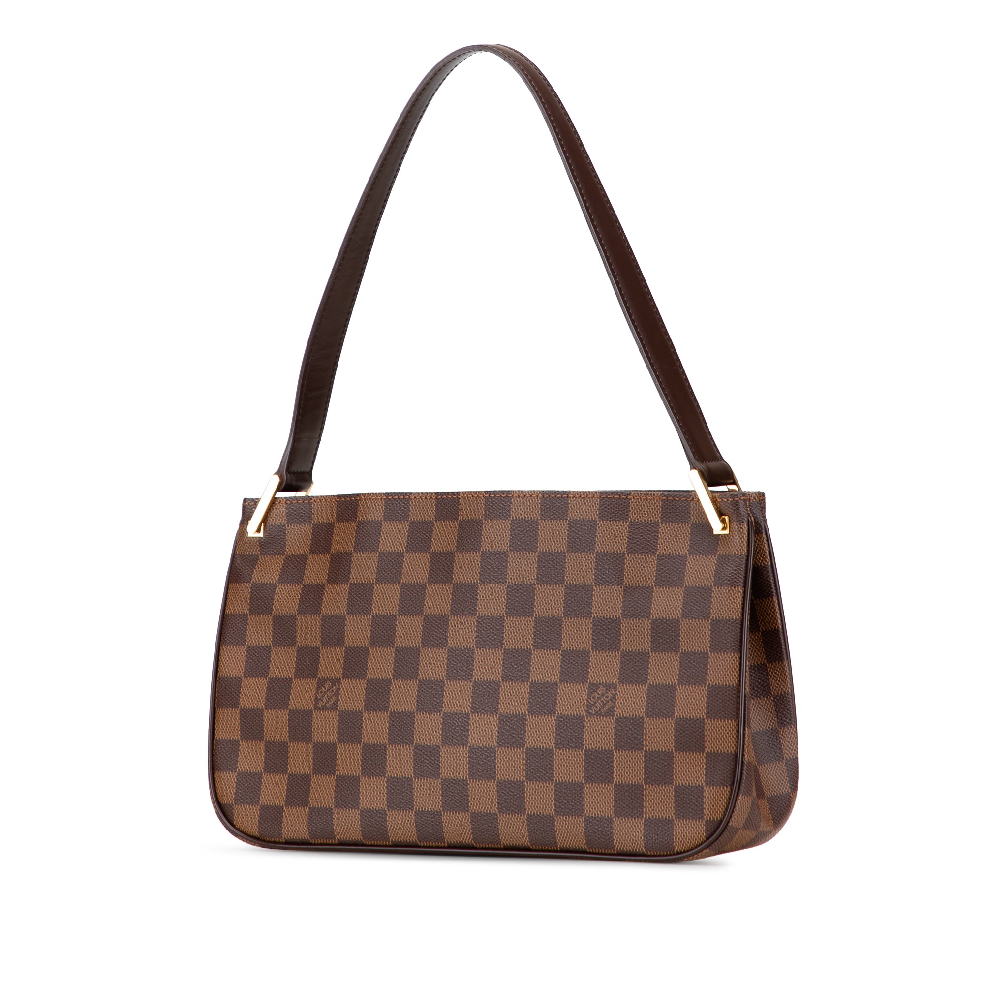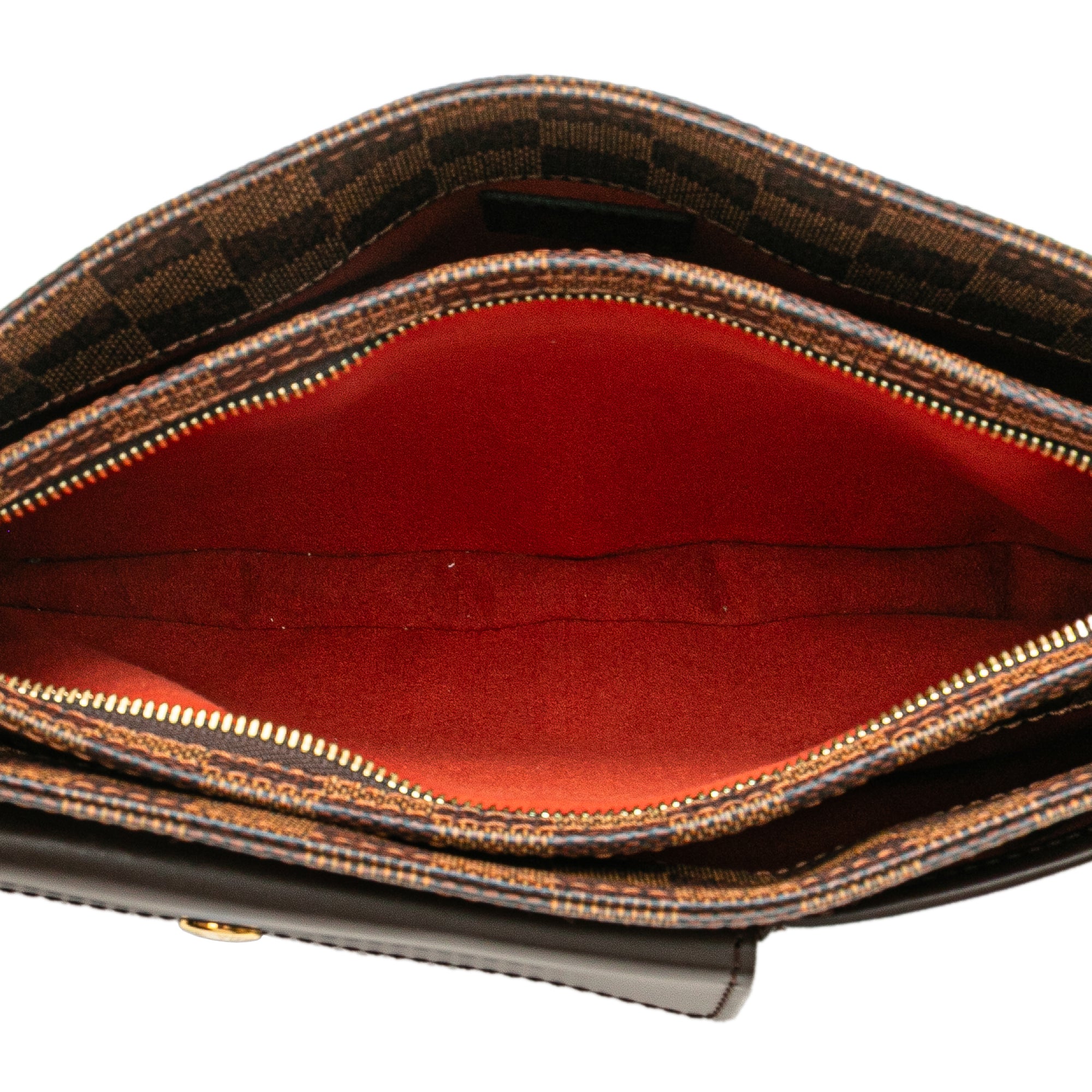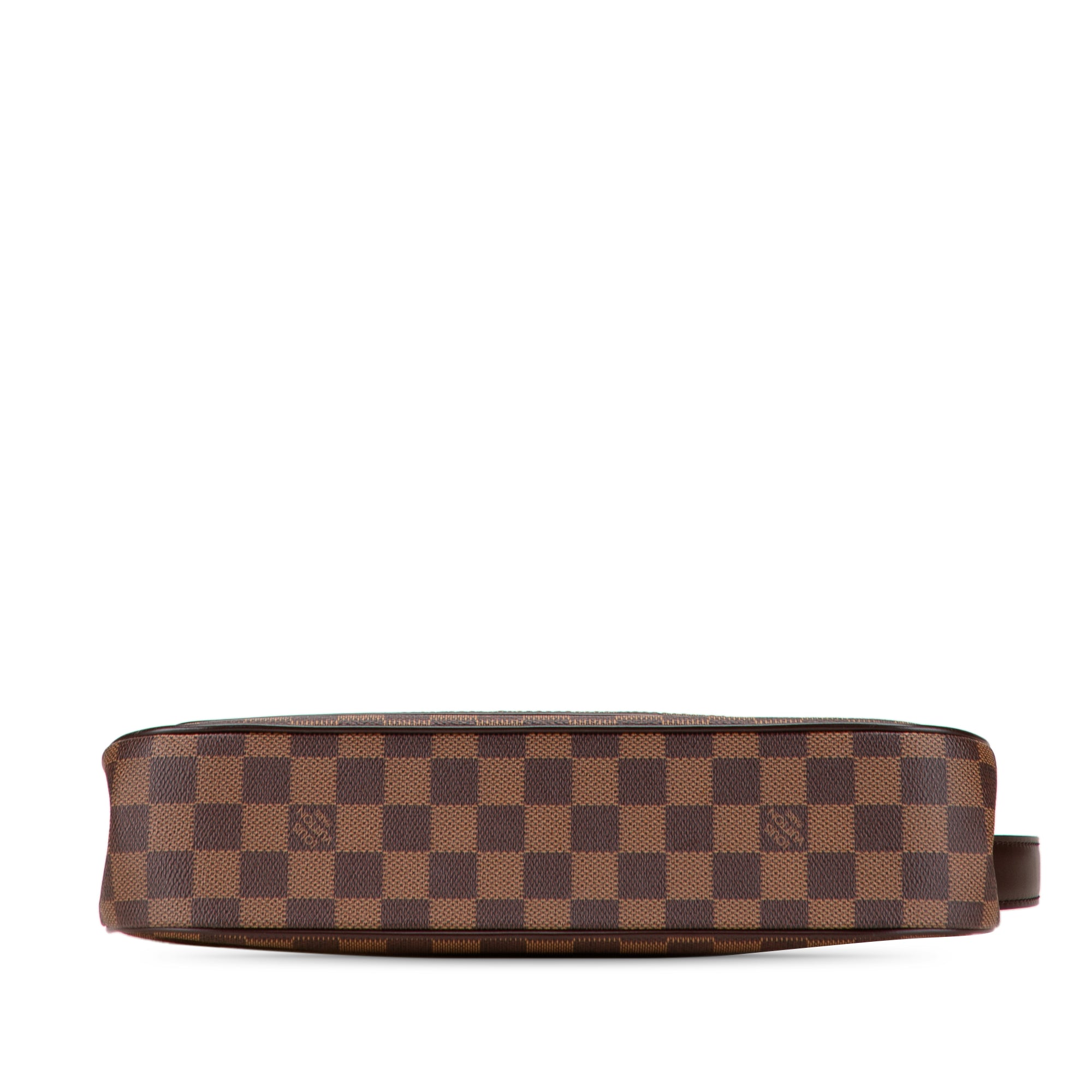 The Aubagne features a damier canvas body with a leather trim, a flat leather strap, a top zip closure, exterior slip compartments, and exterior flap and slip pockets. Retail Price: 1820.00
