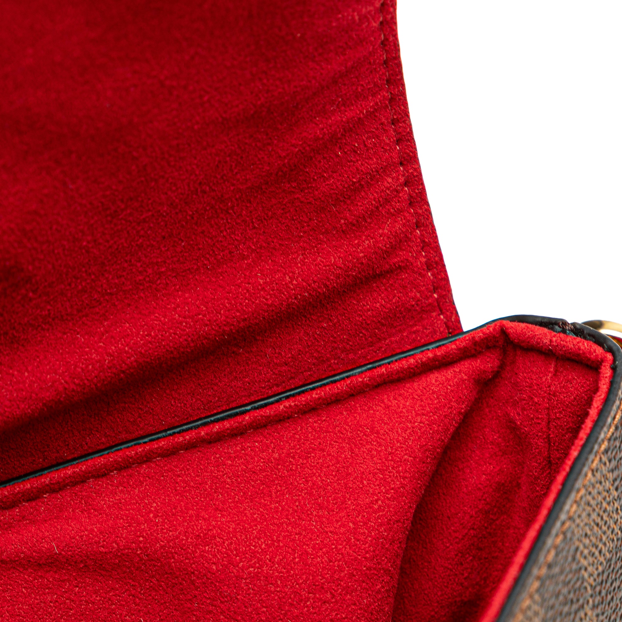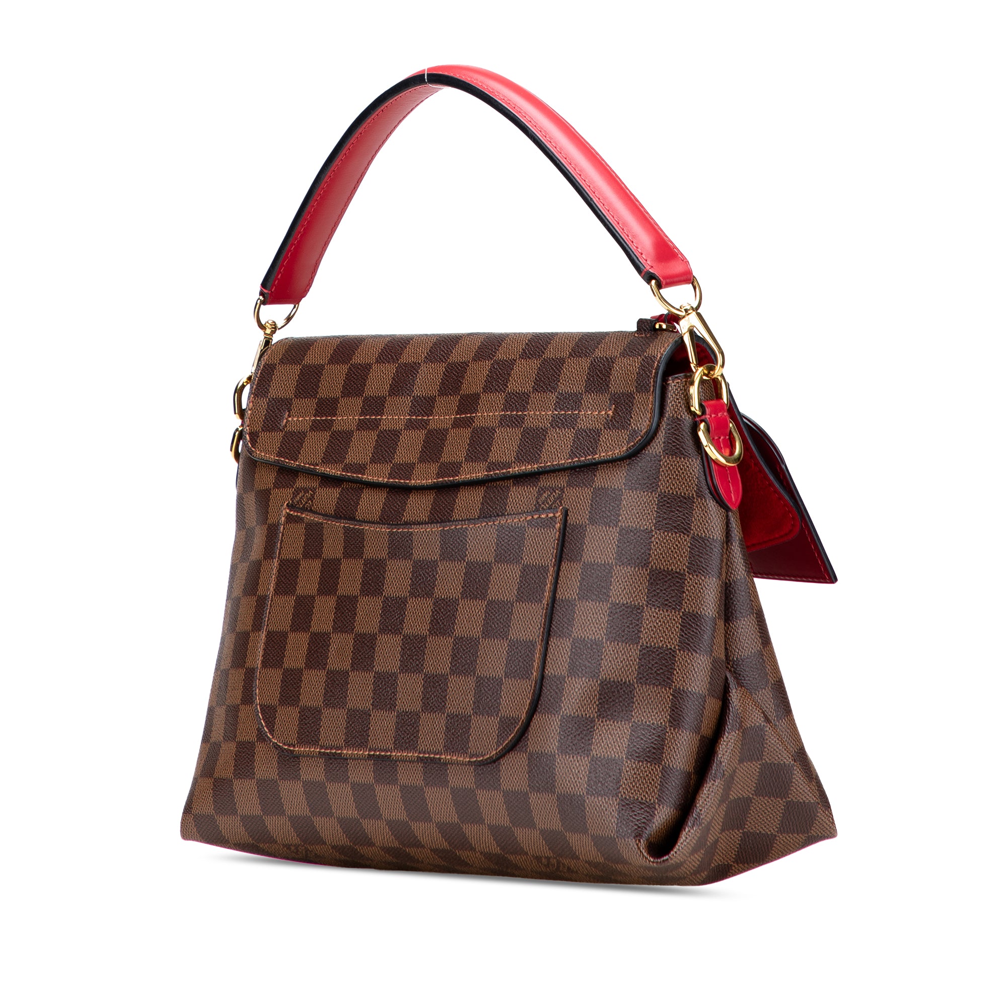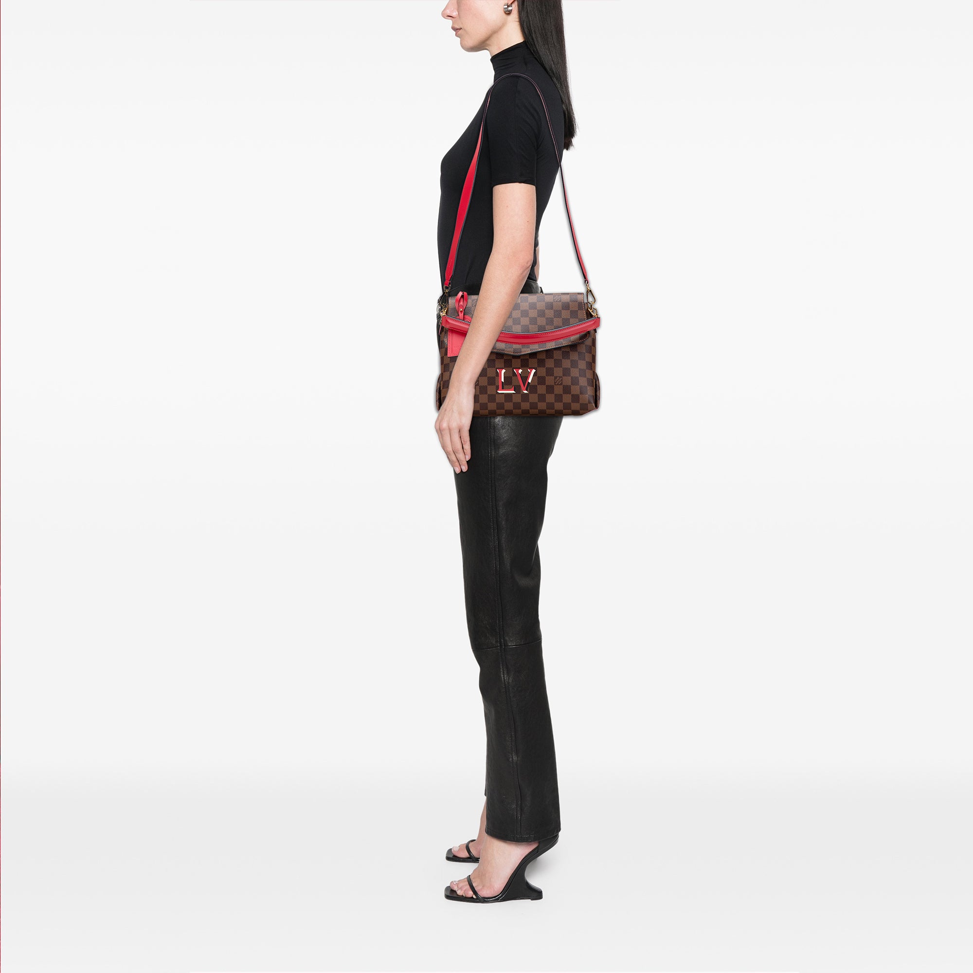 The Beauborg MM satchel features a damier ebene canvas body, a flat leather top handle, a detachable flat leather strap, a front flap with magnetic snap closure, an exterior back slip pocket, and an interior slip pocket. Retail Price: 2090.00
