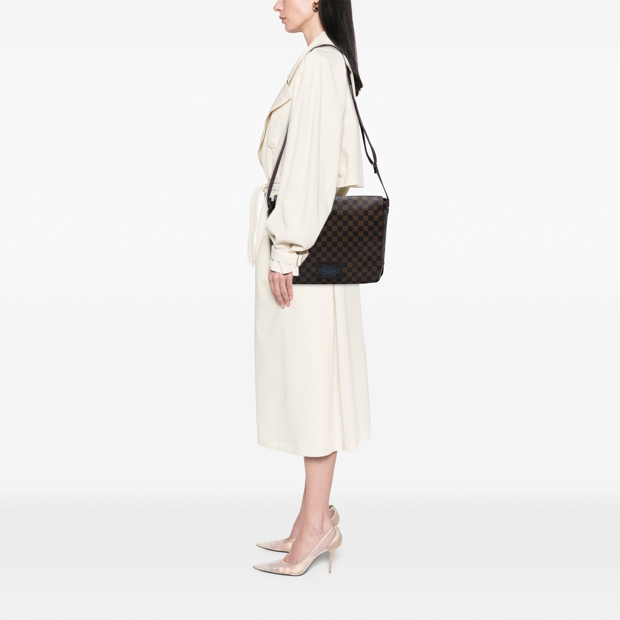 The Brooklyn GM features a damier ebene canvas body, an adjustable flat strap, a front flap with magnetic closure, an exterior back zip pocket, and interior slip pockets. Retail Price: 1310.00