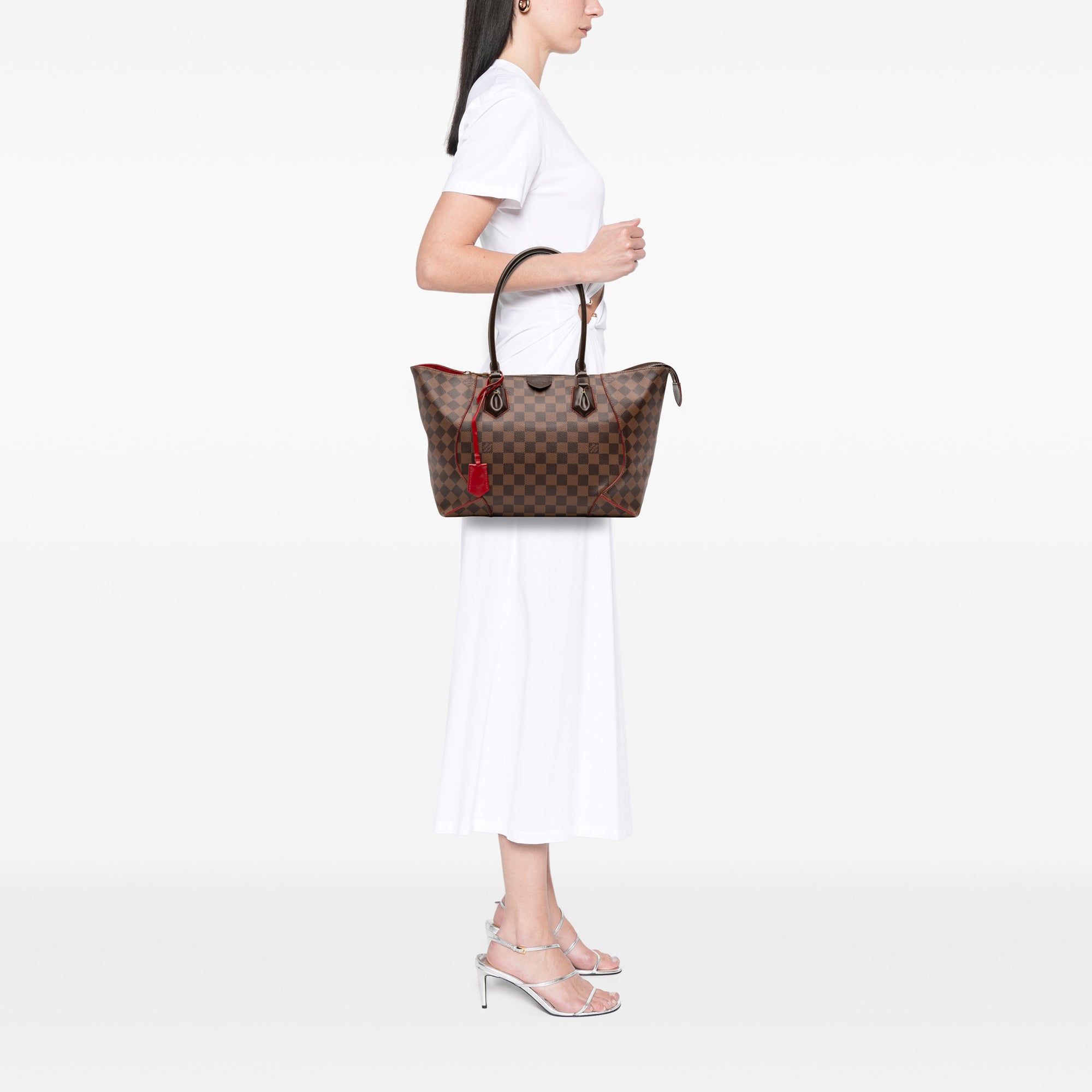 The Caissa MM features a damier ebene canvas body, rolled leather handles, a top zip closure, and interior slip pockets. Retail Price: 2100.00