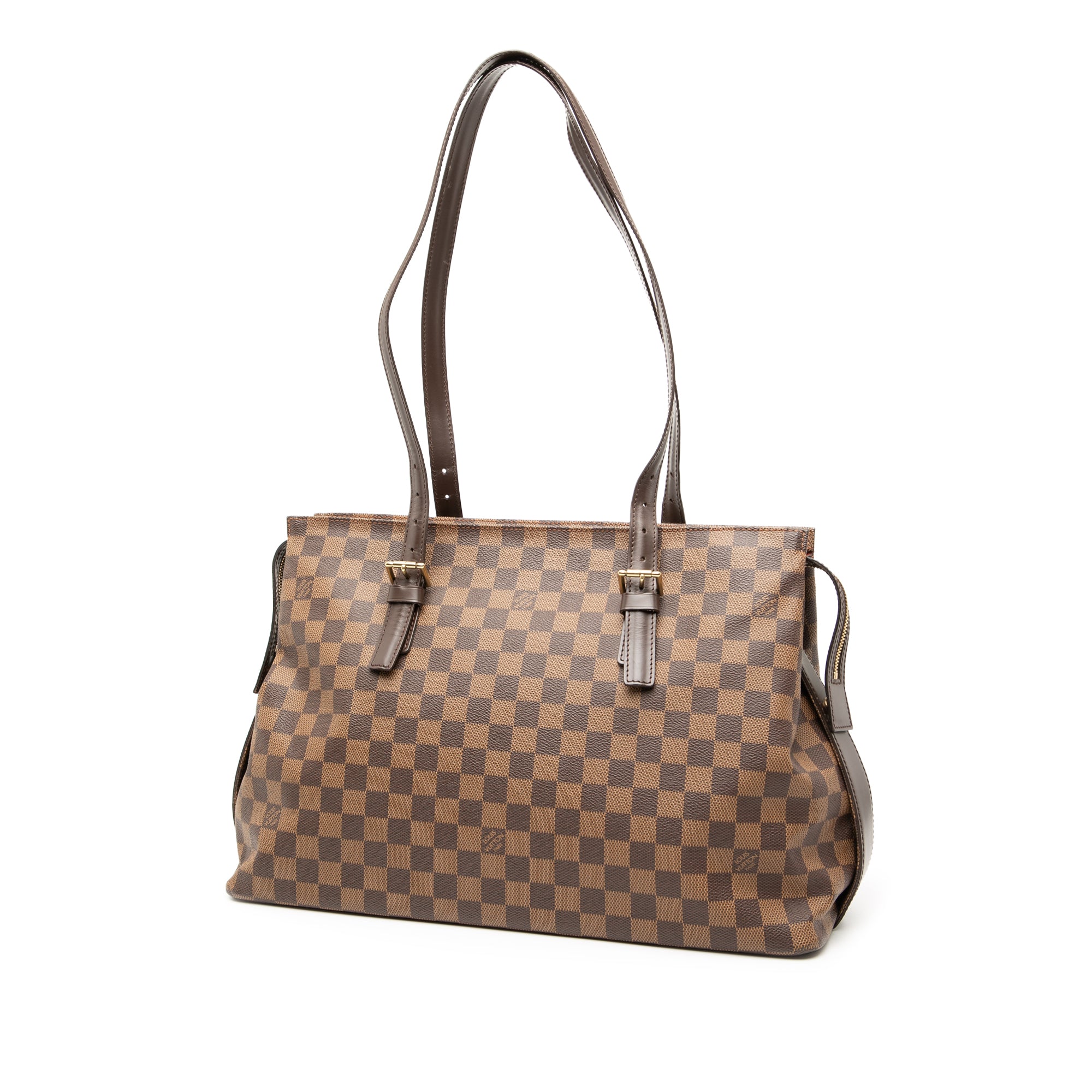 The Chelsea features a damier ebene canvas body with leather trim, flat leather shoulder straps, a top zip closure, and an interior zip pocket. Inclusion: Dust bag. Retail Price: 1395.00