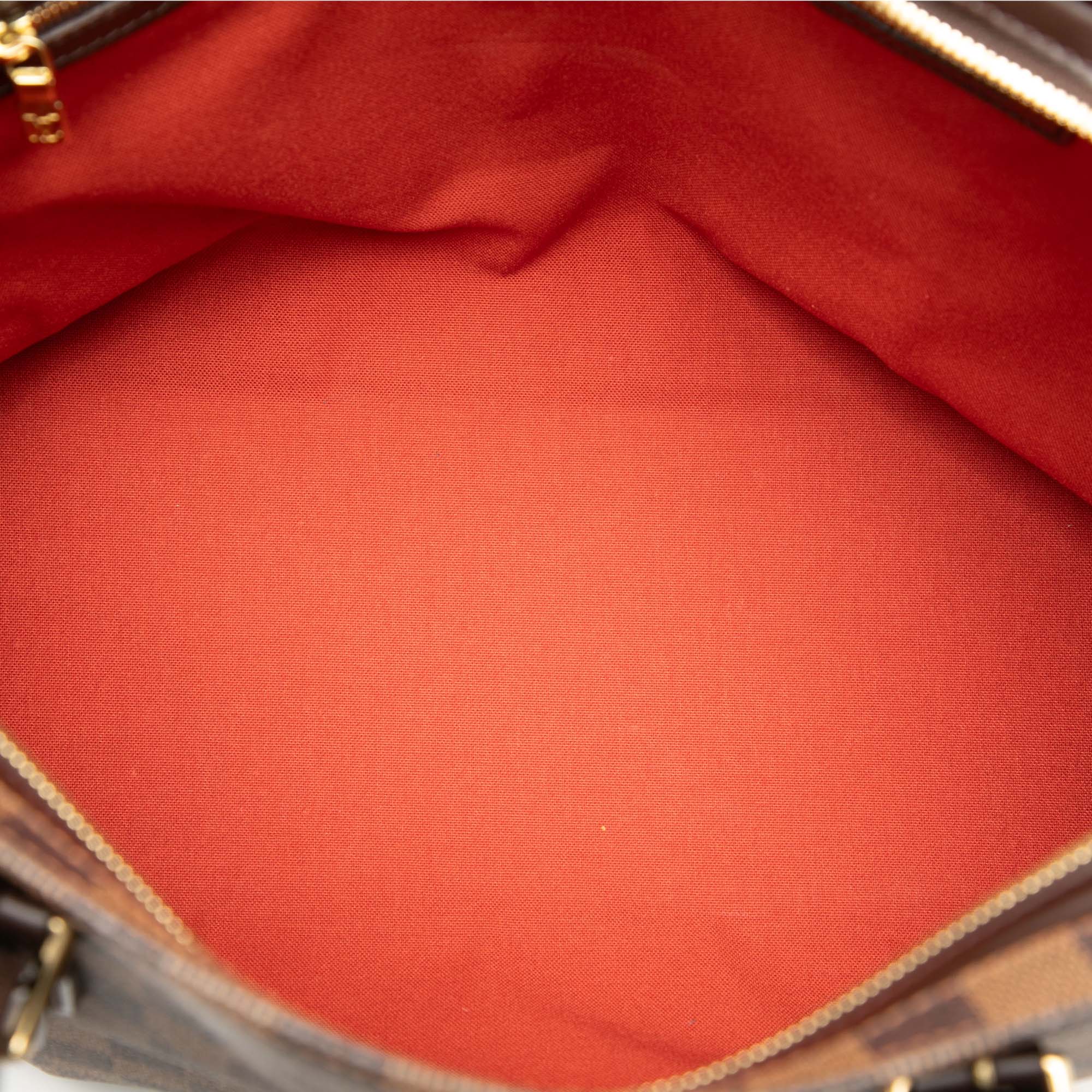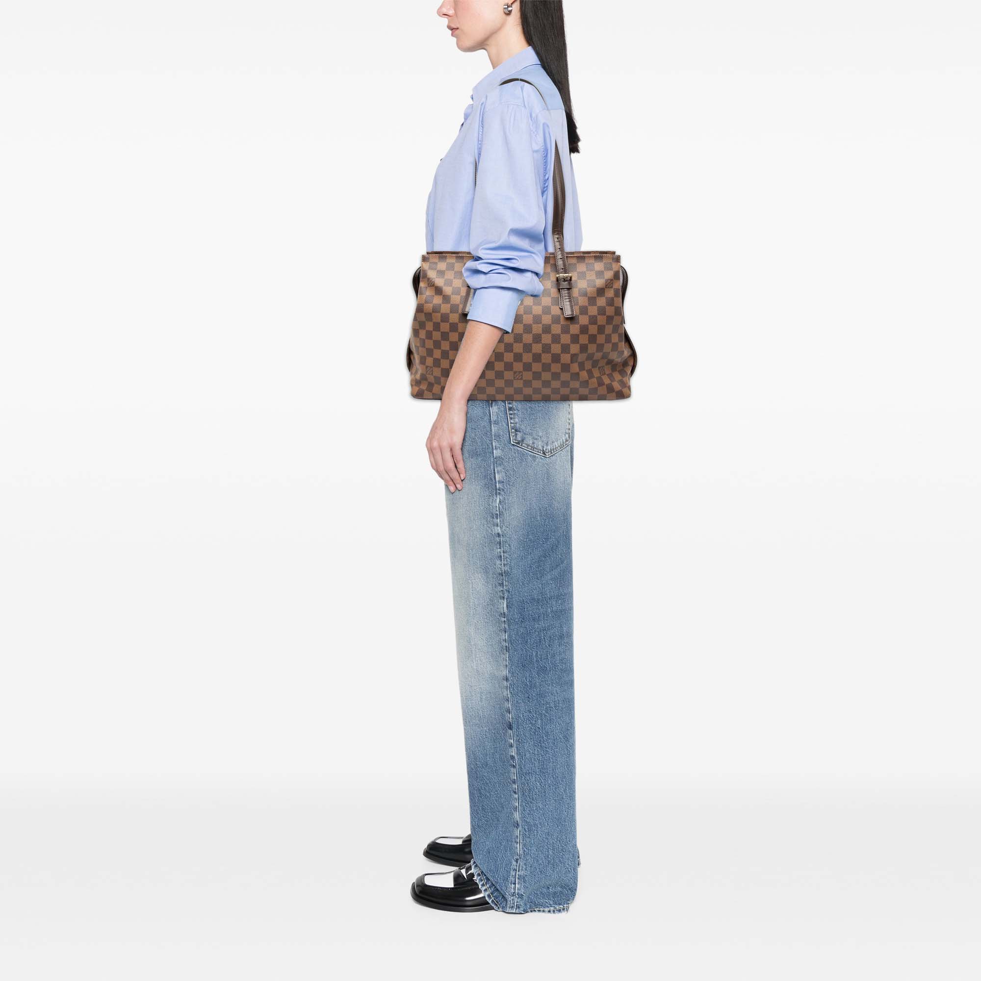 The Chelsea features a damier ebene canvas body with leather trim, flat leather shoulder straps, top zip closures, and an interior zip pocket. Retail Price: 1395.00