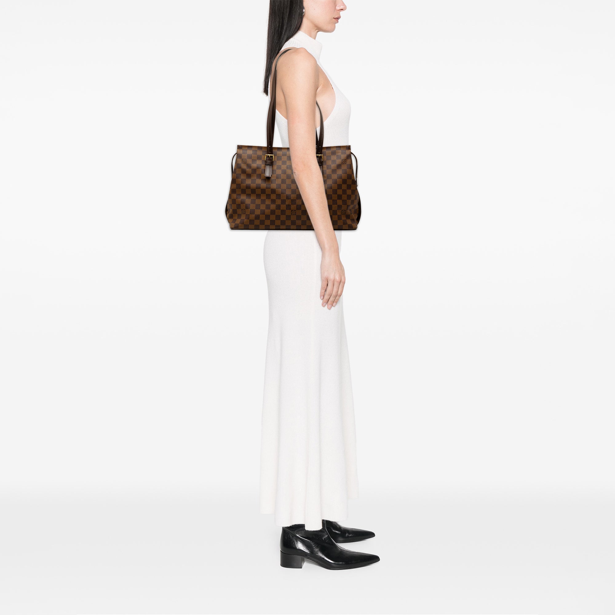 The Chelsea features a damier ebene canvas body with leather trim, flat leather shoulder straps, top zip closures, and an interior zip pocket. Retail Price: 1395.00