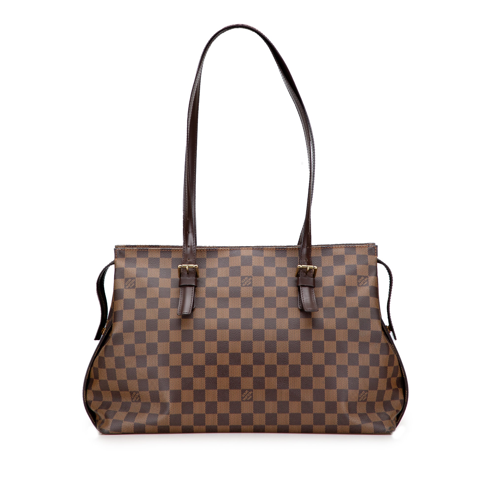The Chelsea features a damier ebene canvas body with leather trim, flat leather shoulder straps, top zip closures, and an interior zip pocket. Retail Price: 1395.00