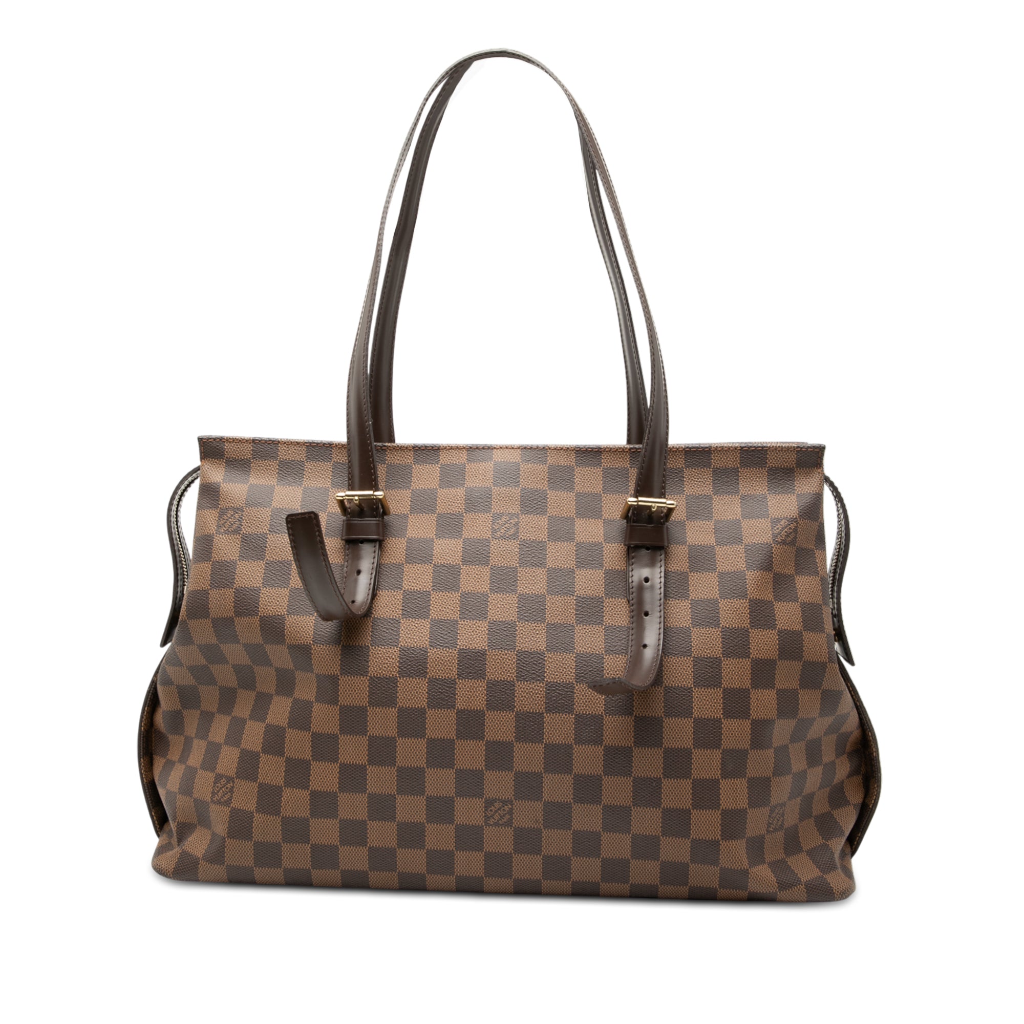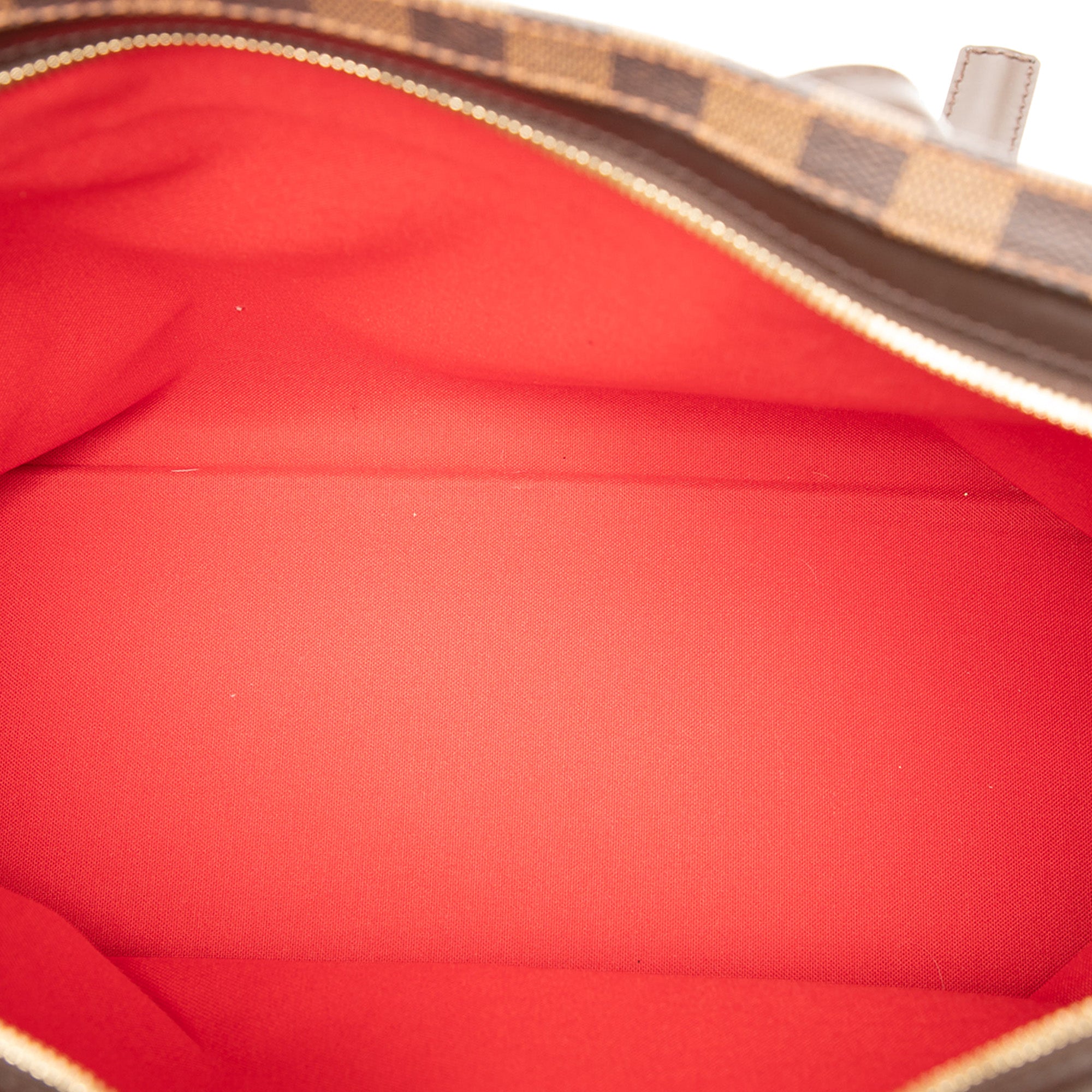 The Chelsea features a damier ebene canvas body with leather trim, adjustable flat leather shoulder straps, a two-way top zip closure, and an interior zip pocket. Retail Price: 1395.00